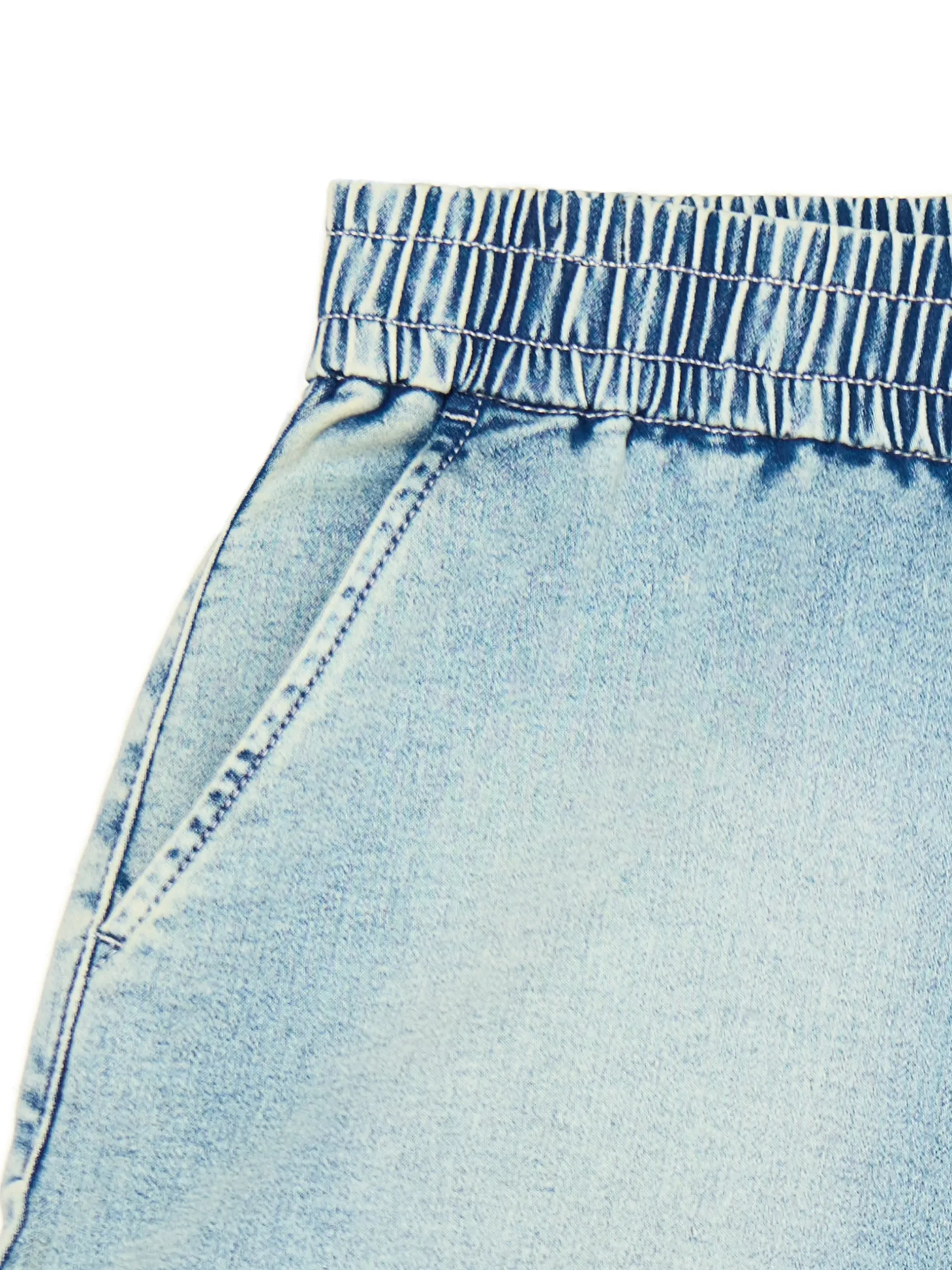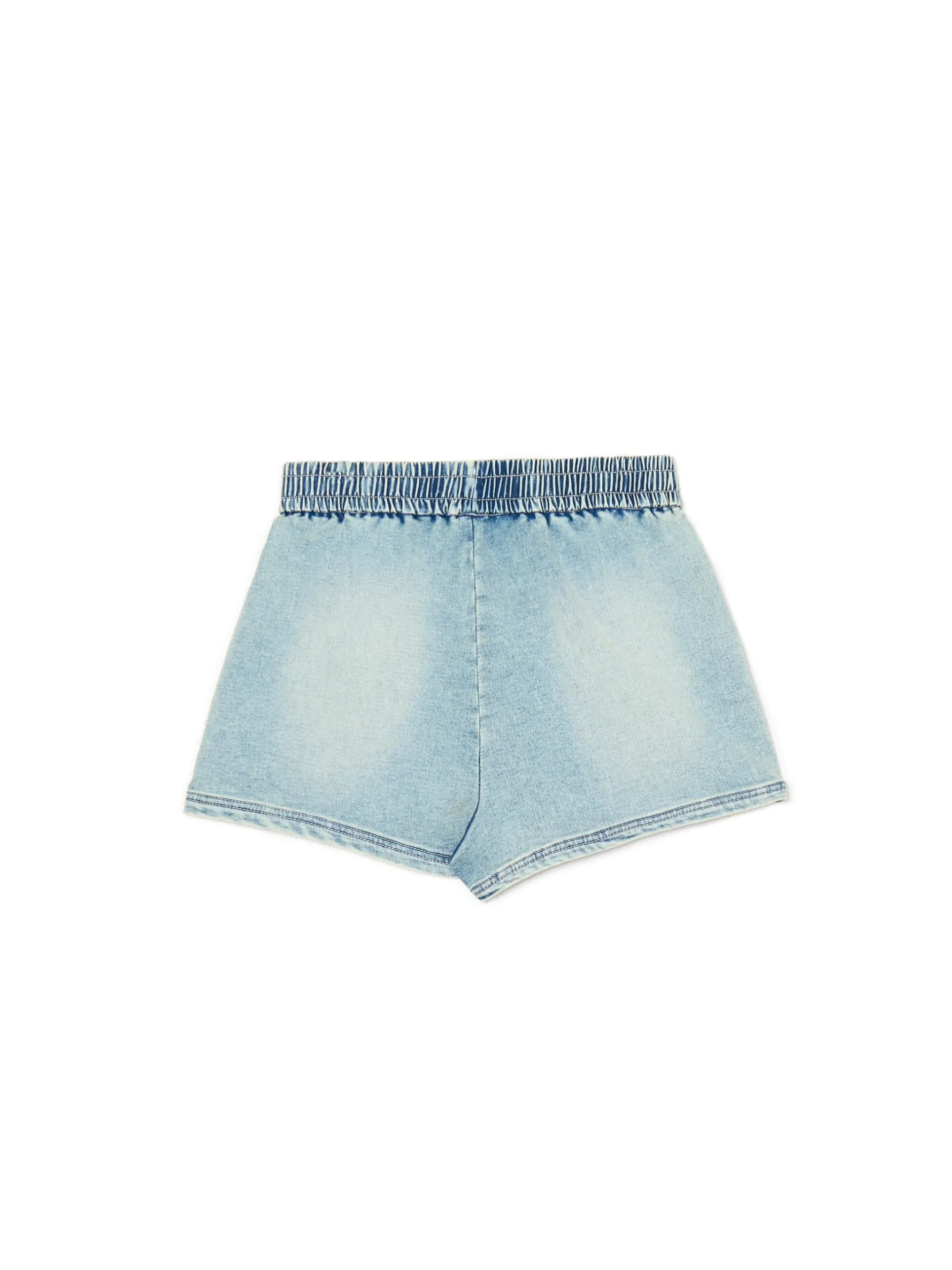 Damskie jeansowe szorty typu bermudy, uszyte z bawełny z elastyczną gumką w pasie i delikatnym efektem sprania na nogawkach. Dobierz do nich ulubione buty i na miasto! denim o klasycznym kolorze z delikatnym efektem sprania krój typu bermudy elastyczna gumka w pasie krótkie nogawki dwie kieszenie z przodu delikatny efekt sprania