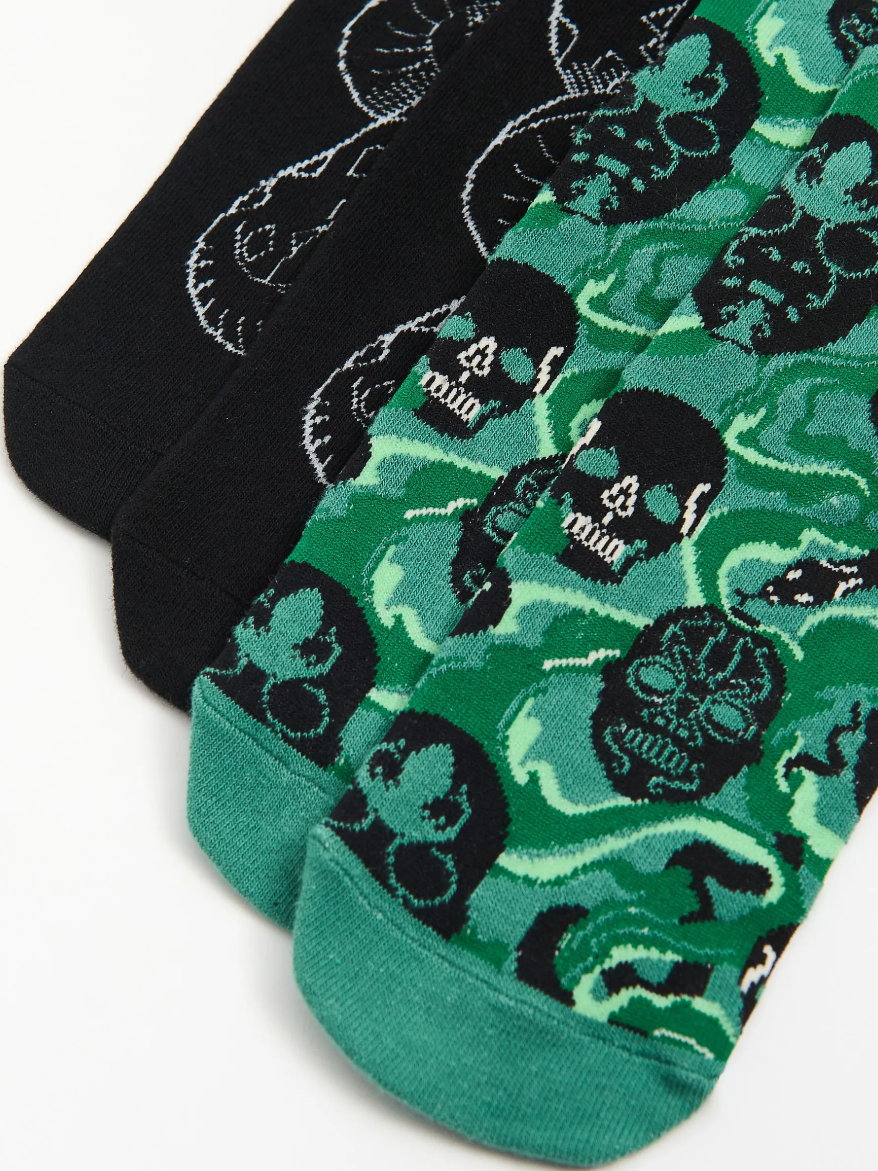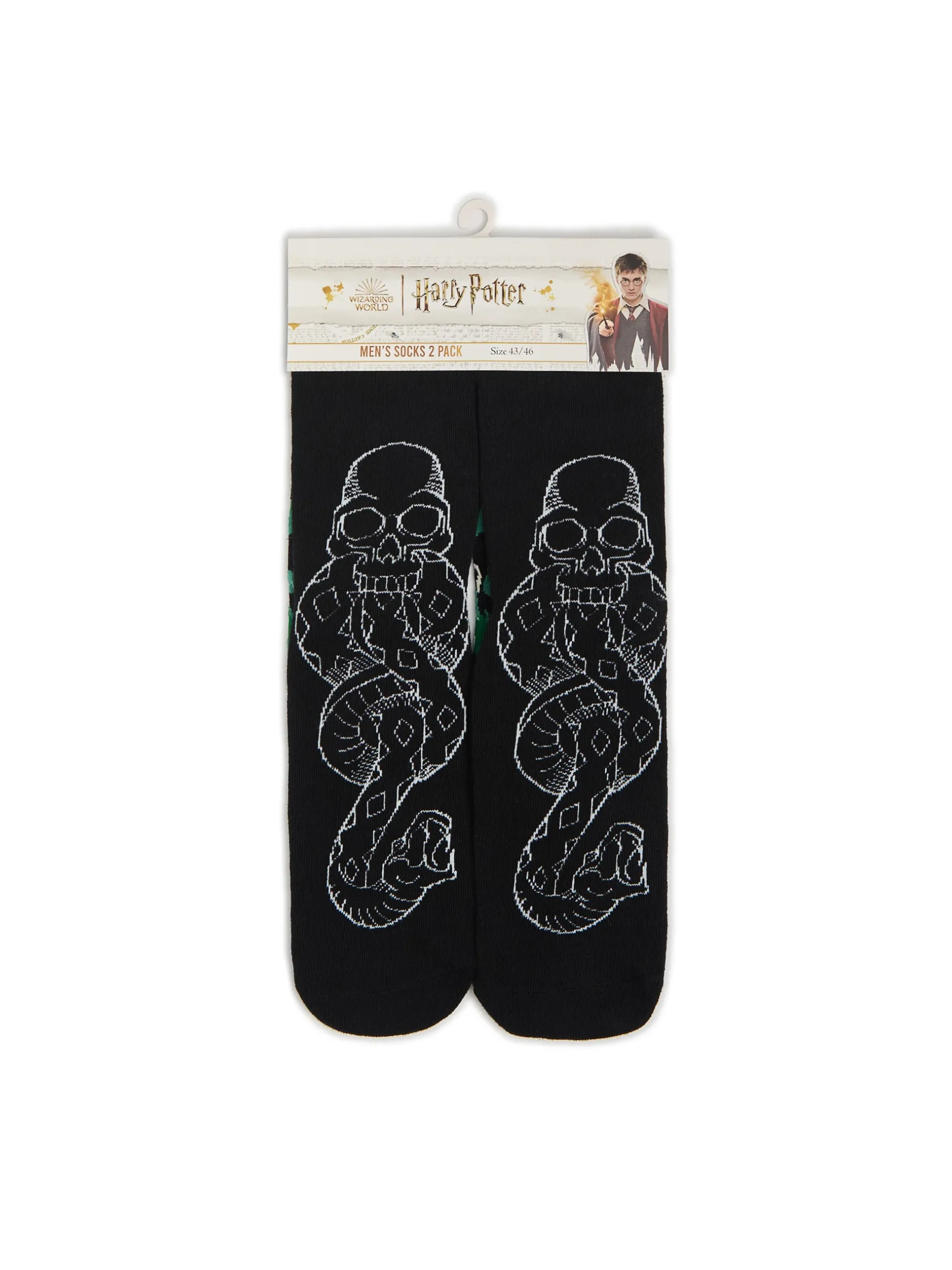 Zestaw dwóch par męskich skarpet z licencjowanymi nadrukami z serii Harry Potter. Uszyte z dzianiny zawierającej bawełnę, ozdobione motywami Slytherinu – jednego z 4 magicznych Domów Hogwartu. Zieleń to kolor, który Ślizgoni lubią najbardziej! dzianina zawierająca bawełnę dłuższy, prosty krój nadruk z motywem Harry Potter WIZARDING WORLD characters, names and related indicia are © & ™ Warner Bros. Entertainment Inc. WB SHIELD: © & ™ WBEI. Publishing Rights © JKR. (s24)