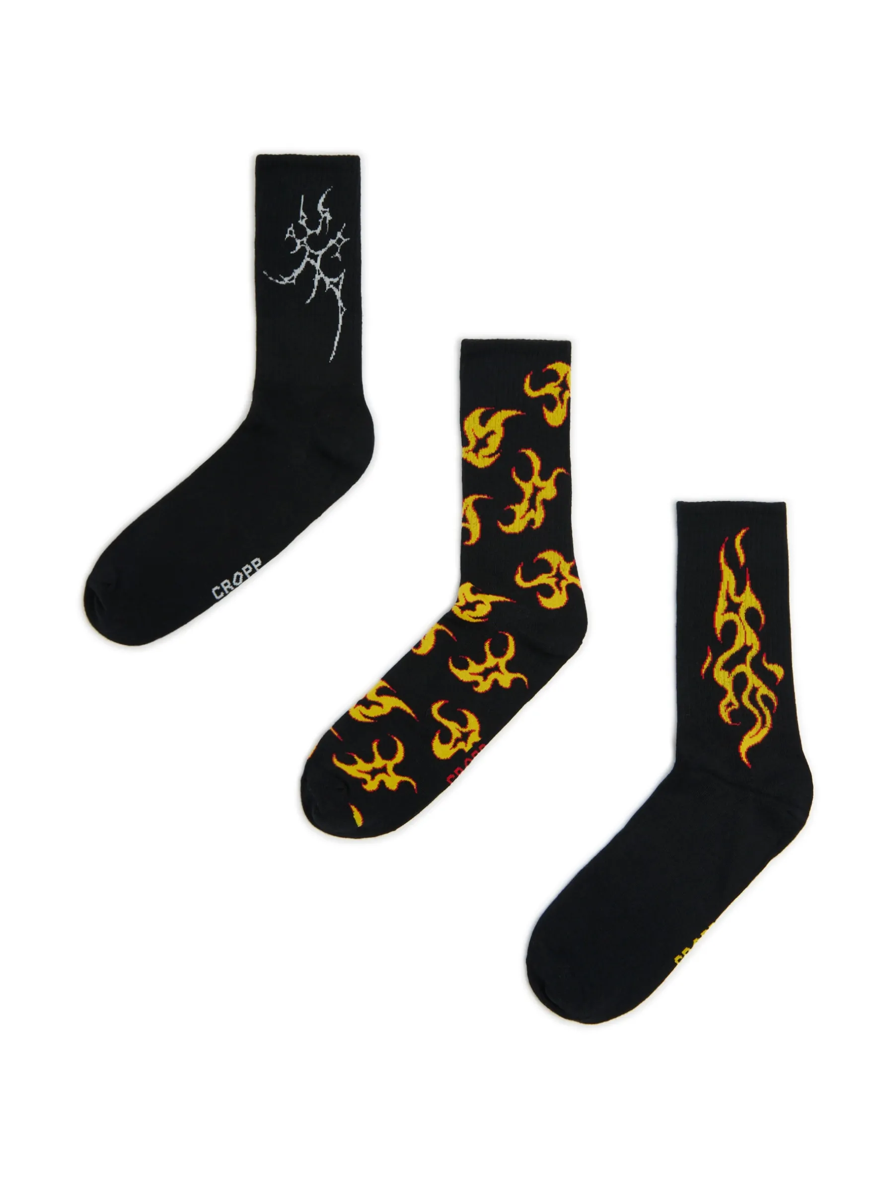 Zestaw trzech par męskich skarpet, uszytych z dzianiny o wysokiej zawartości bawełny. Każdy set w czarnym kolorze z motywem płomieni, miksuj dowolnie! dzianinowy materiał z bawełną dłuższy, prosty krój nadruk z motywem płomieni