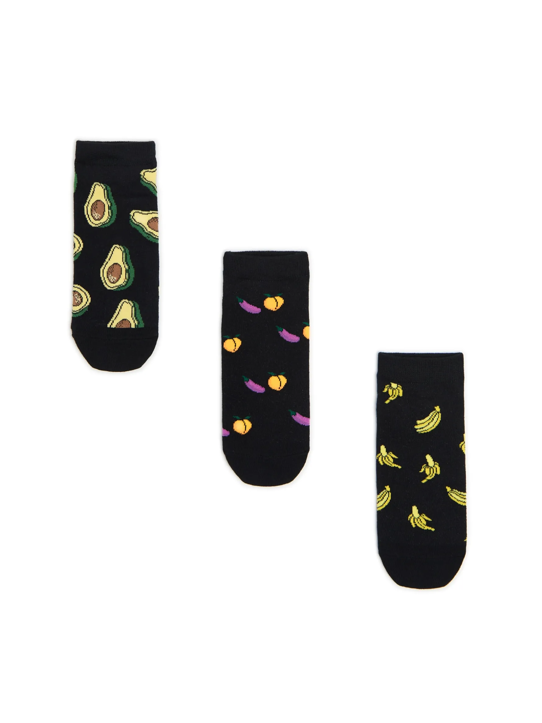 Zestaw 3 par męskich skarpet uszytych z mieszanki dzianin z bawełną w kolorze czarnym i oryginalnym printem dla prawdziwych foodies. dzianina z dodatkiem elastycznych włókien krótki krój nadruk all over