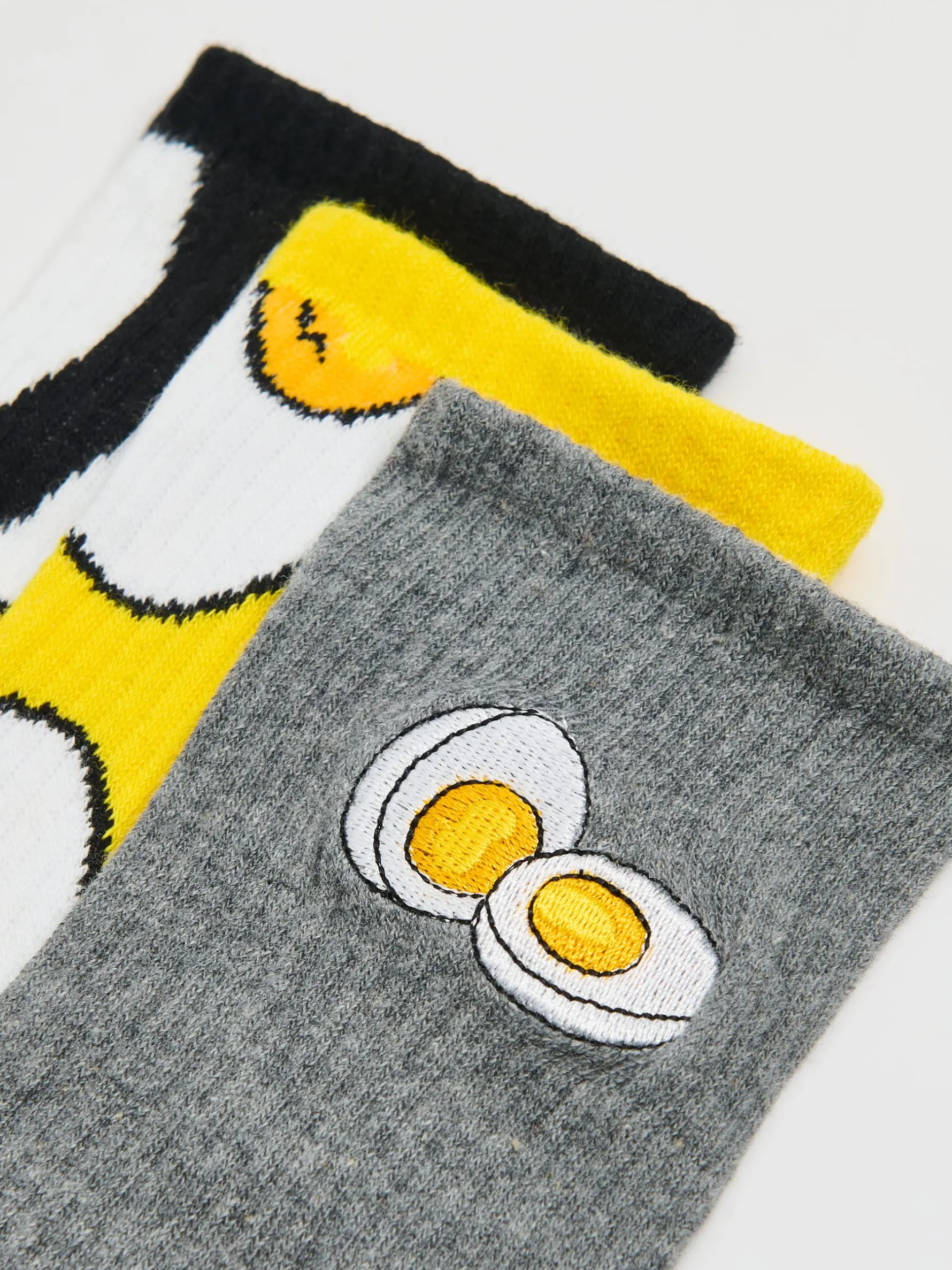 Zestaw męskich, długich skarpet uszytych z dzianiny o dużej zawartości bawełny. Modele w kolorach żółtym, szarym i czarnym z nadrukiem w kształcie sadzonych i ugotowanych jaj. Miksuj dowolnie! dzianinowy materiał z bawełną prosty krój nadruk all over