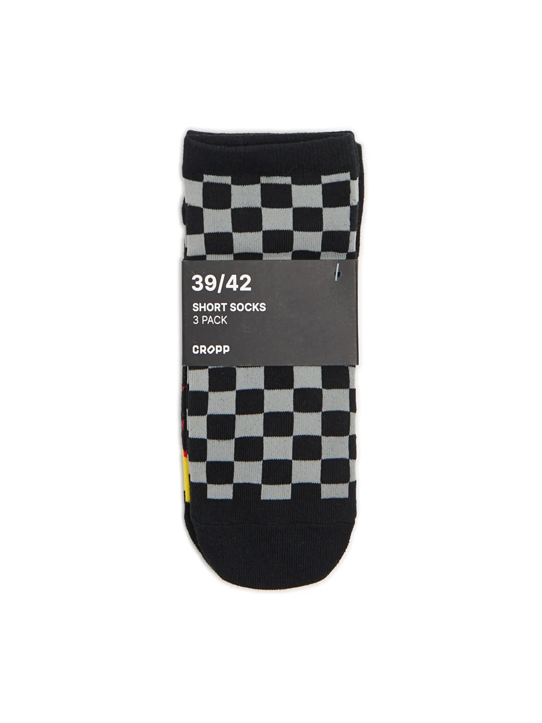 Zestaw 3 par męskich skarpet w czarnym kolorze o krótszym kroju. Oryginalne nadruki dopełnią Twoją stylizację! dzianina z dodatkiem elastycznych włókien krótki krój oryginalny print nadruki z imitacją płomieni, szachownicą i punkowym motywem kwiatowym