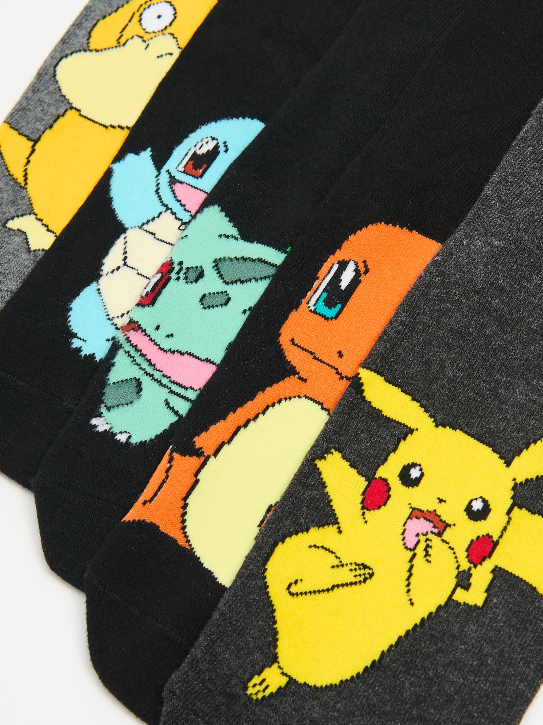 Zestaw pięciu par męskich skarpet uszytych z dzianiny z dodatkiem bawełny i elastycznych włókien. Na każdym secie nadruk z postaciami z kultowej serii Pokémon. Wybierz je wszystkie, miksuj dowolnie! dzianinowy materiał z bawełną dłuższy, prosty krój nadruk z motywem postaci Pokémon
