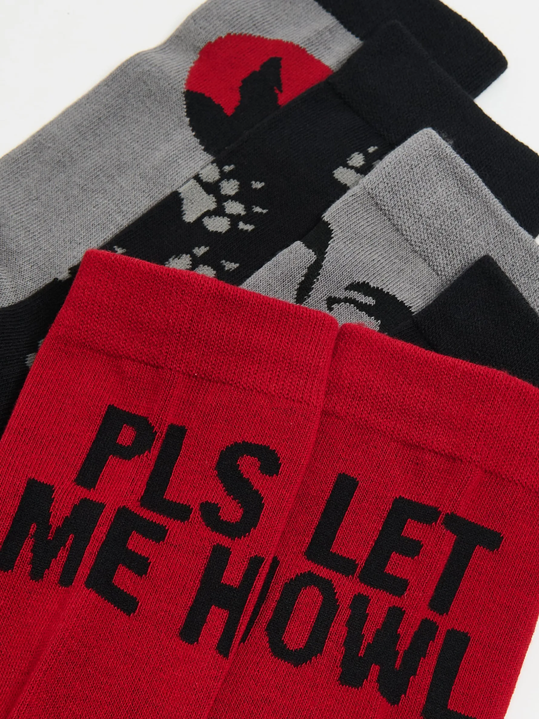 Zestaw pięciu par długich, męskich skarpet uszytych z mieszanki dzianin w kolorach czarnym, szarym i czerwonym. Na każdej z par nadruki z motywem wilka i brandowe napisy. dzianina z dodatkiem elastycznych włókien dłuższy, prosty krój zwierzęcy wzór