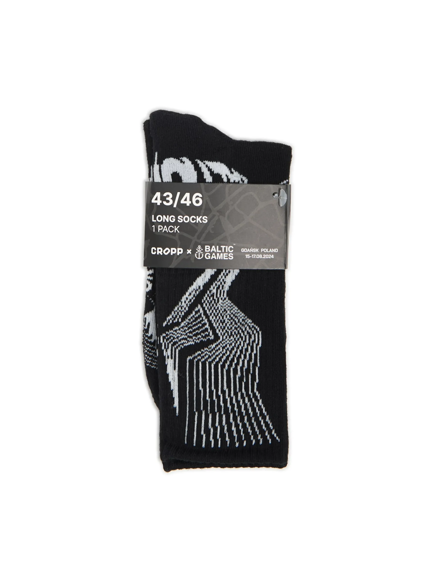 Jedna para długich męskich skarpet, uszytych z dzianiny o wysokiej zawartości bawełny. Ozdobione motywem logo Baltic Games.