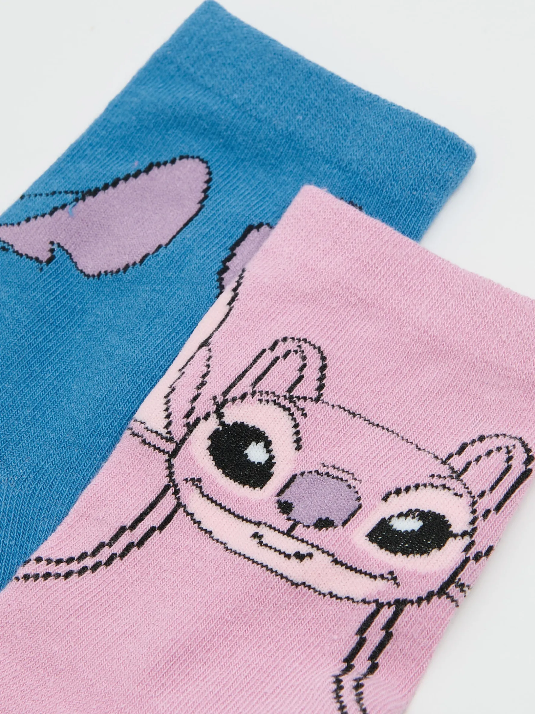Zestaw dwóch par damskich skarpet uszytych z dzianiny z dodatkiem bawełny i elastycznych włókien. Na każdym secie nadruk z bohaterami z serii Disney. Połącz w parę Stitcha i Angel! dzianinowy materiał z bawełną dłuższy, prosty krój nadruk Lilo & Stitch