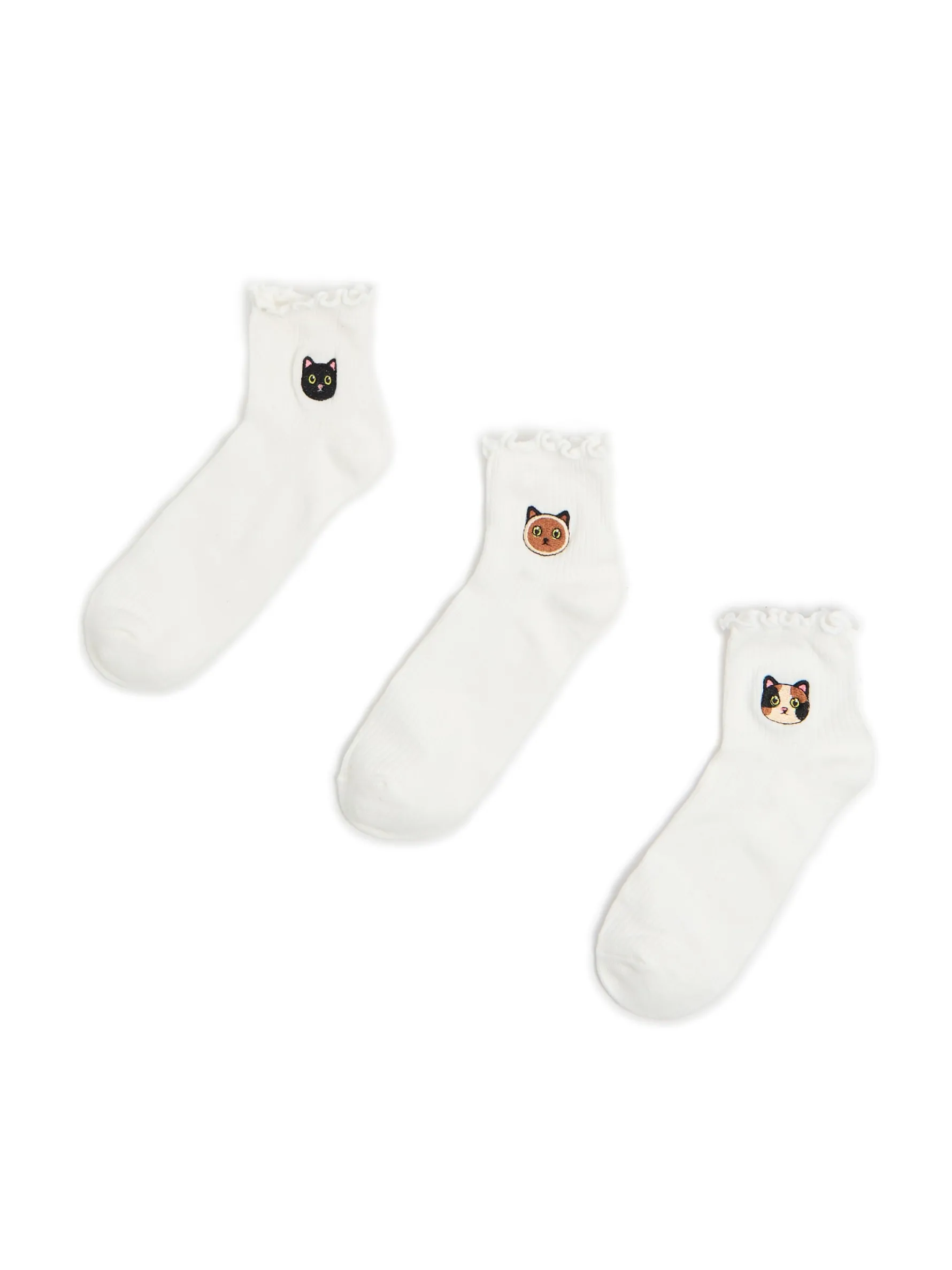 Trójpak damskich skarpetek o średniej długości, uszytych z dzianiny o wysokiej zawartości bawełny, wykończonych falbanką. Na każdej parze haft z uroczym kotkiem!