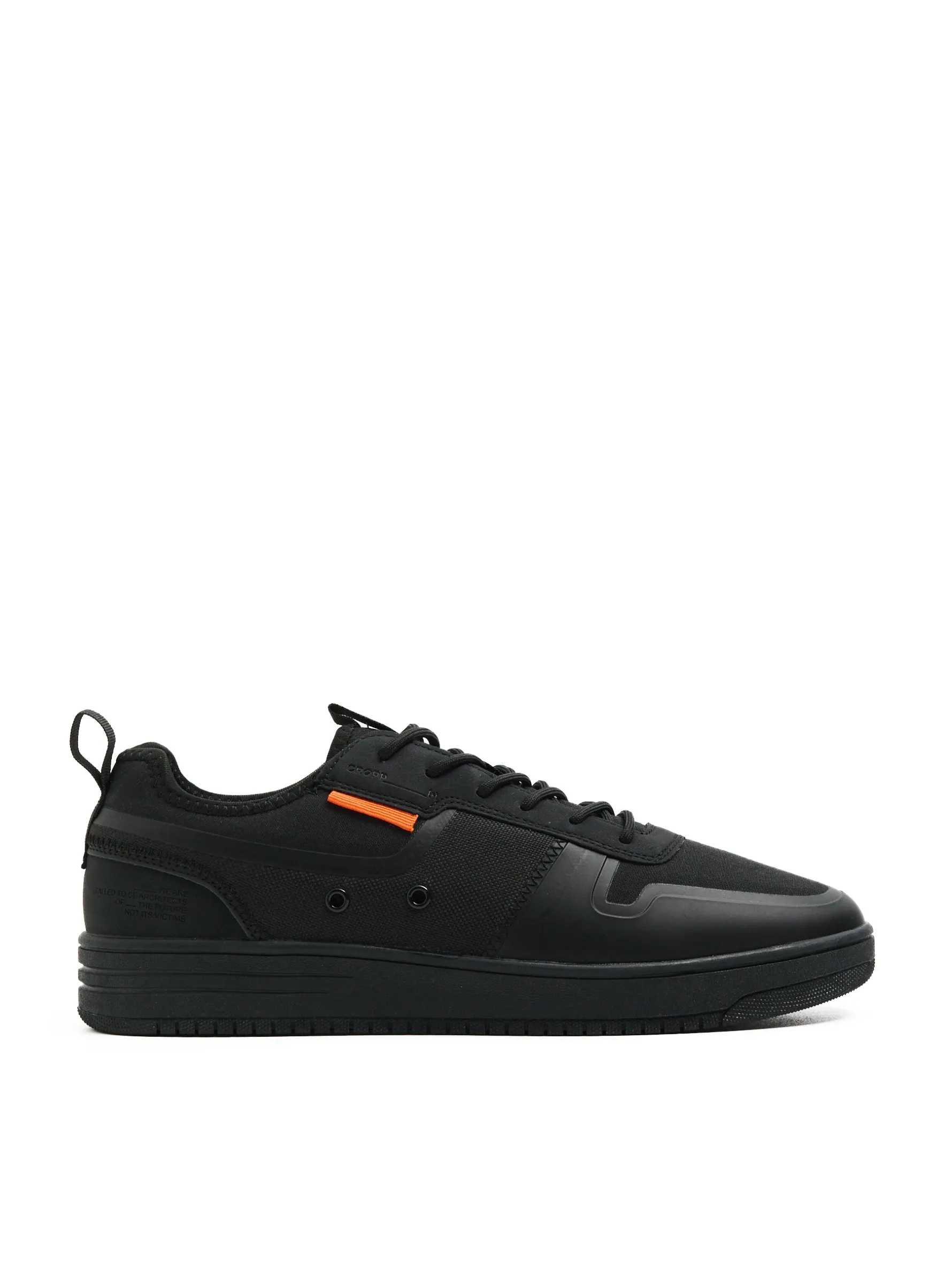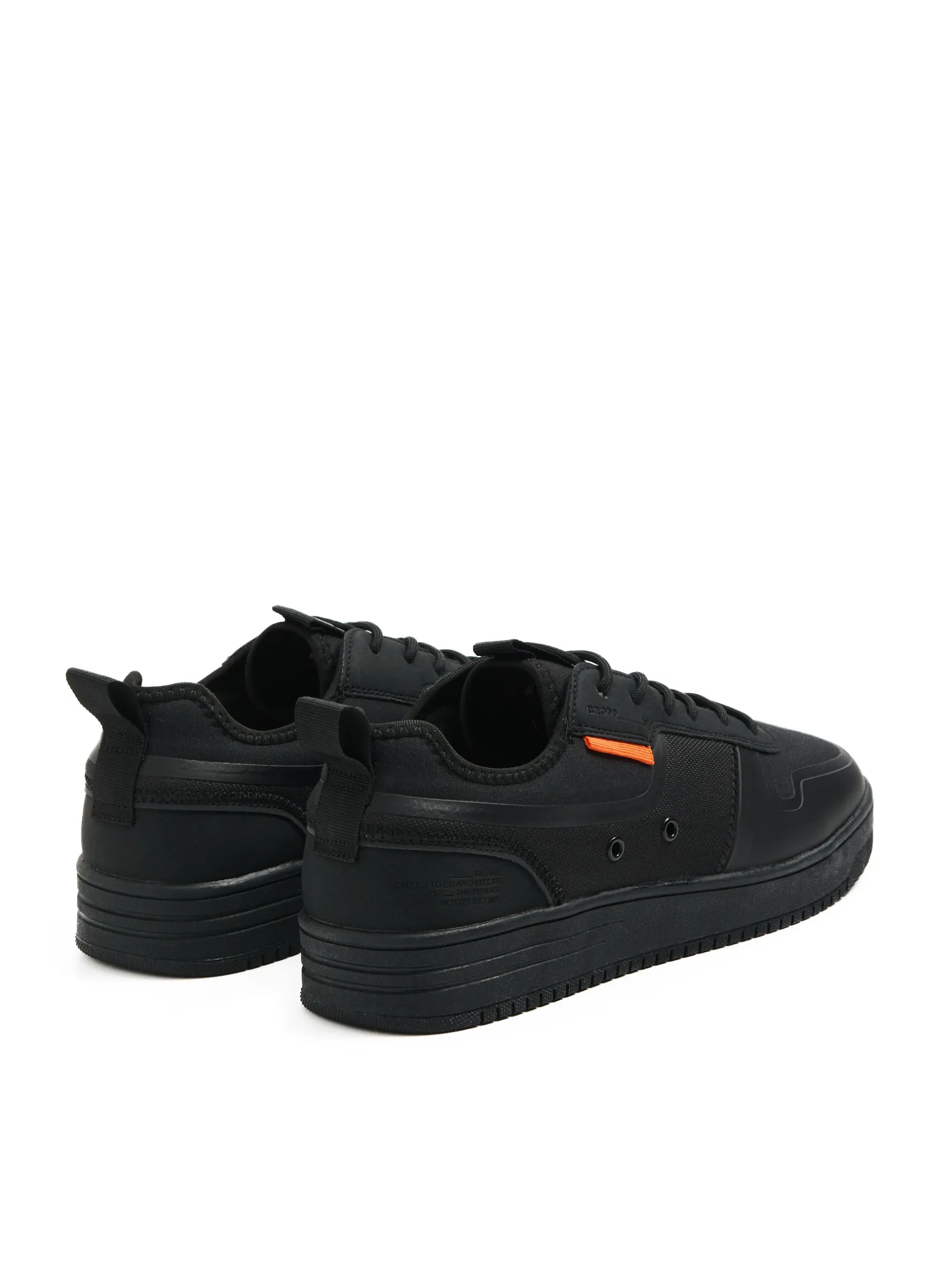 Sportowe męskie sneakersy uszyte z mieszanki tkanin w czarnym kolorze. Wyposażone w płaską podeszwę termoplastyczną o nieregularnym wzorze, która zapobiega ślizganiu się po powierzchni. lekkie sneakersy z łączonych materiałów sportowy fason wiązane na elastyczne, prążkowane sznurówki podeszwa z termoplastycznej gumy wygodne uchwyty do wkładania i zdejmowania butów ozdobne naszywki