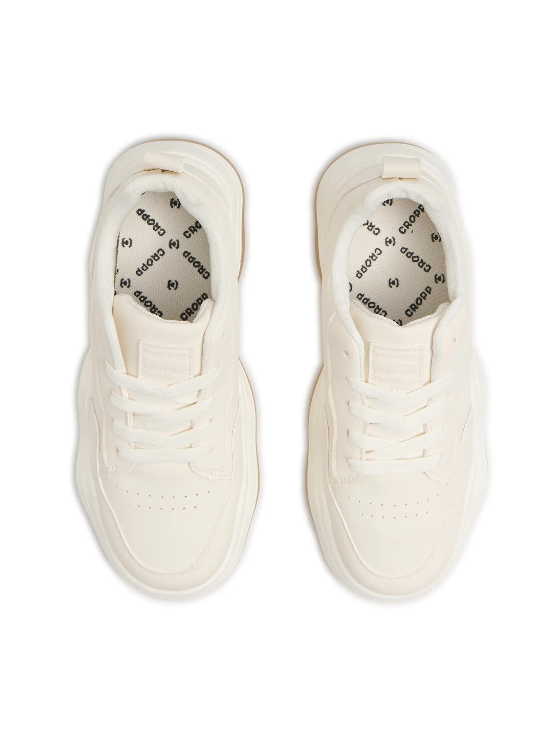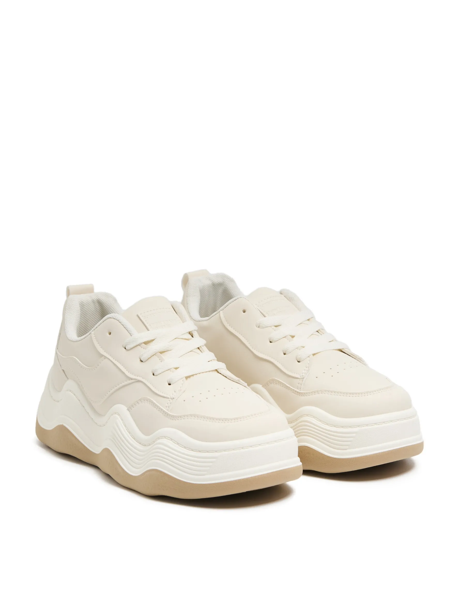 Damskie buty rekreacyjne w kolorze kremowym, wykonane z łączonych materiałów. Z wytrzymałą podeszwą o nietypowym kształcie fal, idealnie nadają się do różnego typu aktywności. elastyczna cholewka z łączonych materiałów wysoka, gruba podeszwa z gumy termoplastycznej wiązane na płaskie, białe sznurówki