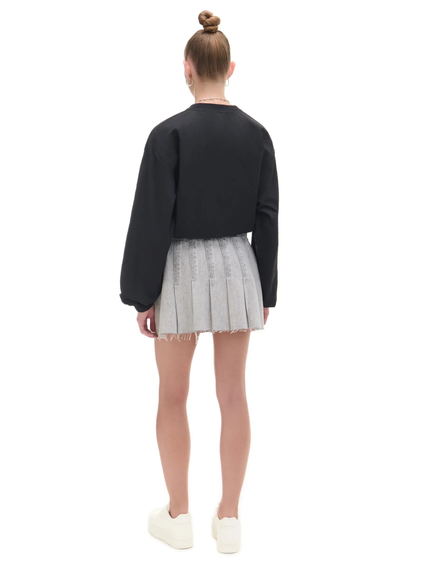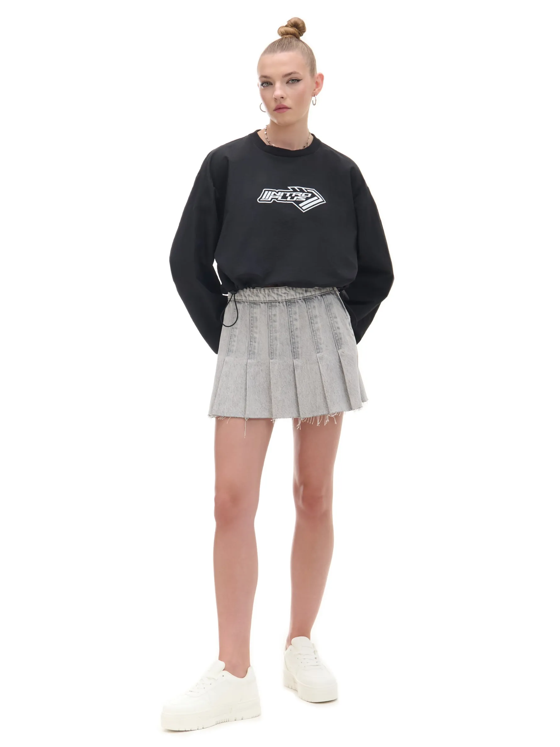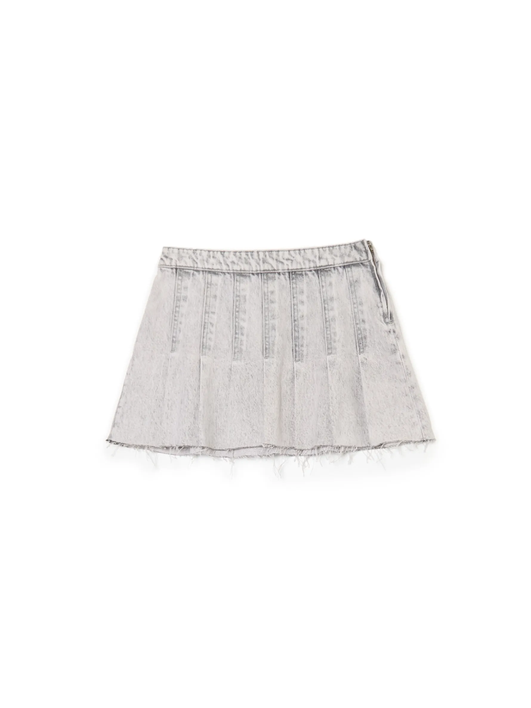 Spódnica damska o długości mini, uszyta w 100% z bawełnianej tkaniny. Ozdobne zakładki, postrzępienia i efekt sprania nadają jej streetowego vibe’u. denim o szarym odcieniu z delikatnym efektem sprania długość mini zapięcie na kryty zamek z boku plisy na całej długości ozdobne zakładki surowe wykończenie brzegów