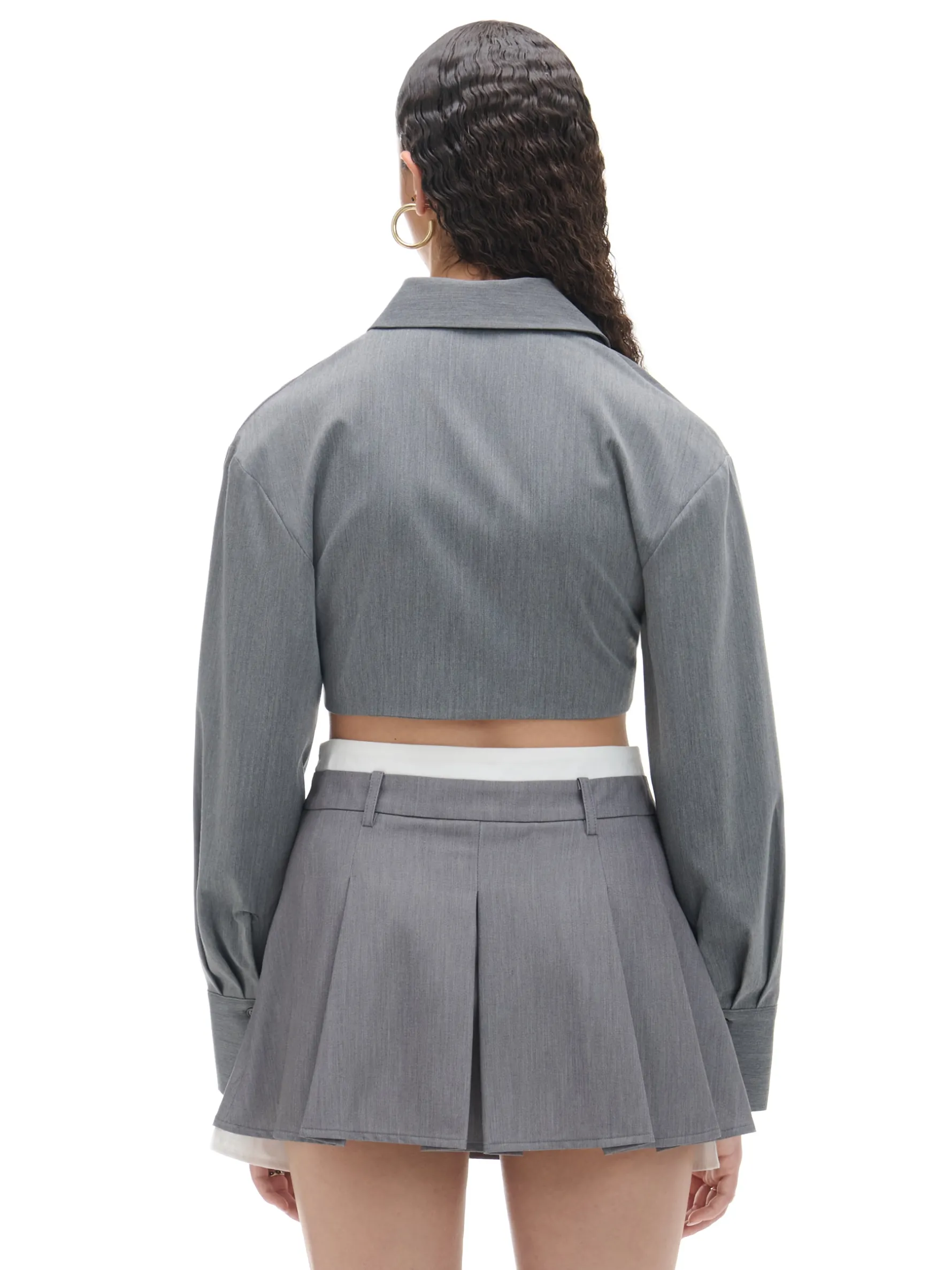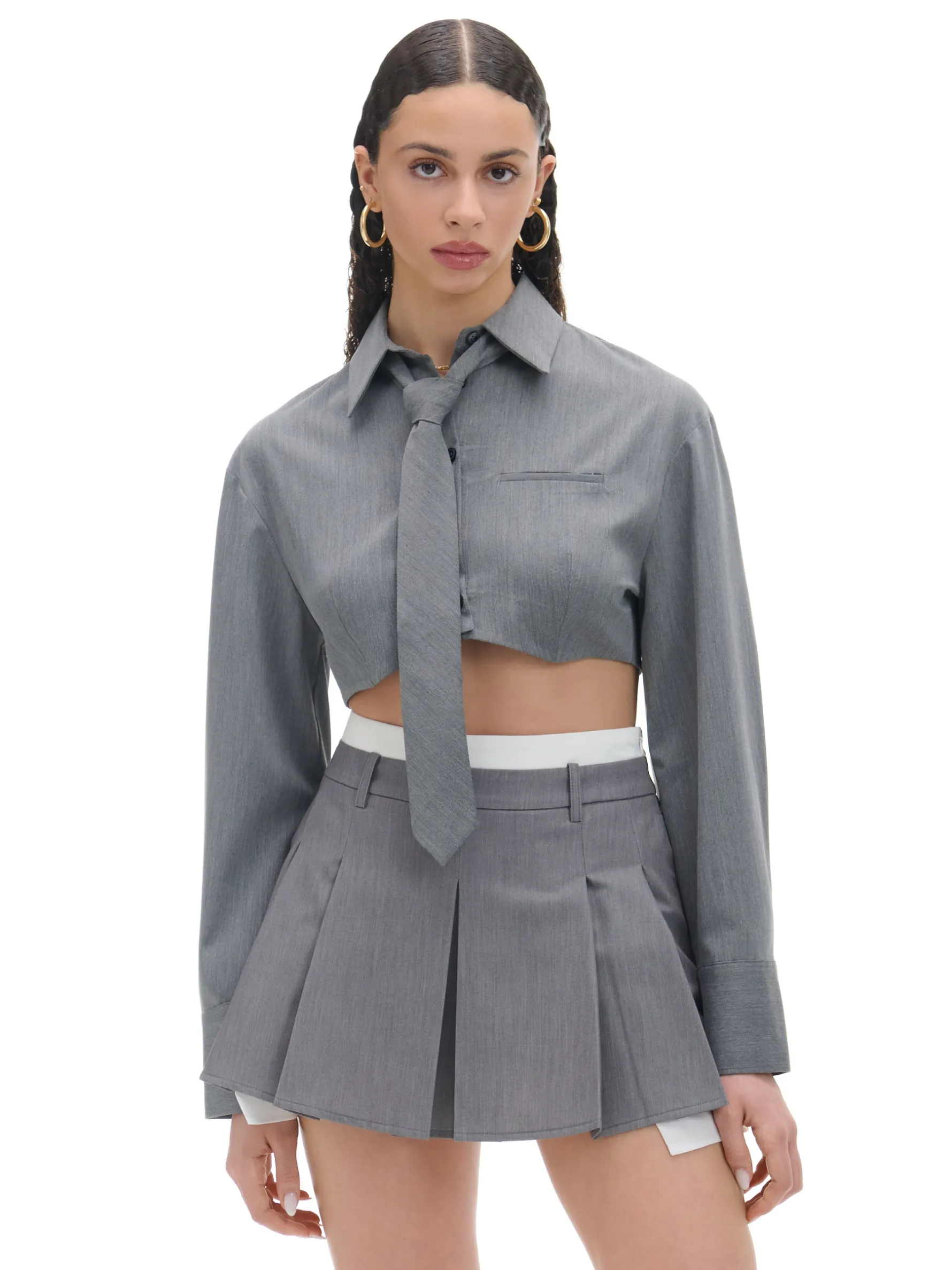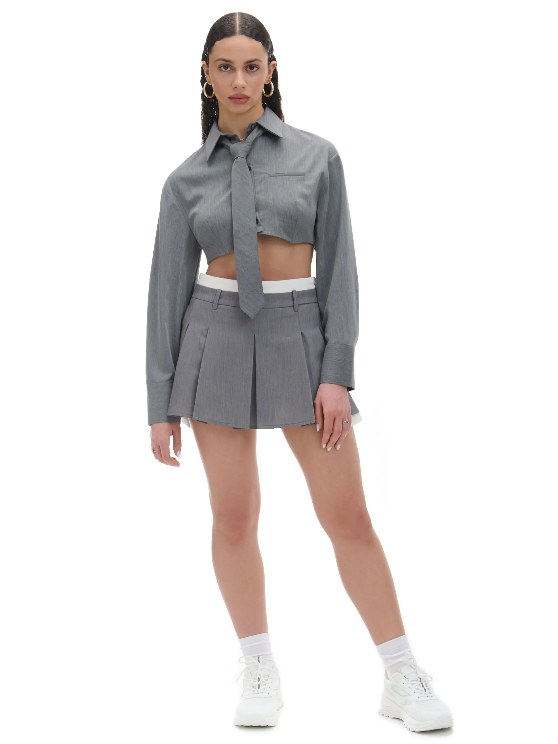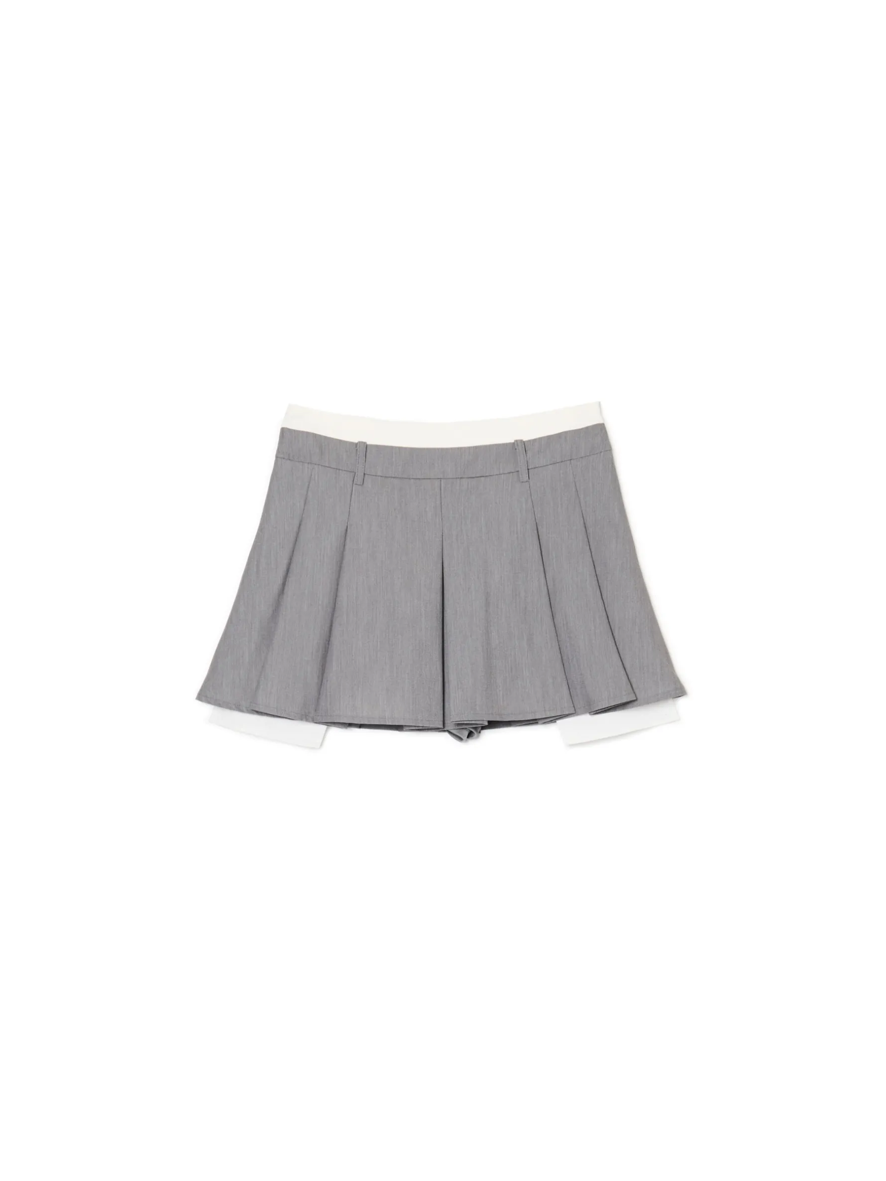 Spódnica mini w szarym kolorze z ozdobnymi plisami w stylu college’owym i dodatkowymi, białymi wstawkami. Idealna na co dzień: do szkoły, na uczelnię, do pracy. uszyta z dzianiny z domieszką elastycznych włókien krój mini z wysokim stanem zapinana na suwak z boku 2 klasyczne kieszenie z przodu ozdobne, szerokie plisy na całej szerokości materiału dodatkowe wstawki w kolorze białym Wzrost modelki: 170 cm