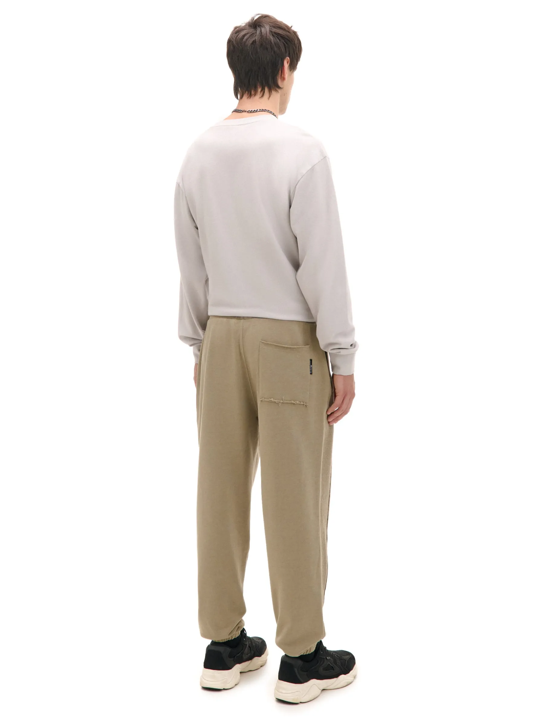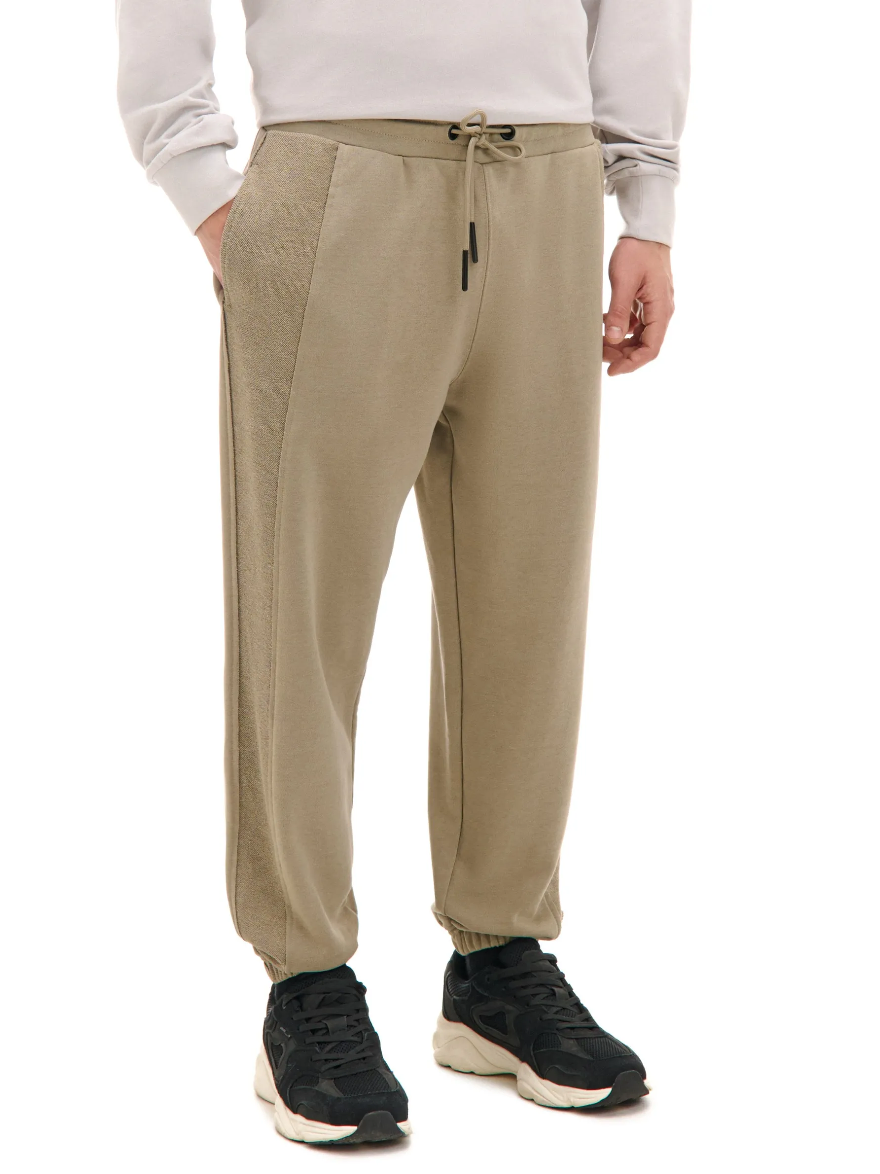 Męskie spodnie w beżowym kolorze, uszyte z mieszanki dzianin z dodatkiem bawełny french terry. W tym modelu ozdobne postrzępienia i lampasy na całej długości nogawek zwracają na siebie uwagę. dzianinowy materiał z bawełną wygodny krój comfort guma w pasie ze sznurkiem do regulacji dekoracyjne troczki z gładkiej tkaniny nogawka ze ściągaczem i lampasem dwie kieszenie z przodu naszywana kieszeń z tyłu ozdobne postrzępienia przy kieszeni