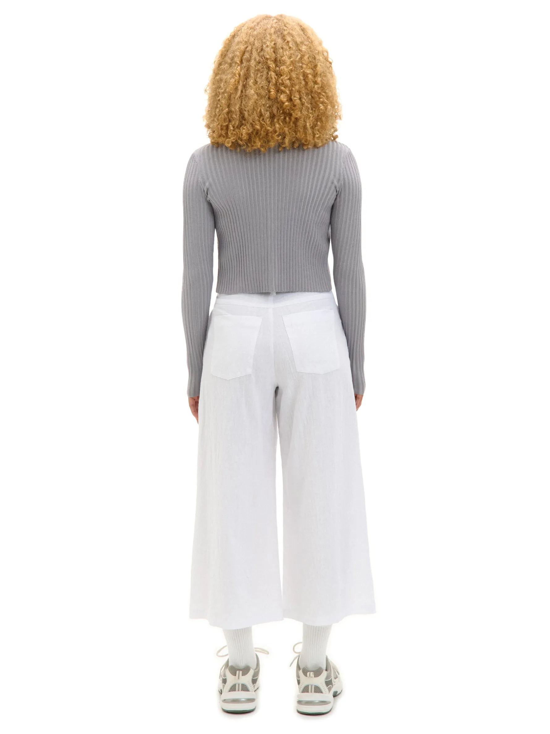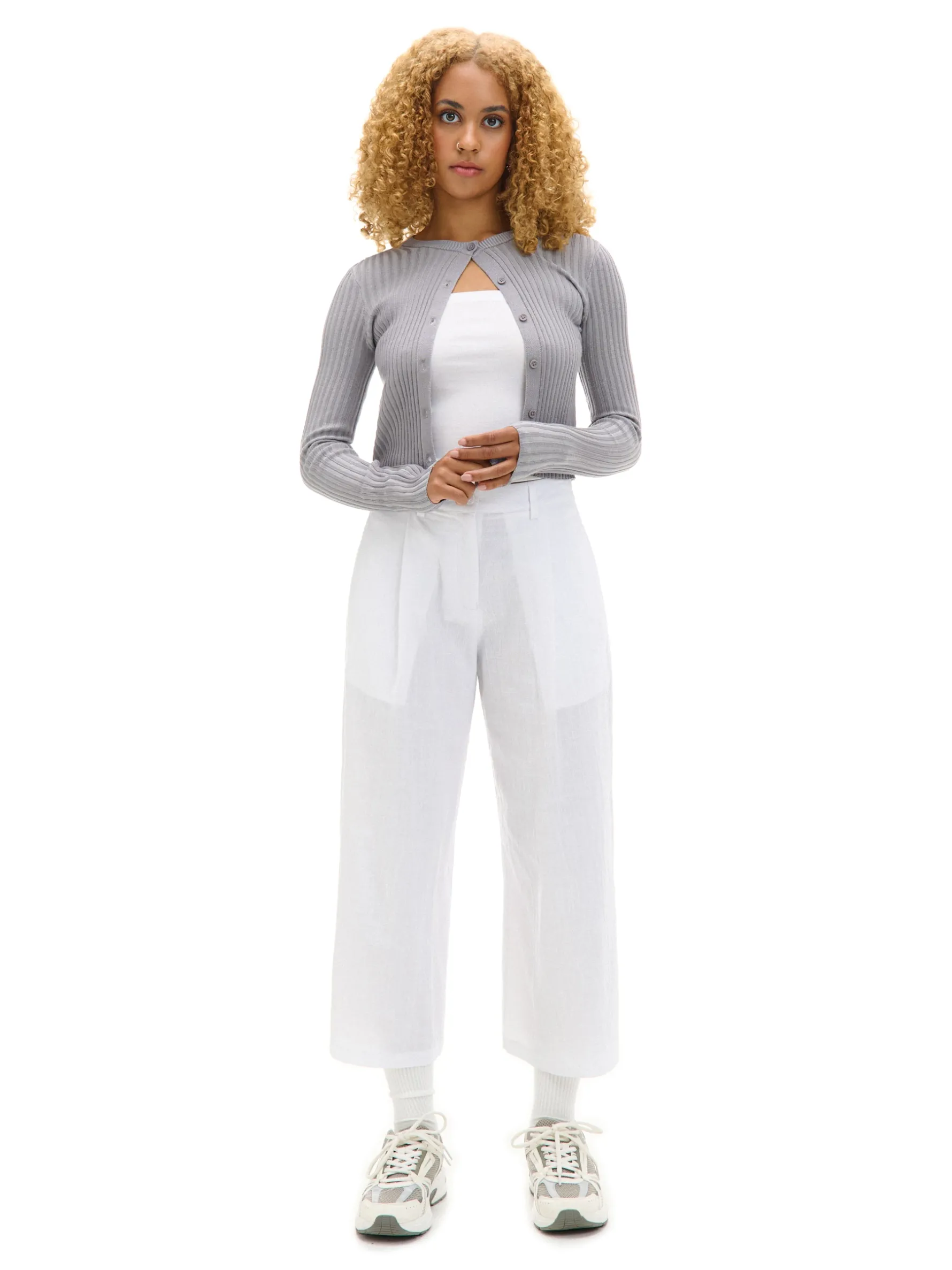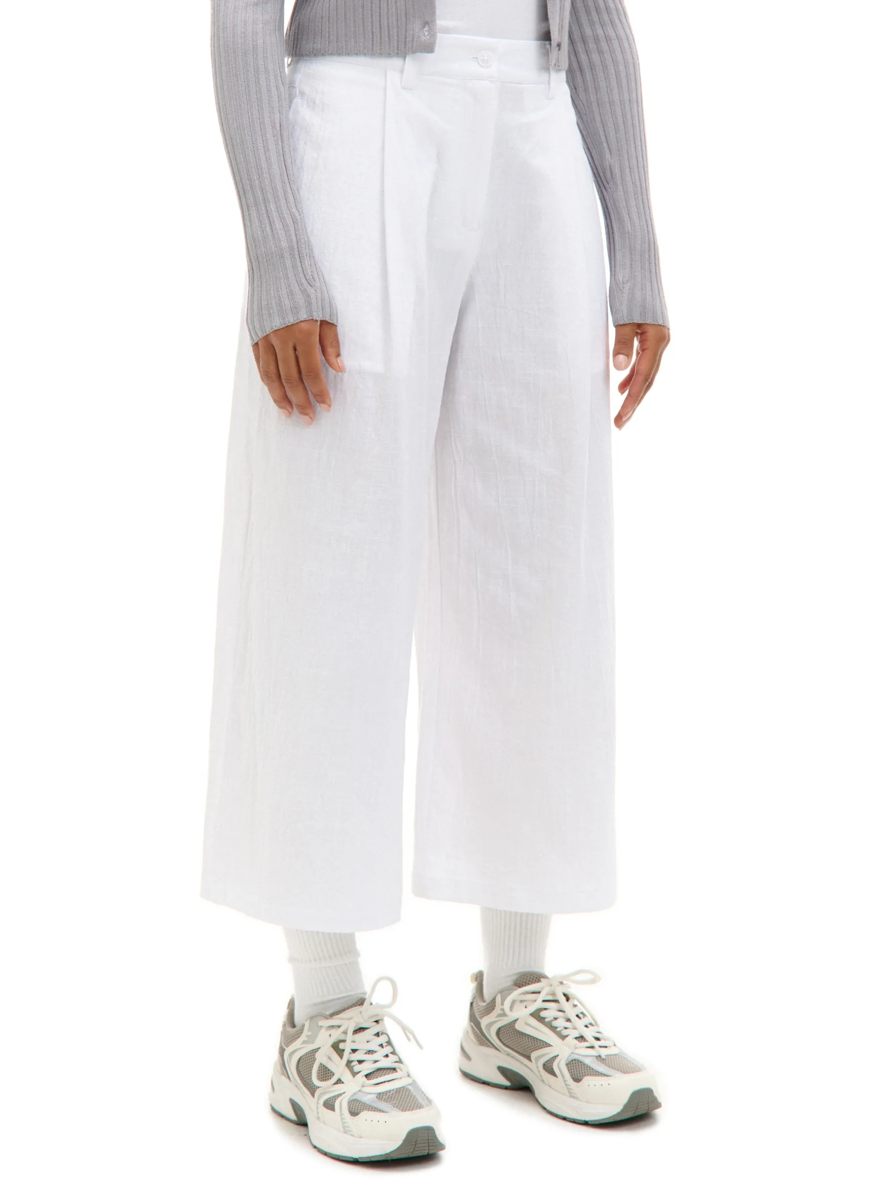 Tkaninowe damskie spodnie w kolorze białym, uszyte z bawełny. Kuloty są idealnym dodatkiem zarówno do eleganckich stylizacji, jak i casualowych. 100% bawełny spodnie typu kuloty zapięcie na zamek i guzik modelujące zakładki z przodu szerokie nogawki dwie kieszenie po bokach szlufki blisko siebie