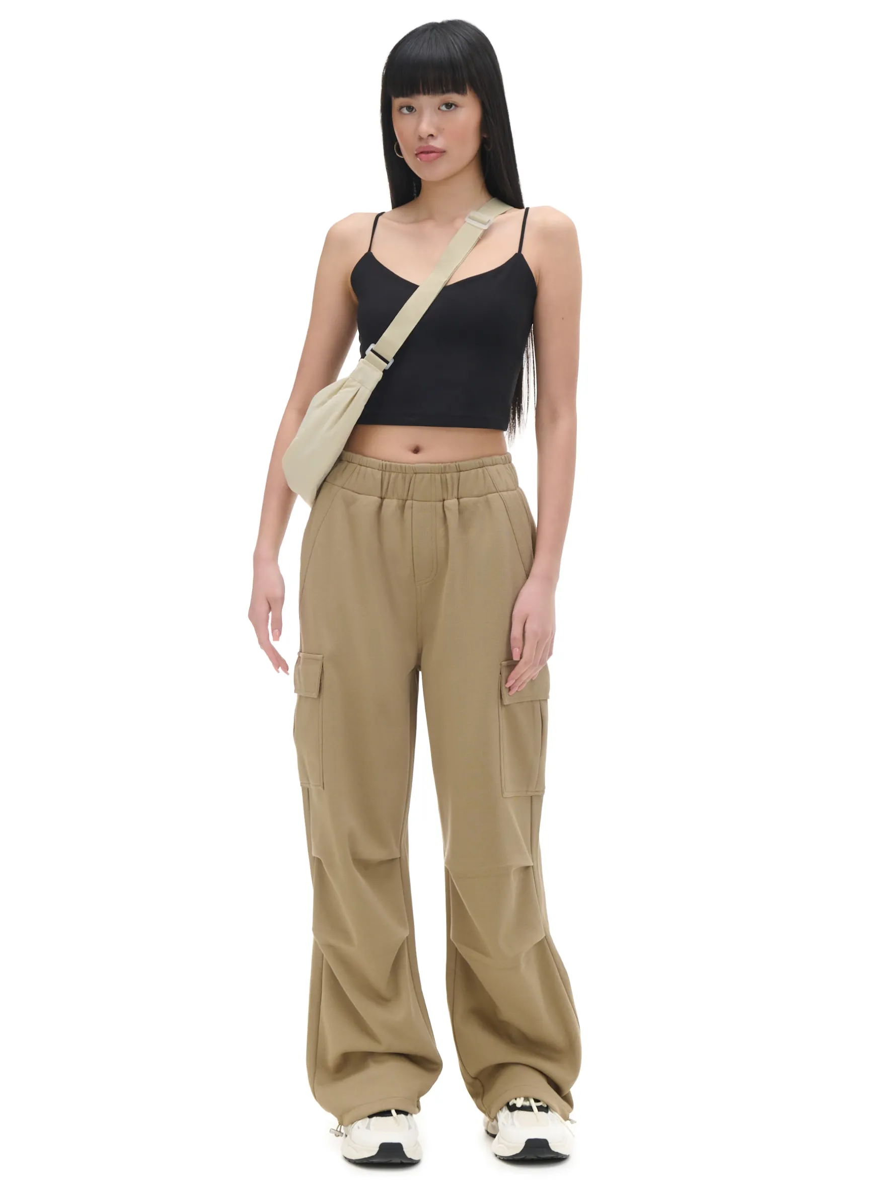 Te damskie spodnie typu cargo w letnim, bursztynowym kolorze wyróżnią Cię w tłumie. materiał z dużą zawartością bawełny luźny krój typu cargo ze ściągaczami uniwersalna gumka w pasie para klasycznych kieszeni i typu cargo na nogawkach ozdobna imitacja zapięcia zagięcia w wersji parachute na kolanach ozdobne taśmy przy kieszeniach Wzrost modelki: 168 cm