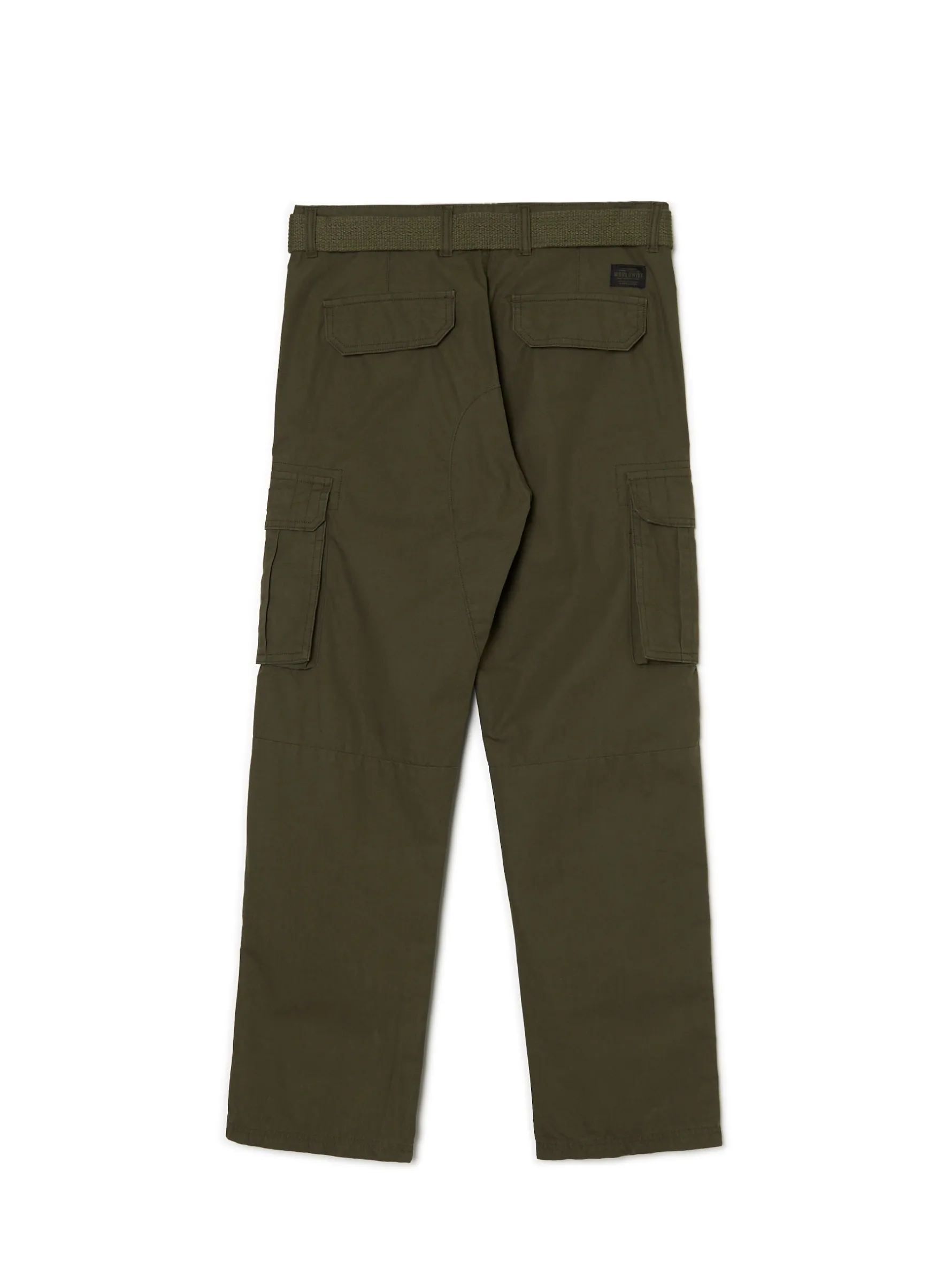 Męskie spodnie z paskiem, uszyte z ciemnozielonego materiału o stuprocentowej zawartości bawełny. wygodny krój comfort regularny stan, zapięcie na guzik i zamek sześć kieszeni, w tym dwie typu cargo z patkami poziome przeszycia w zestawie materiałowy pasek szlufki na pasek Wzrost modela: 184 cm