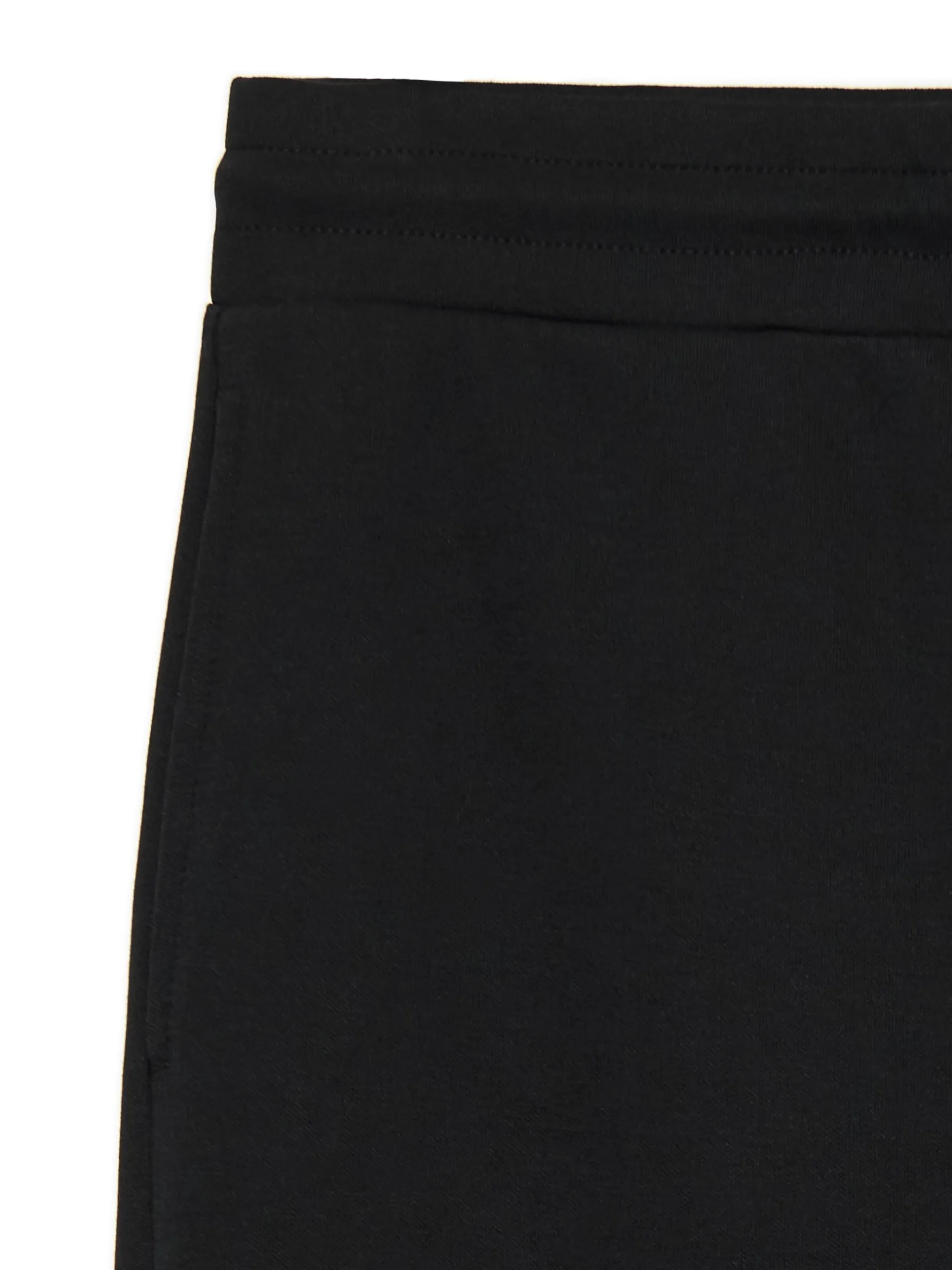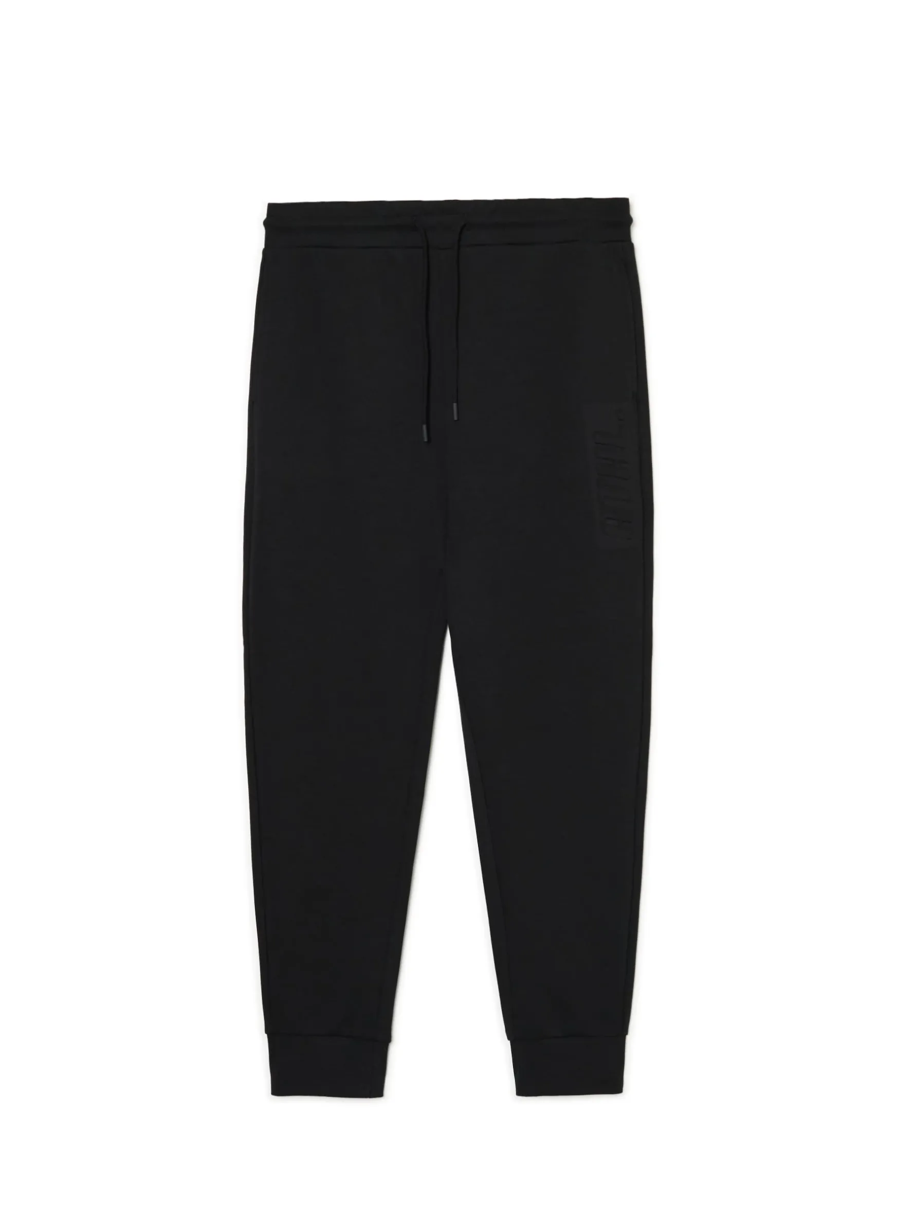 Czarne męskie spodnie dresowe, uszyte z podwójnej dżersejowej dzianiny zawierającej bawełnę. Niezawodny i trwały item do każdego rodzaju aktywności! dresowe spodnie typu jogger długie nogawki zwężane ku dołowi, wykończone ściągaczem gumka w pasie ze sznurkiem do regulacji otwarte kieszenie po bokach naszywana kieszeń z tyłu nadruk na nogawce z wykorzystaniem techniki emboss