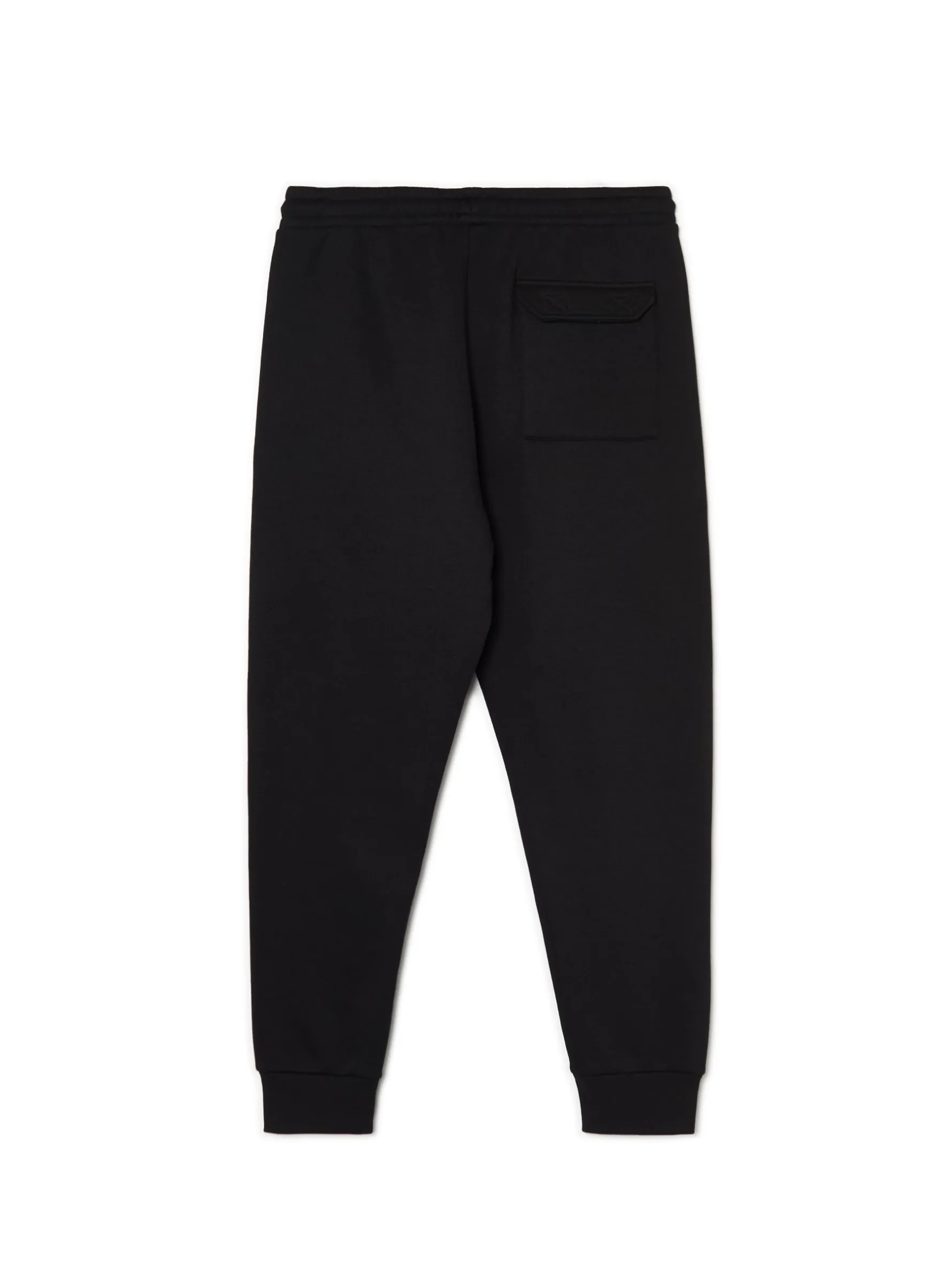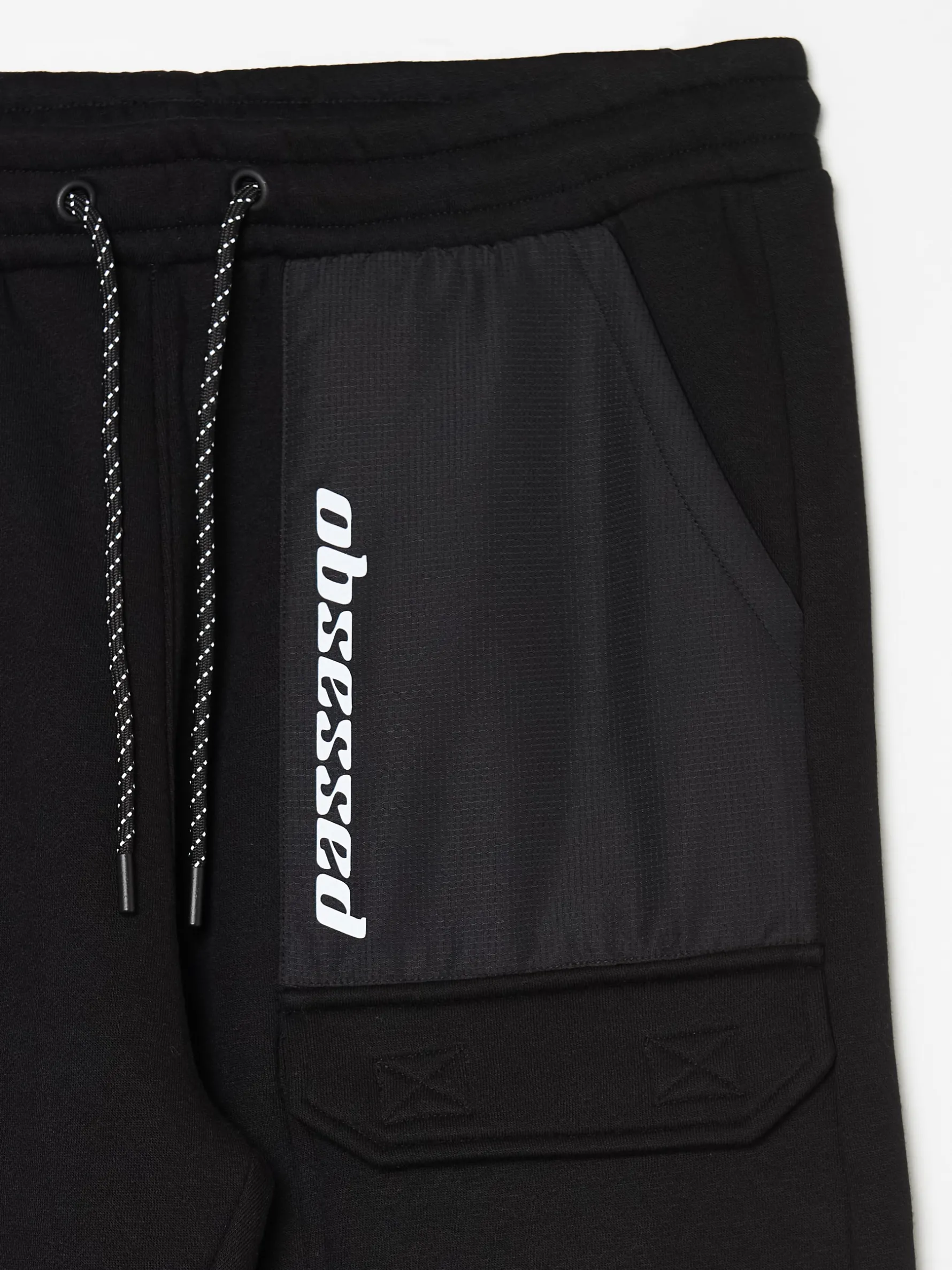 Dresowe spodnie męskie typu jogger, uszyte z mieszanki dzianin z bawełną. w pasie gumka i sznurek do regulacji liczne kieszenie, w tym kieszenie typu cargo nogawka ze ściągaczem i printem z efektem odblaskowym joggery dostępne w innym kolorze