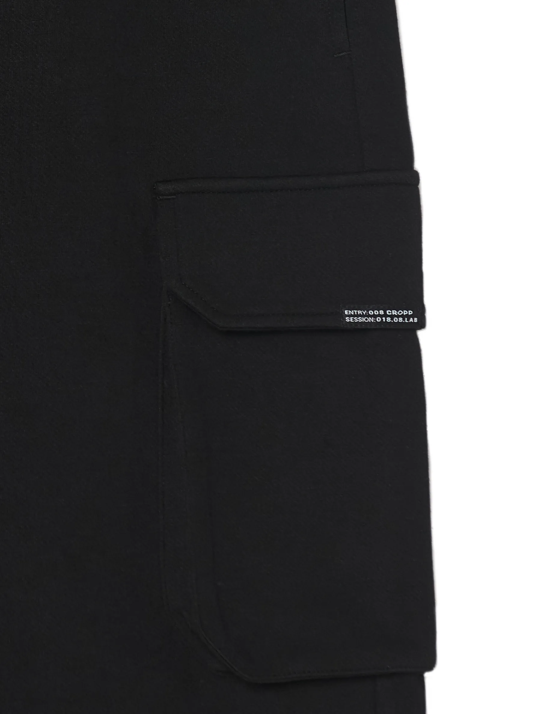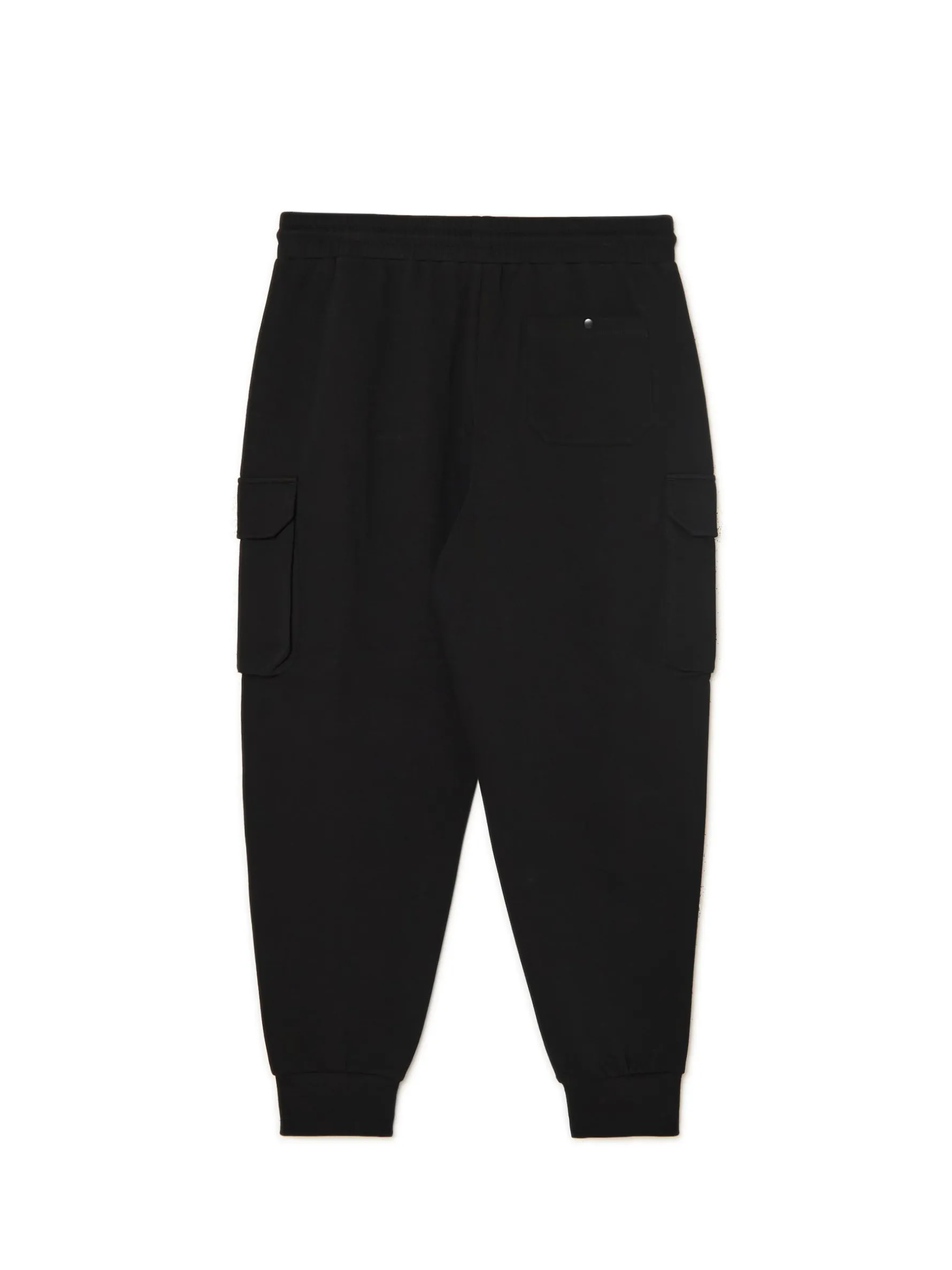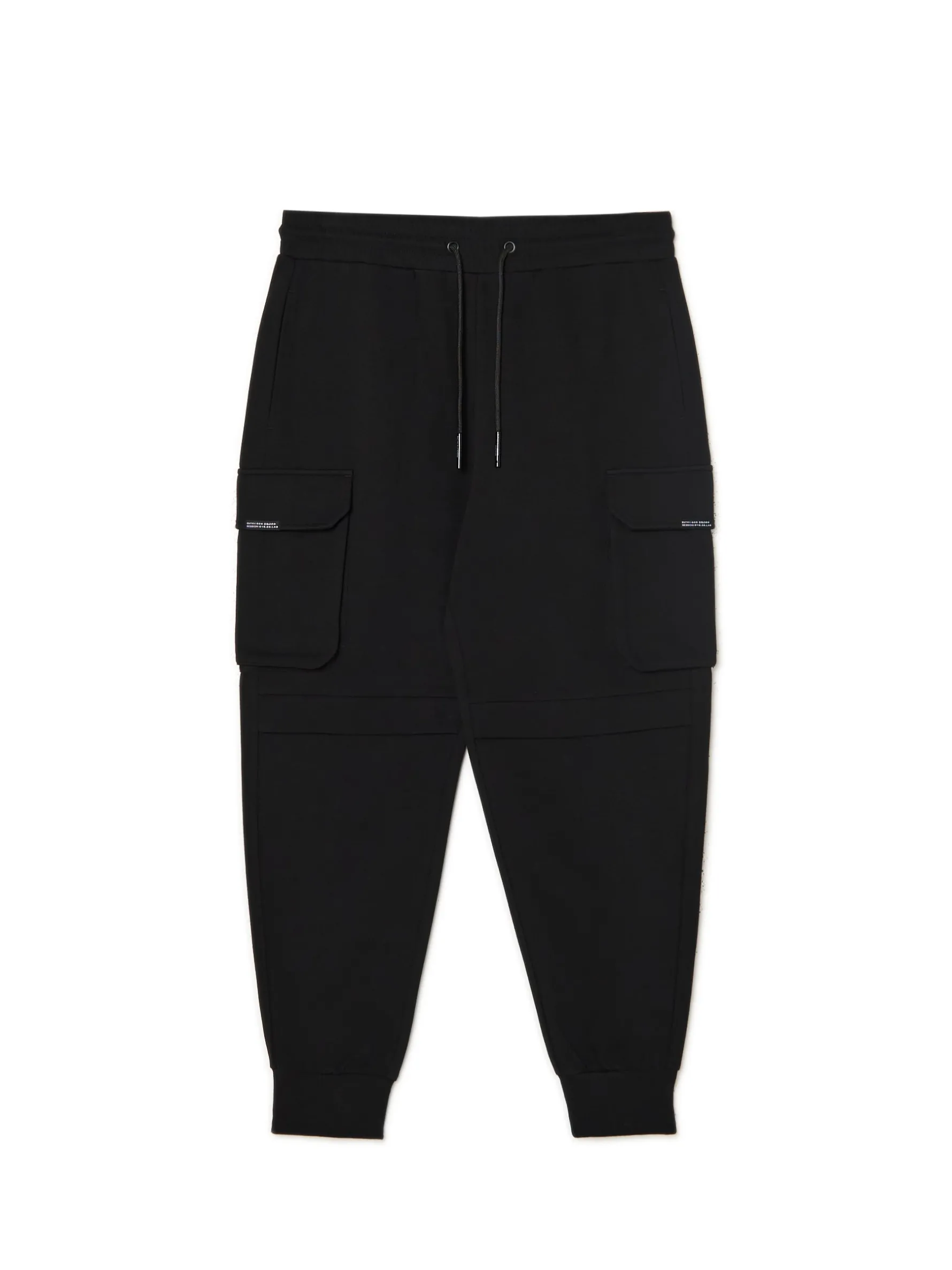 Czarne męskie dresy uszyte z dżersejowej dzianiny zawierającej bawełnę. Regularny stan, komfortowe zapięcie i co najważniejsze duża ilość kieszeni to must have tej jesieni. dzianina z dodatkiem elastycznych włókien regularny stan guma w pasie ze sznurkiem do regulacji długie nogawki wykończone ściągaczem 7 kieszeni, w tym jedna z zapięciem na zatrzask otwarte kieszenie po bokach 4 kieszenie z patkami na nogawkach efekt sprania na całości ozdobne wstawki na nogawkach naszywki na kieszeniach