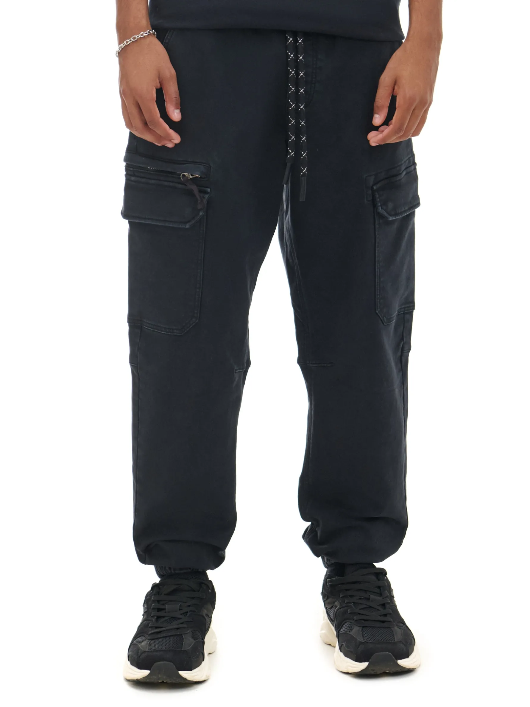Męskie spodnie typu cargo, uszyte z solidnej tkaniny o wysokiej zawartości bawełny. w pasie elastyczna gumka oraz sznurek wąska nogawka zakończona ściągaczem sześć kieszeni, dwie typu cargo ukośne przeszycia na wysokości kolan imitacja rozporka