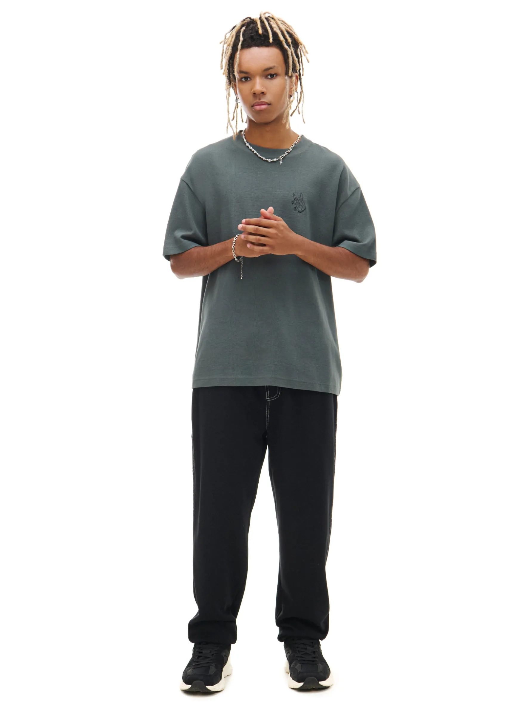 Męskie spodnie typu jogger, uszyte z dzianiny zawierającej bawełnę w kolorze czarnym. Ten wygodny i stylowy item warto mieć w swojej szafie! dzianinowy materiał z bawełną wygodny krój comfort guma w pasie ze sznurkiem do regulacji imitacja rozporka długie nogawki wykończone ściągaczem skośne kieszenie po bokach dwie naszyte kieszenie tylnie kontrastowe przeszycia metalowe detale