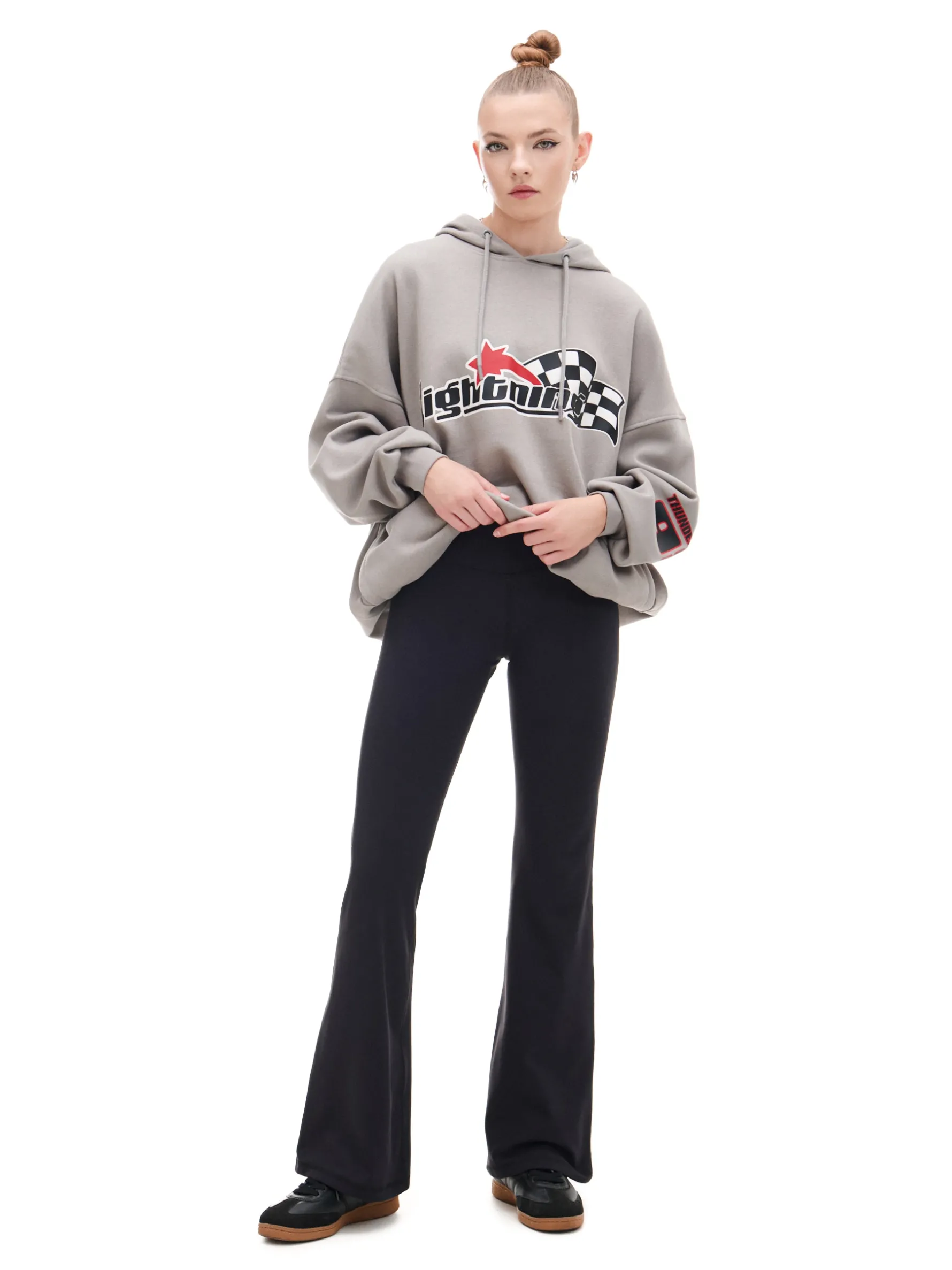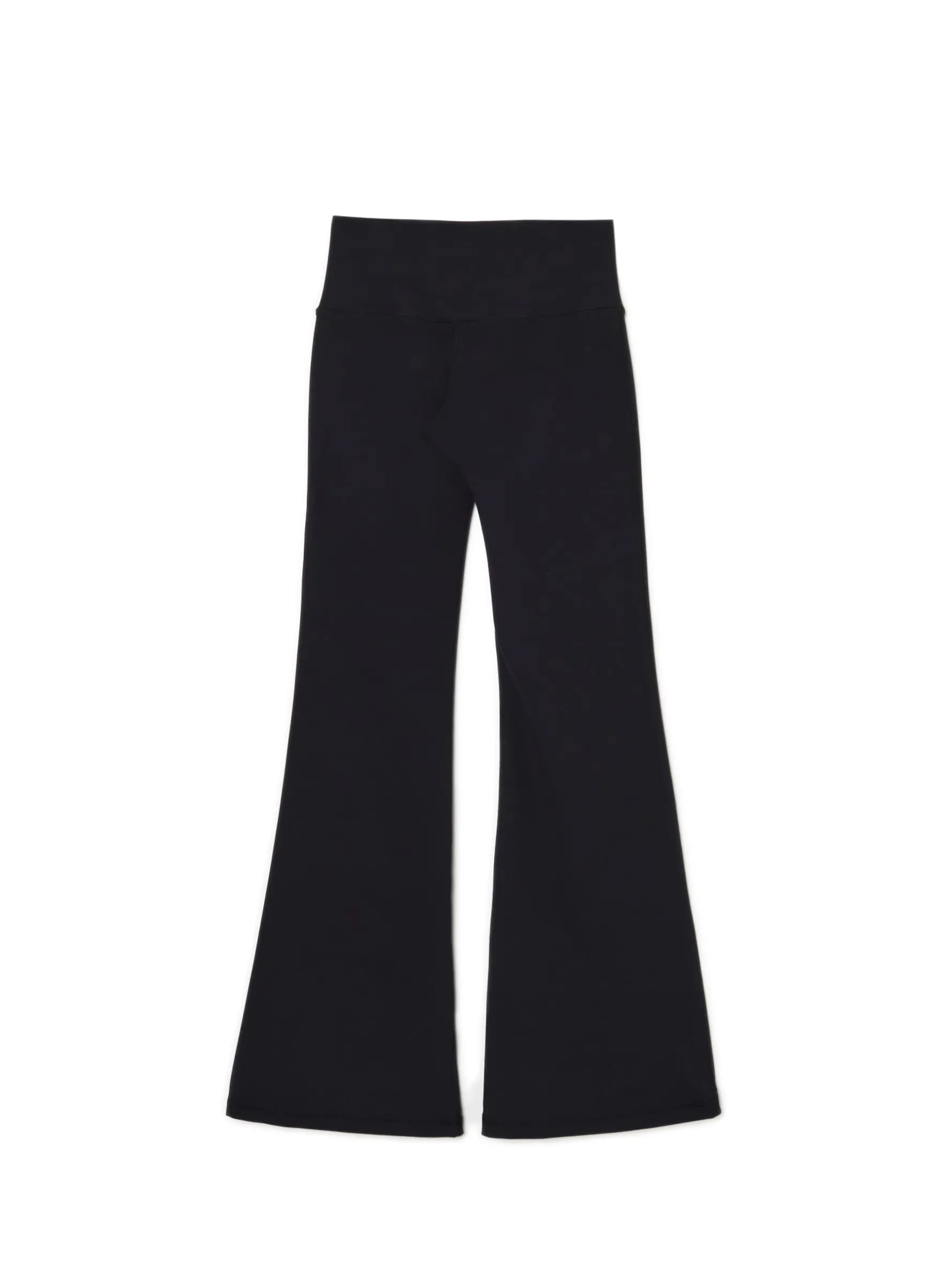 Czarne spodnie z wysokim stanem, uszyte z mieszanki dzianin z dodatkiem elastycznych włókien. Posiadają wygodne, długie nogawki rozszerzone na dole, idealne na jesień! dzianina z domieszką elastycznych włókien wysoki stan długie nogawki rozszerzane u dołu