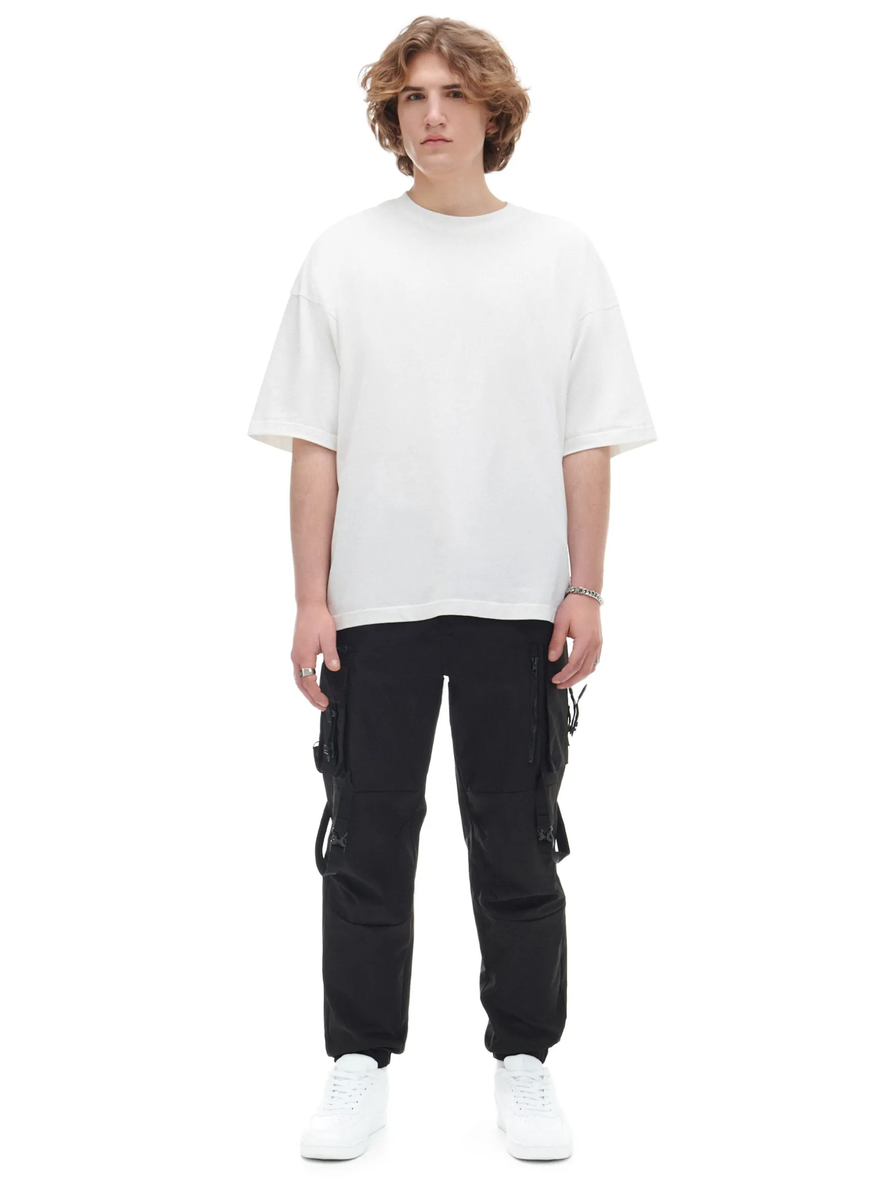 Czarne spodnie męskie o kroju loose, uszyte z wytrzymałej tkaniny. swobodny fason zapięcie na zamek i guzik oraz dodatkowy pasek z klamrą liczne kieszenie, w tym kieszenie typu cargo z klamrami nogawki z elastyczną gumką Wzrost modela: 184 cm