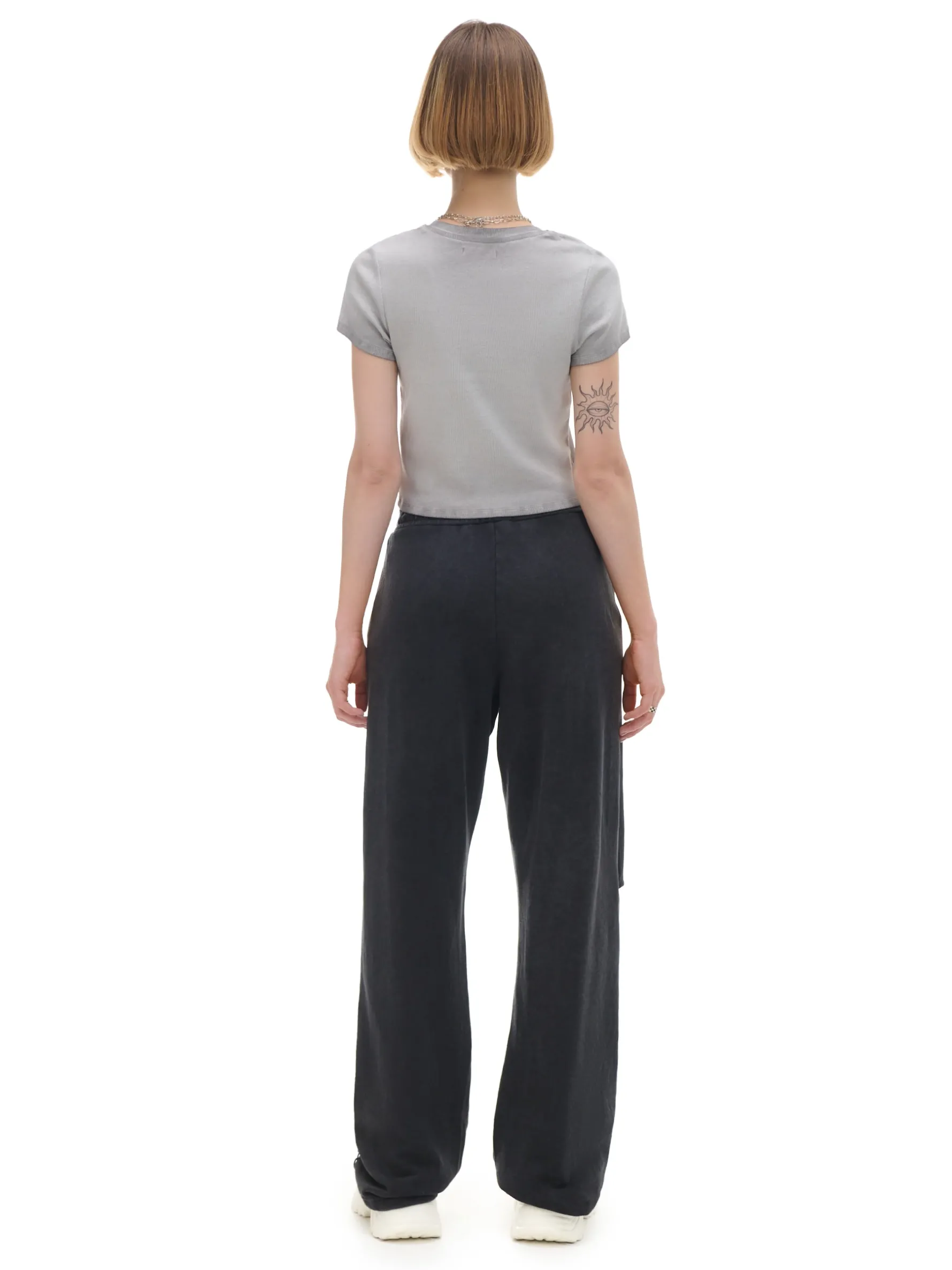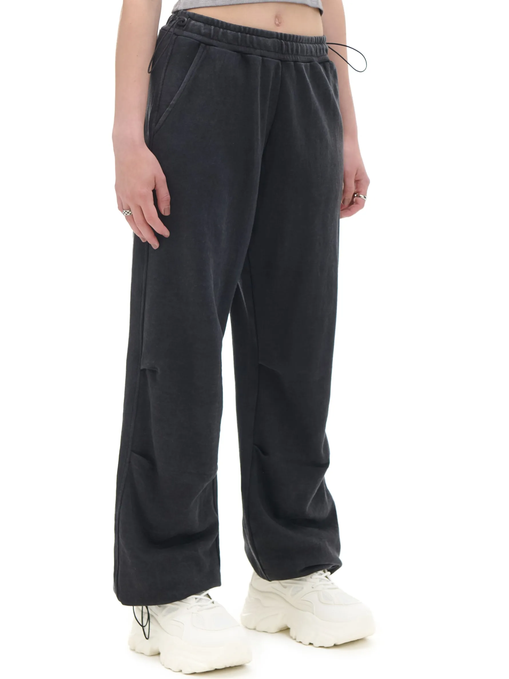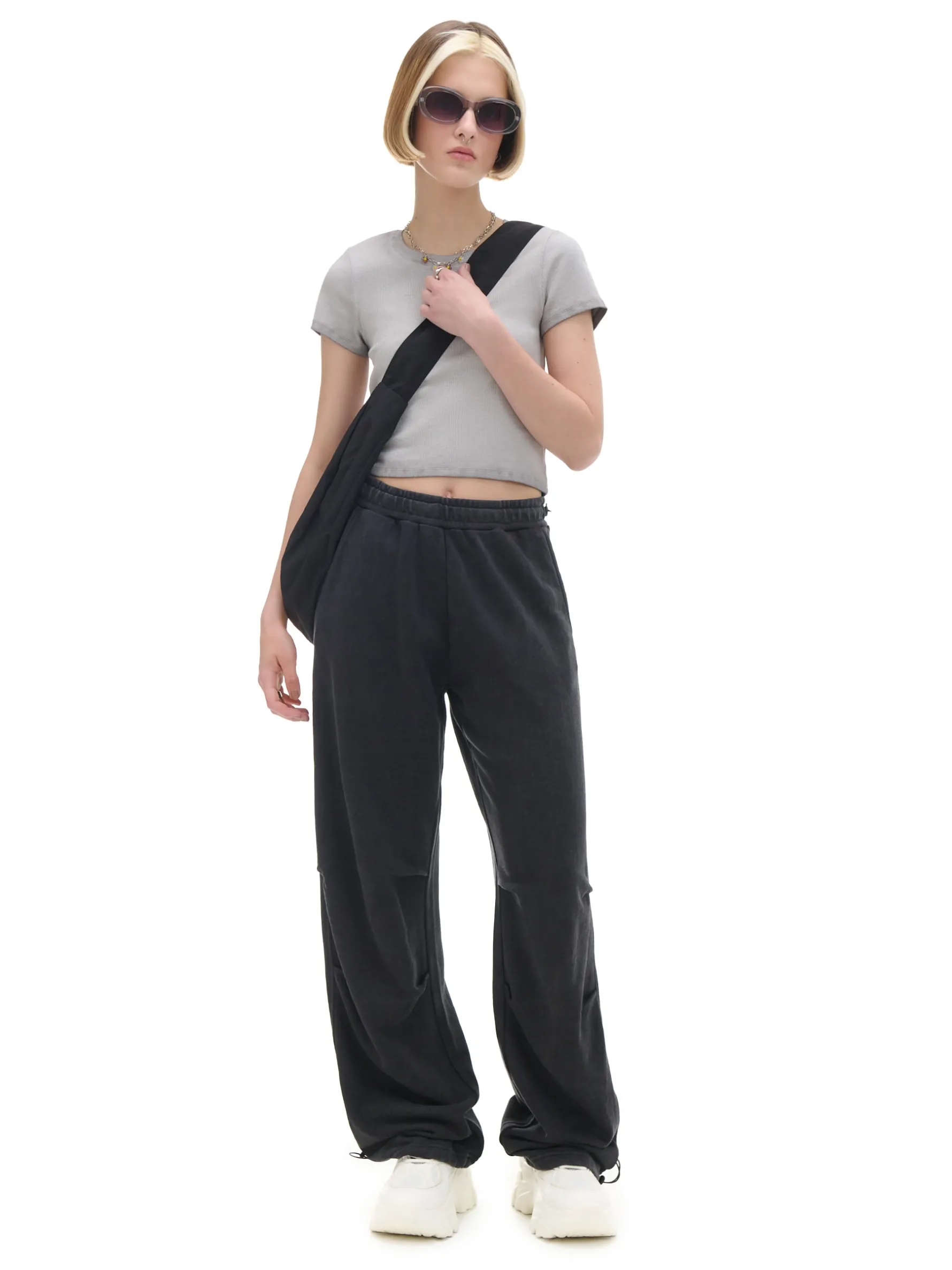 Damskie spodnie typu parachute uszyte z trwałej dzianiny z dodatkiem bawełny. Item wyposażony w elastyczne gumy w pasie i przy nogawkach, regulowane za pomocą stoperów. Dobierz do nich ulubione topy! dzianinowy materiał z bawełną długie, swobodne nogawki wykończone ściągaczem regulacja dołu i pasa za pomocą sznurka ze stoperem elastyczna gumka w pasie otwarte kieszenie z przodu ozdobne zakładki