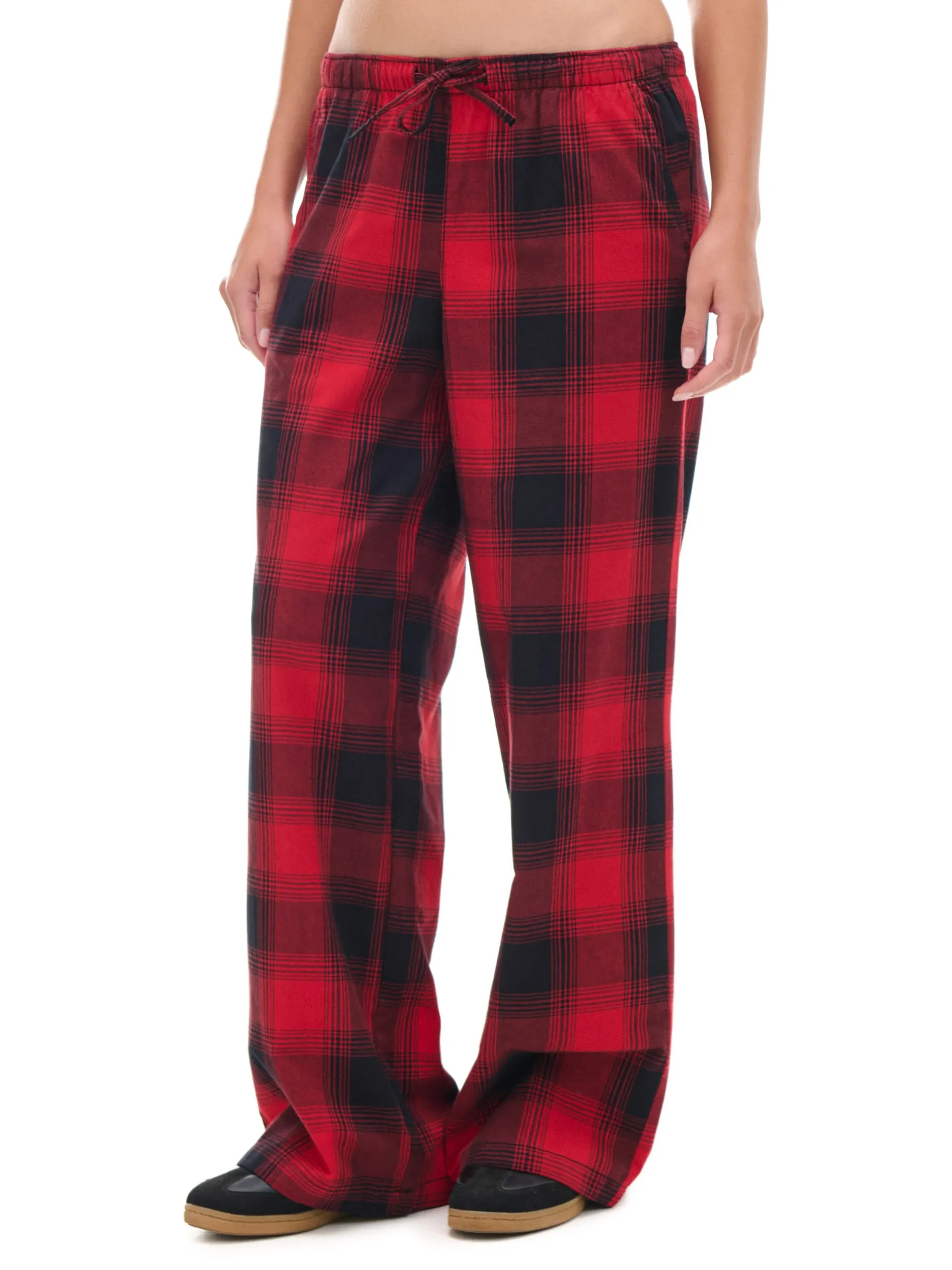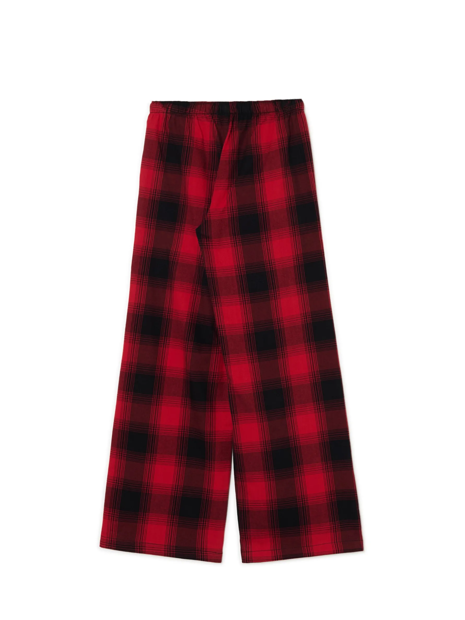 Damskie spodnie uszyte z bawełnianej tkaniny z modnym wzorem w kratę. 100% bawełny długie, swobodne nogawki gumka w pasie ze sznurkiem do regulacji dwie kieszenie po bokach wzór w kratę na całej powierzchni Wzrost modelki: 177 cm