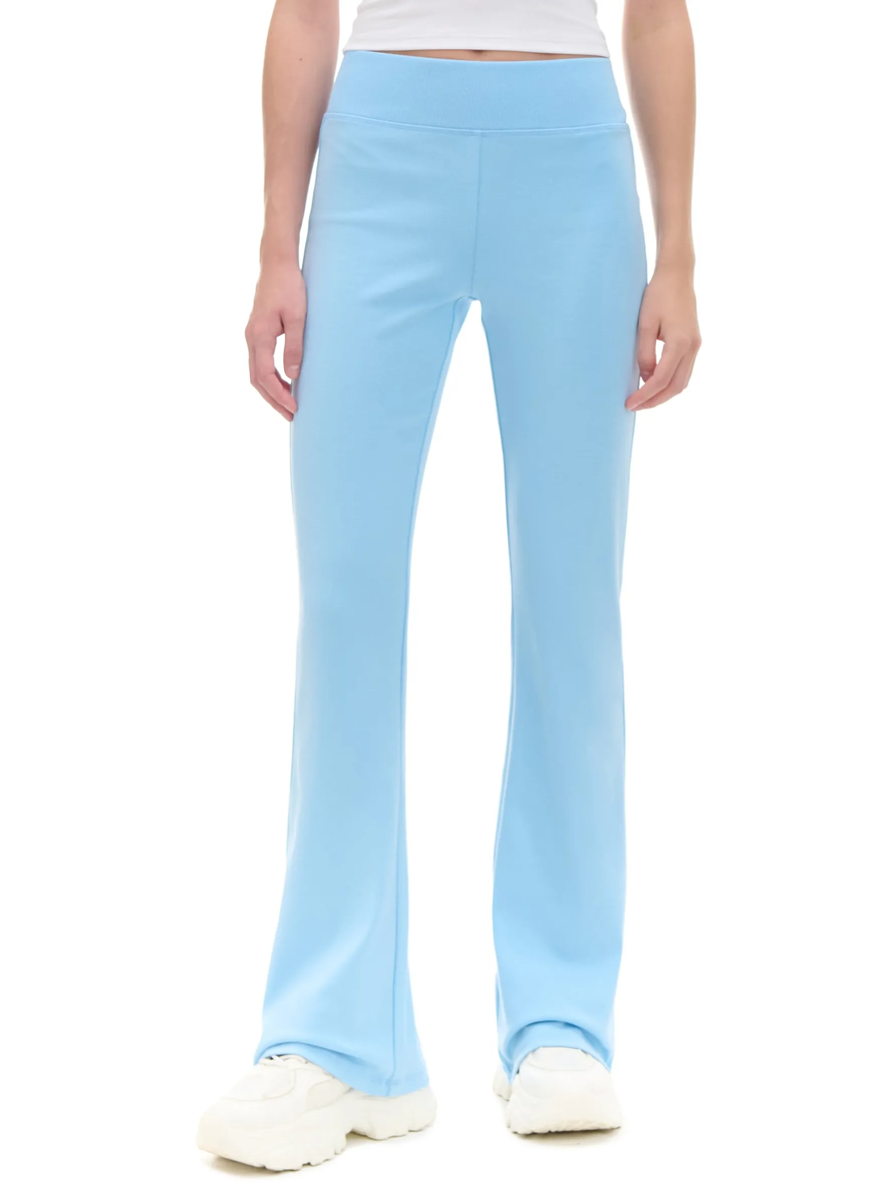 Damskie spodnie dresowe typu flare, uszyte z mieszanki dzianin z bawełną. Elastyczna guma w pasie podkreśli Twoją talię i zapewni komfort podczas każdej aktywności. dzianinowy materiał z bawełną wysoki stan podkreślający talię długie, lekko rozszerzane nogawki