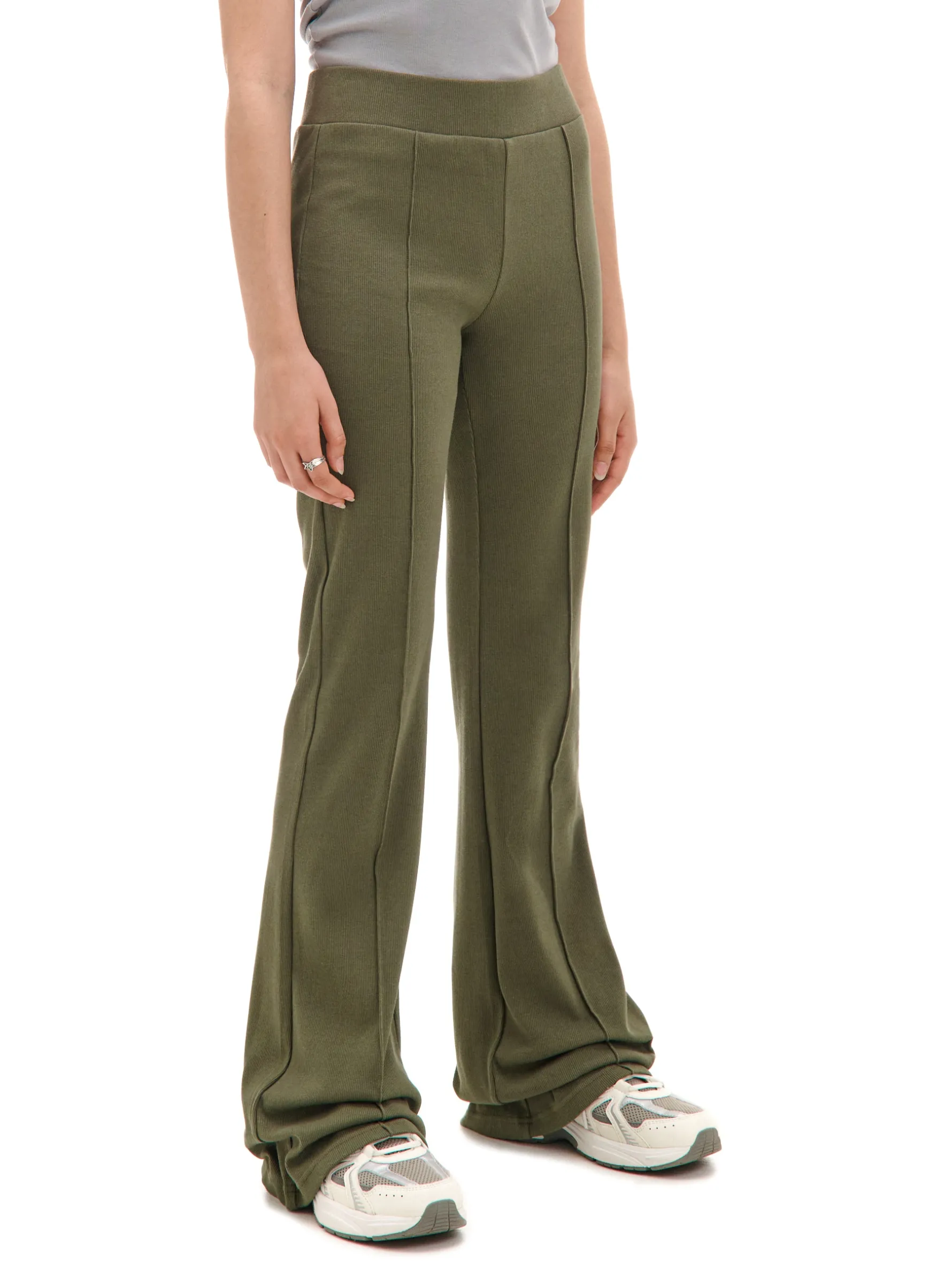 Gładkie damskie spodnie o kroju flare, idealne na aktywność fizyczną… albo chill na kanapie. wysoki stan w pasie gumka długa, rozszerzająca się nogawka