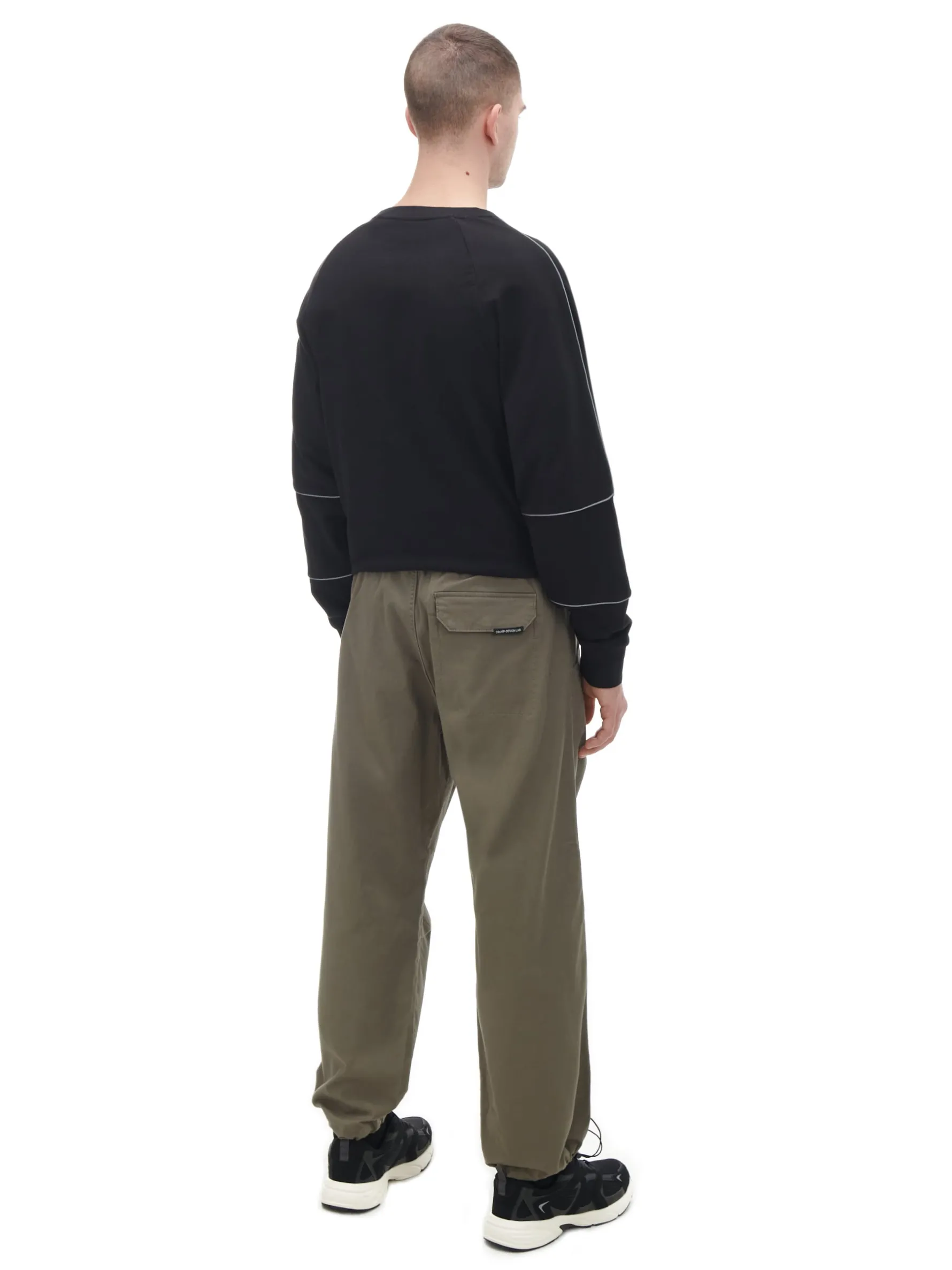 Zielone męskie spodnie o luźnym fasonie parachute, uszyte z lekkiej bawełnianej tkaniny. regularny stan rozporek z suwakiem wbudowany pasek zapinany na plastikową klamrę luźna nogawka zakończona regulacją za pomocą elastycznej gumki ze stoperem trzy kieszenie, w tym jedna z tyłu, zapinana na zatrzask Wzrost modela: 184 cm