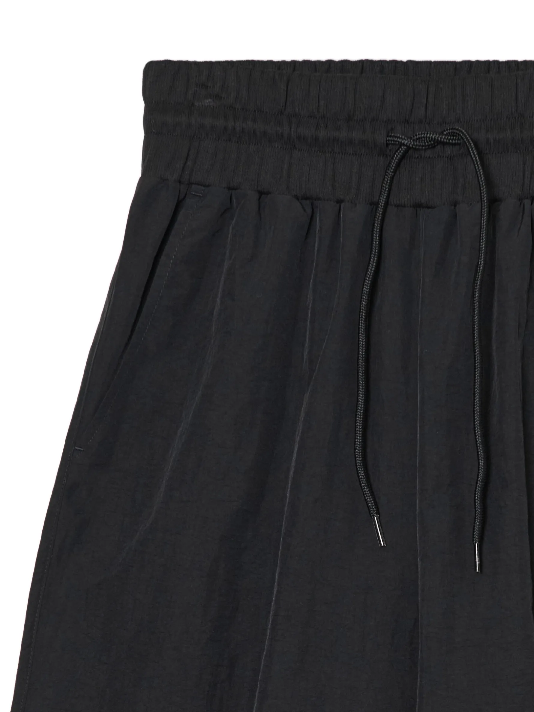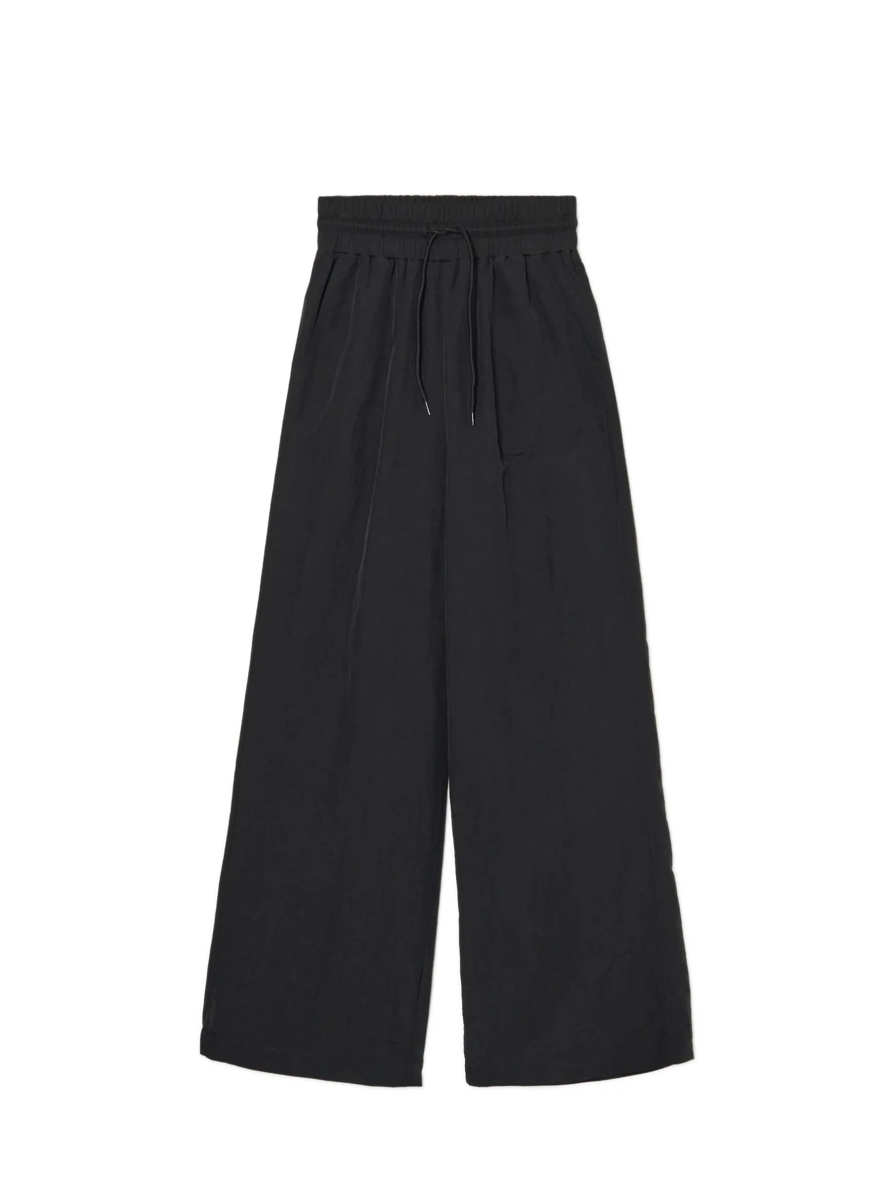 Czarne damskie spodnie z szerokimi nogawkami, uszyte z trwałej tkaniny. Komfort zapewnia luźny krój, który nie krępuje ruchów. Przygotuj się na nowy sezon! uszyte z gładkiej tkaniny obszerny krój baggy wysoki stan długie, szerokie nogawki elastyczna gumka w pasie sznurek w pasie