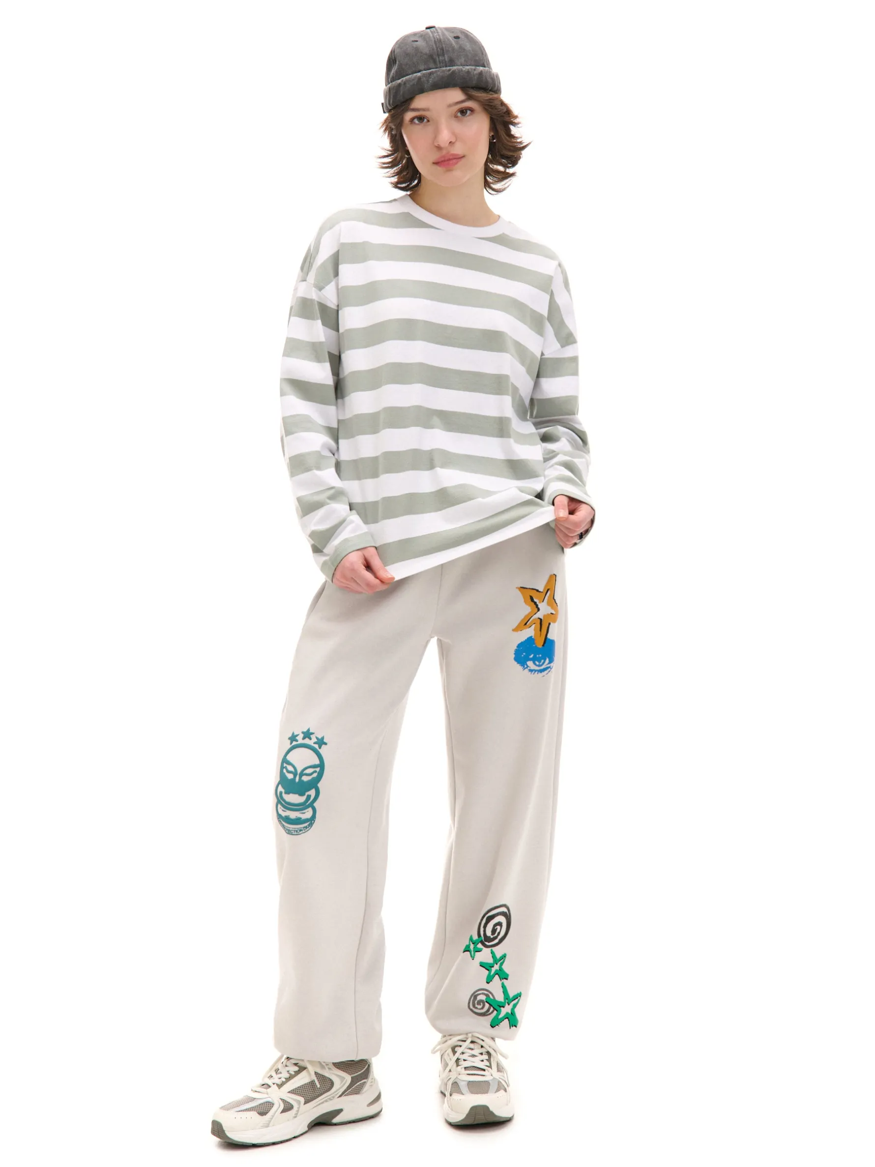 Dresowe damskie spodnie o regularnym kroju uszyte z mieszanki dzianin w jasnoszarym kolorze. Na całej powierzchni kolorowe nadruki o nieregularnym ułożeniu w artystycznym stylu. dresowe joggery uszyte z dzianiny z bawełną regularny krój gumka w pasie ze sznurkiem do regulacji długie nogawki wykończone ściągaczem dwie kieszenie boczne nadruki all over Produkt tworzy zestaw z modelem 941AR-09X .