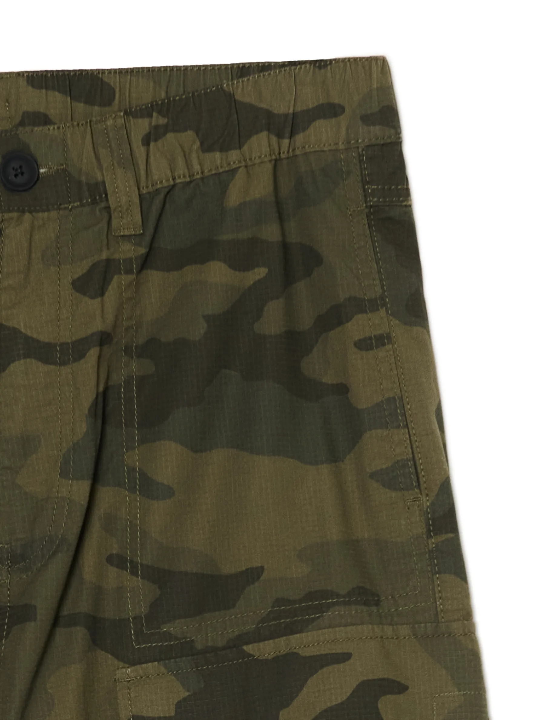 Męskie spodnie typu cargo, uszyte z solidnej tkaniny o wysokiej zawartości bawełny. Na całości pojemne kieszenie i charakterystyczny wzór moro. Gotowe na każdą okazję! dzianinowy materiał z bawełną wygodny krój comfort zapięcie na zamek i guzik w pasie od wewnątrz wszyta gumka długie, swobodne nogawki zakończone ściągaczem otwarte kieszenie z przodu cztery kieszenie z patkami z przodu dwie kieszenie tylne z zapięciem na rzepy szlufki na pasek wzór moro all over Wzrost modela: 185 cm