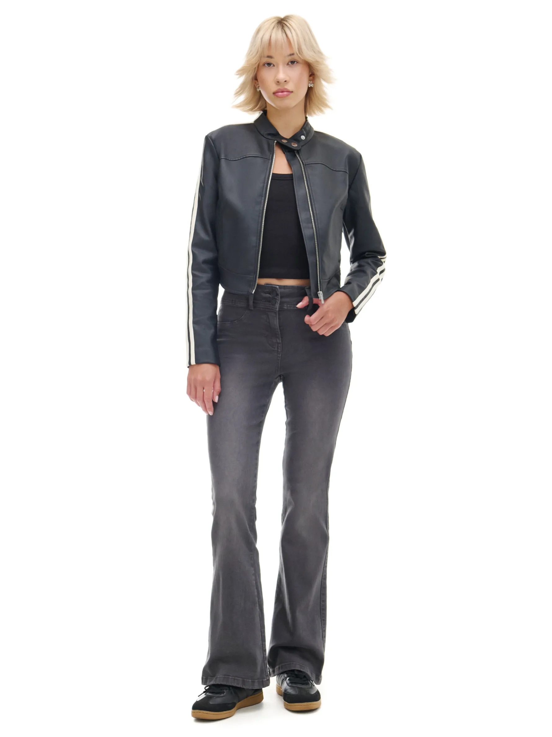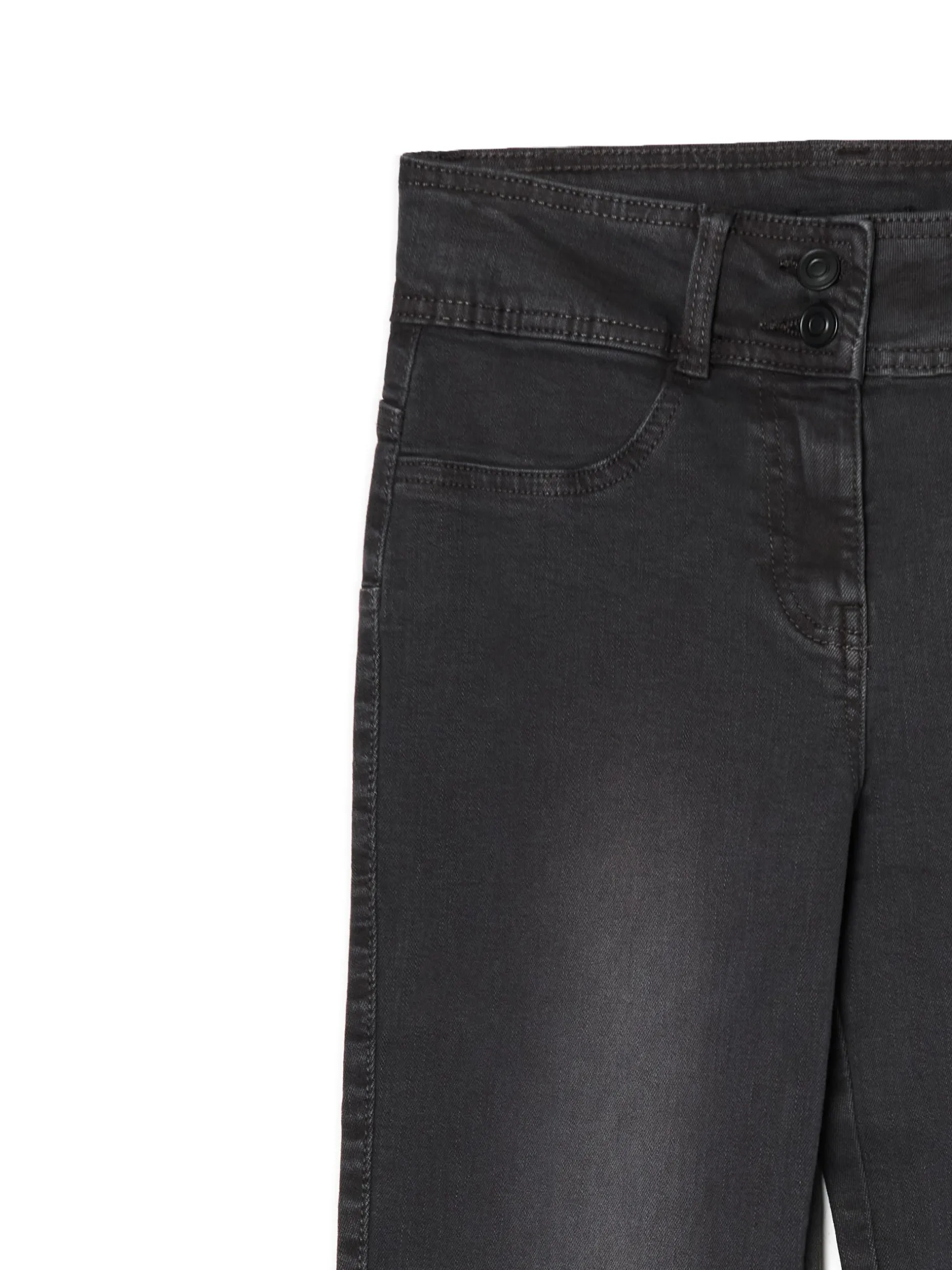 Damskie spodnie uszyte z trwałej i elastycznej tkaniny. Ciekawe zapięcie na 2 guziki i ozdobny efekt sprania na nogawkach wyróżniają ten model. bawełna z dodatkiem elastycznych włókien spodnie o kroju flare regularny stan zapięcie na dwa guziki i zamek długie nogawki rozszerzane u dołu imitacja kieszeni z przodu naszywane kieszenie z tyłu ozdobne zakładki z tyłu lekki efekt sprania na udach szerokie szlufki na pasek Wzrost modelki: 177 cm