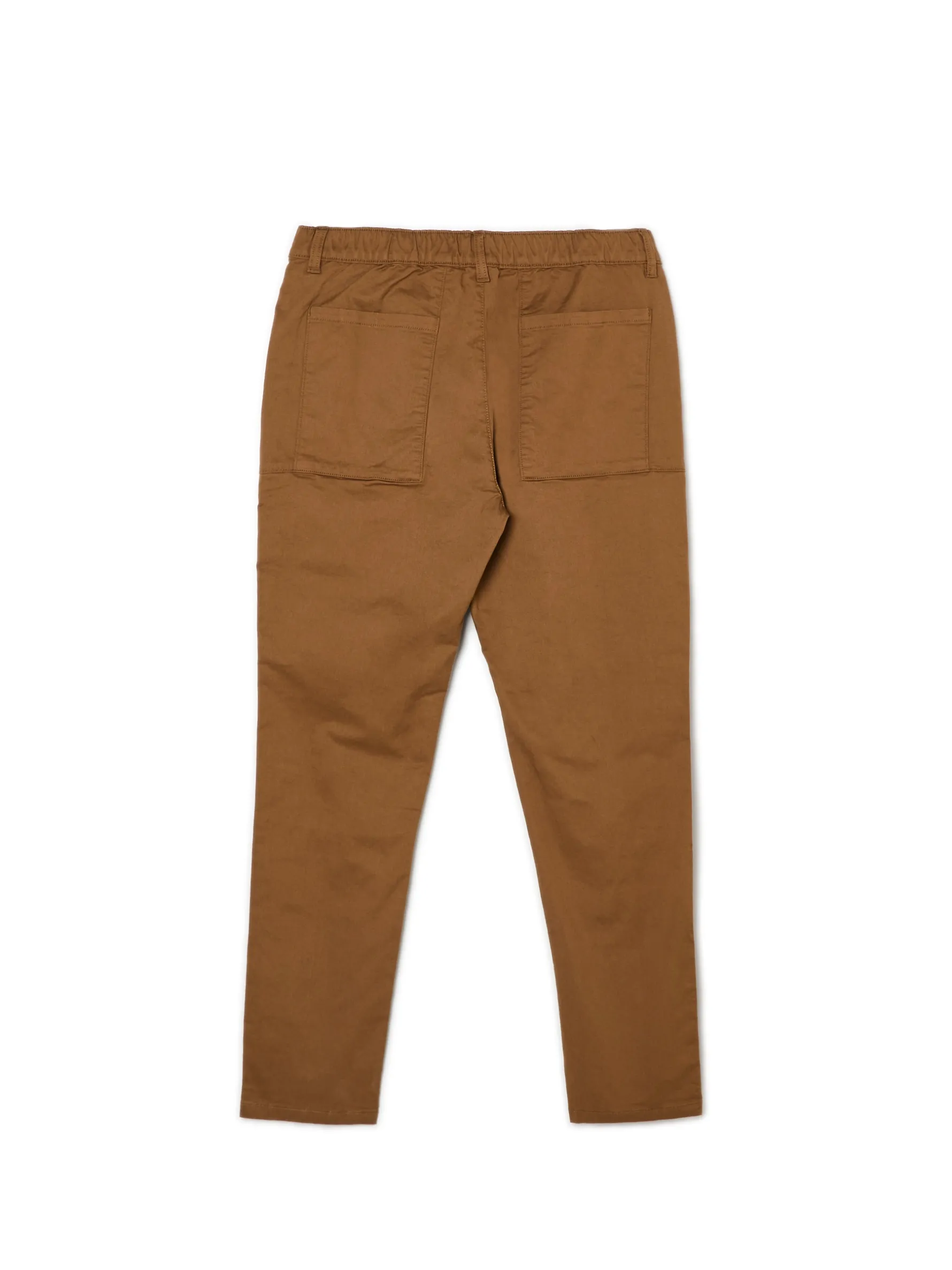 Ciemnobrązowe spodnie męskie o regularnym kroju, uszyte z bawełnianej tkaniny z dodatkiem elastycznych włókien. w pasie regulacja za pomocą klamry 6 kieszeni, w tym dodatkowe kieszenie na nogawkach prosta nogawka spodnie dostępne w innej wersji kolorystycznej