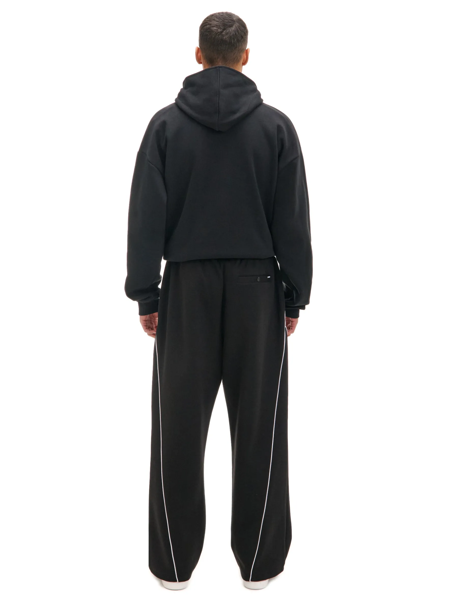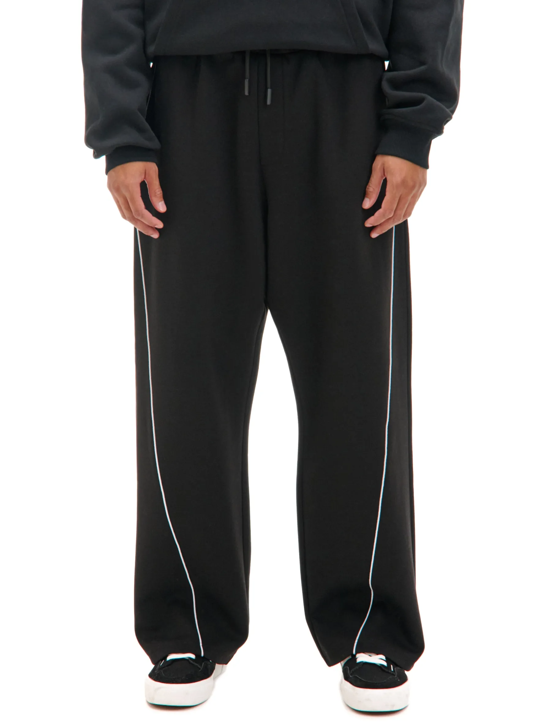 Dzianinowe męskie spodnie z szerokimi nogawkami i ozdobnymi przeszyciami. Dodatkowo z tyłu wszyta kieszeń z zapięciem na nap na kilka drobnych rzeczy. Swobodnie i komfortowo, czyli tak jak lubimy najbardziej. spodnie typu wide leg dzianina z domieszką elastycznych włókien elastyczna gumka w pasie troczki w pasie długie, szerokie nogawki naszywa kieszeń z tyłu na zatrzask ozdobne wykończenie w kontrastującym kolorze