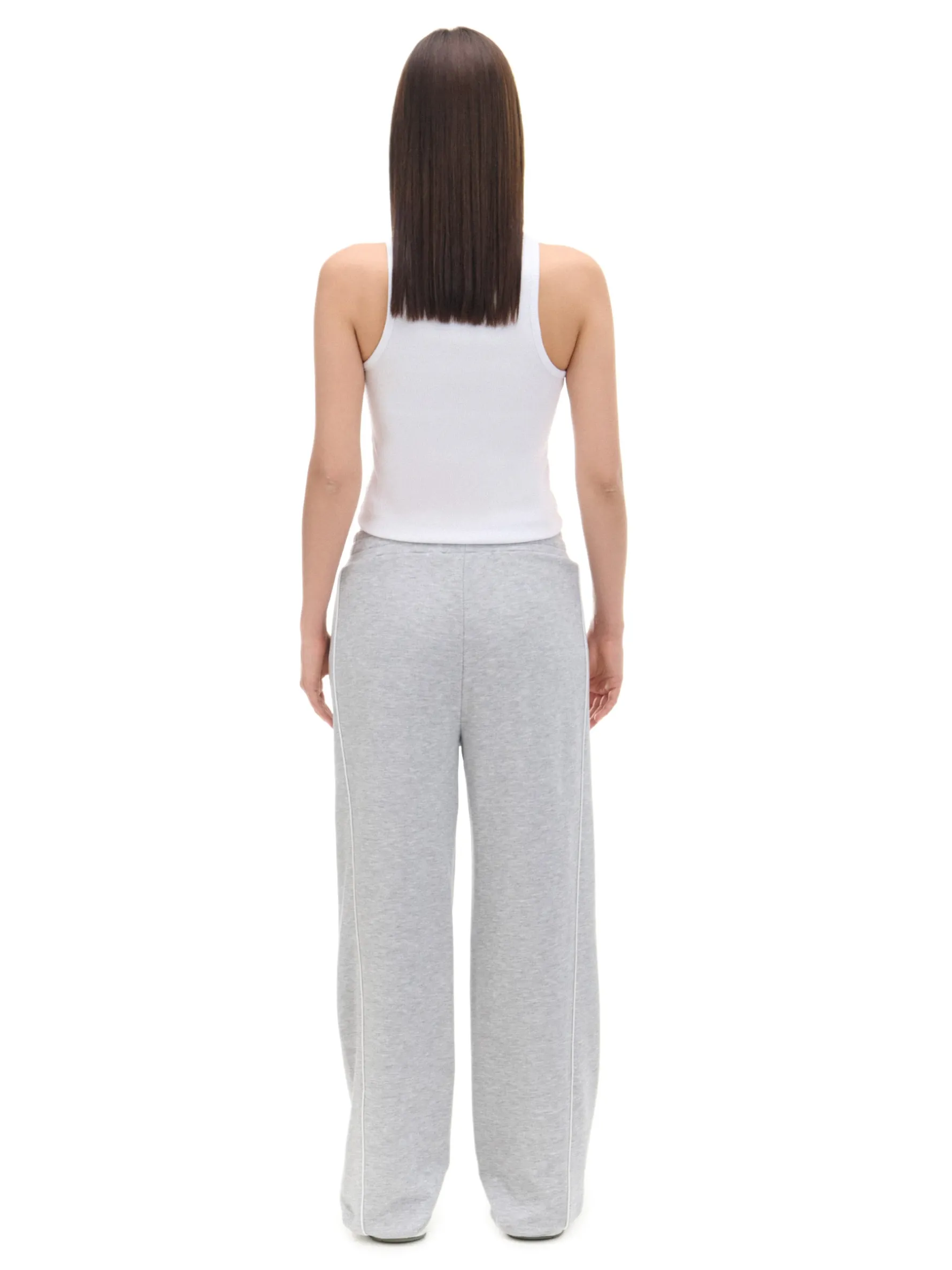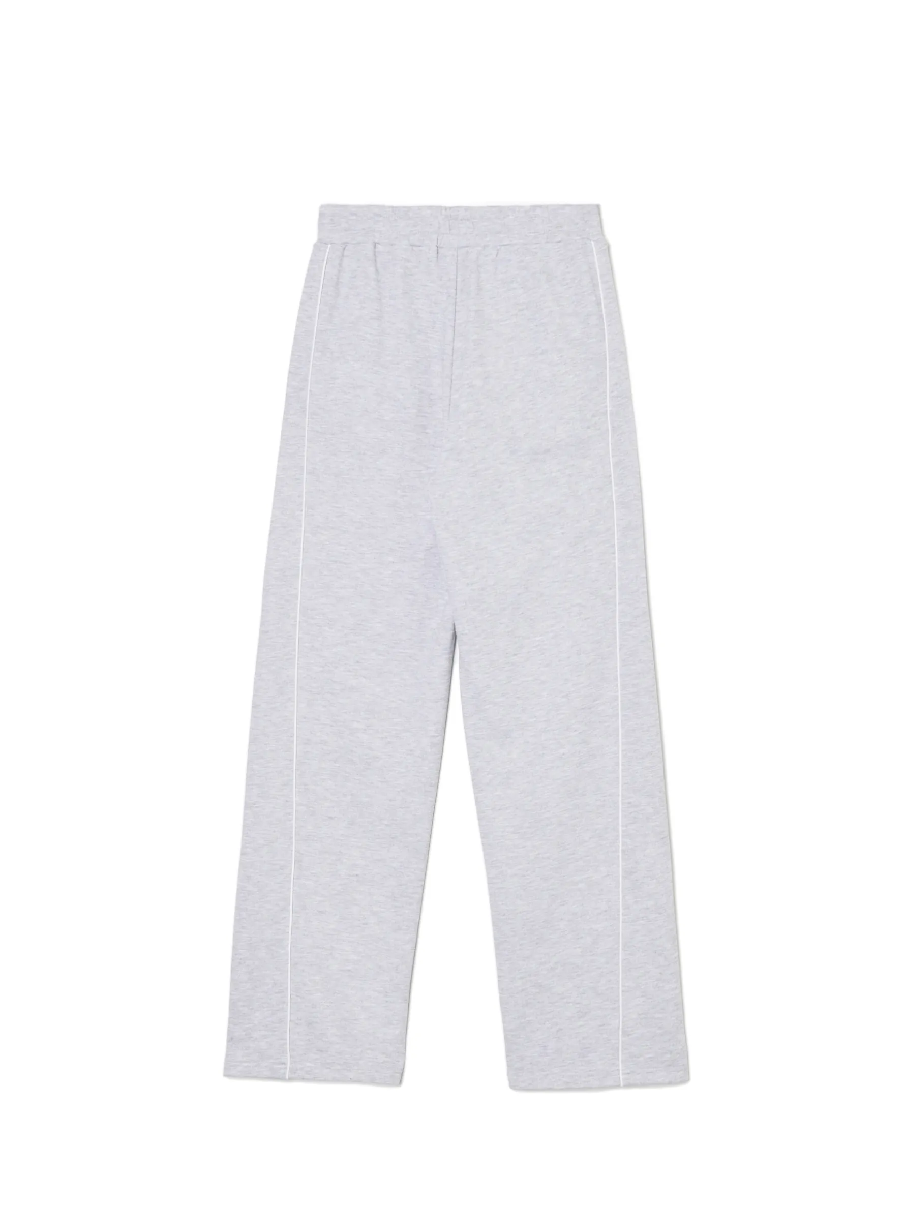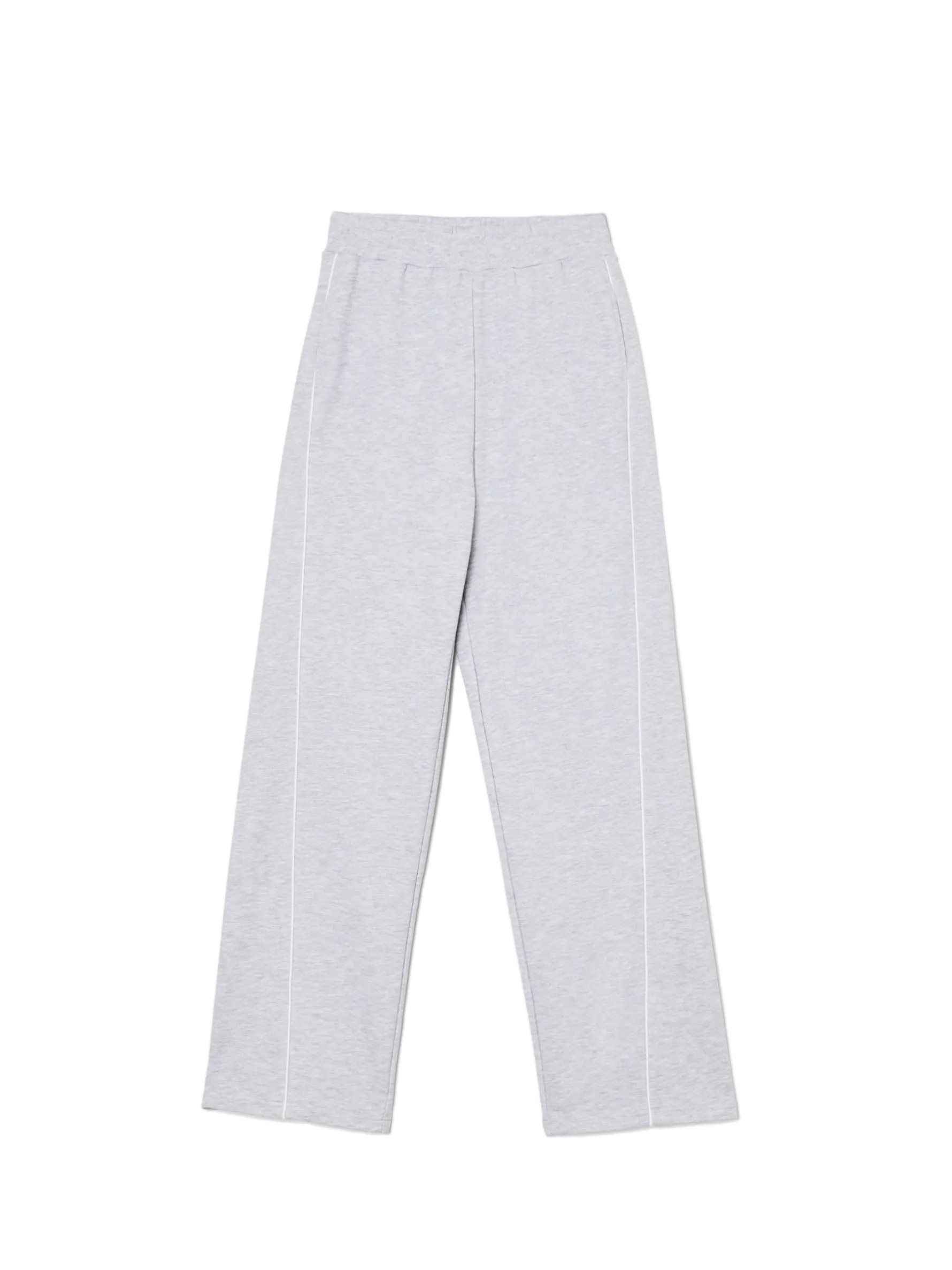 Damskie dresowe spodnie z szerokimi, luźnymi nogawkami uszyte z dzianiny o dużej zawartości bawełnianej dzianiny w jasnoszarym kolorze. Hitem tego modelu są ozdobne przeszycia. dzianinowy materiał z bawełną wysoki stan szeroka nogawka z kontrastowym lampasem elastyczna gumka w pasie dwie wszyte kieszenie