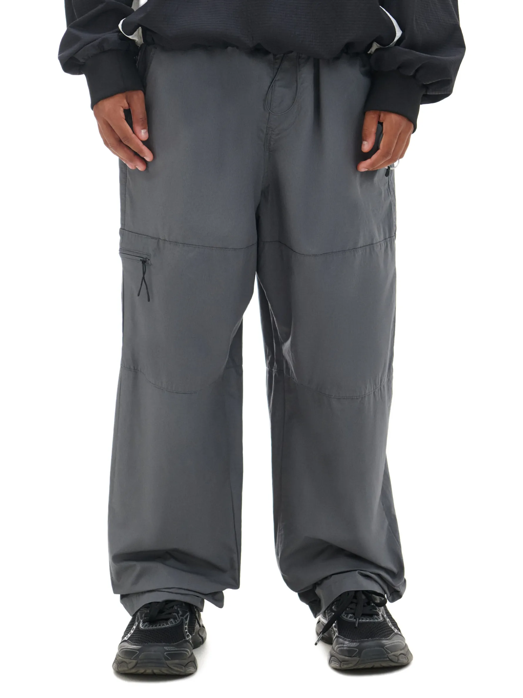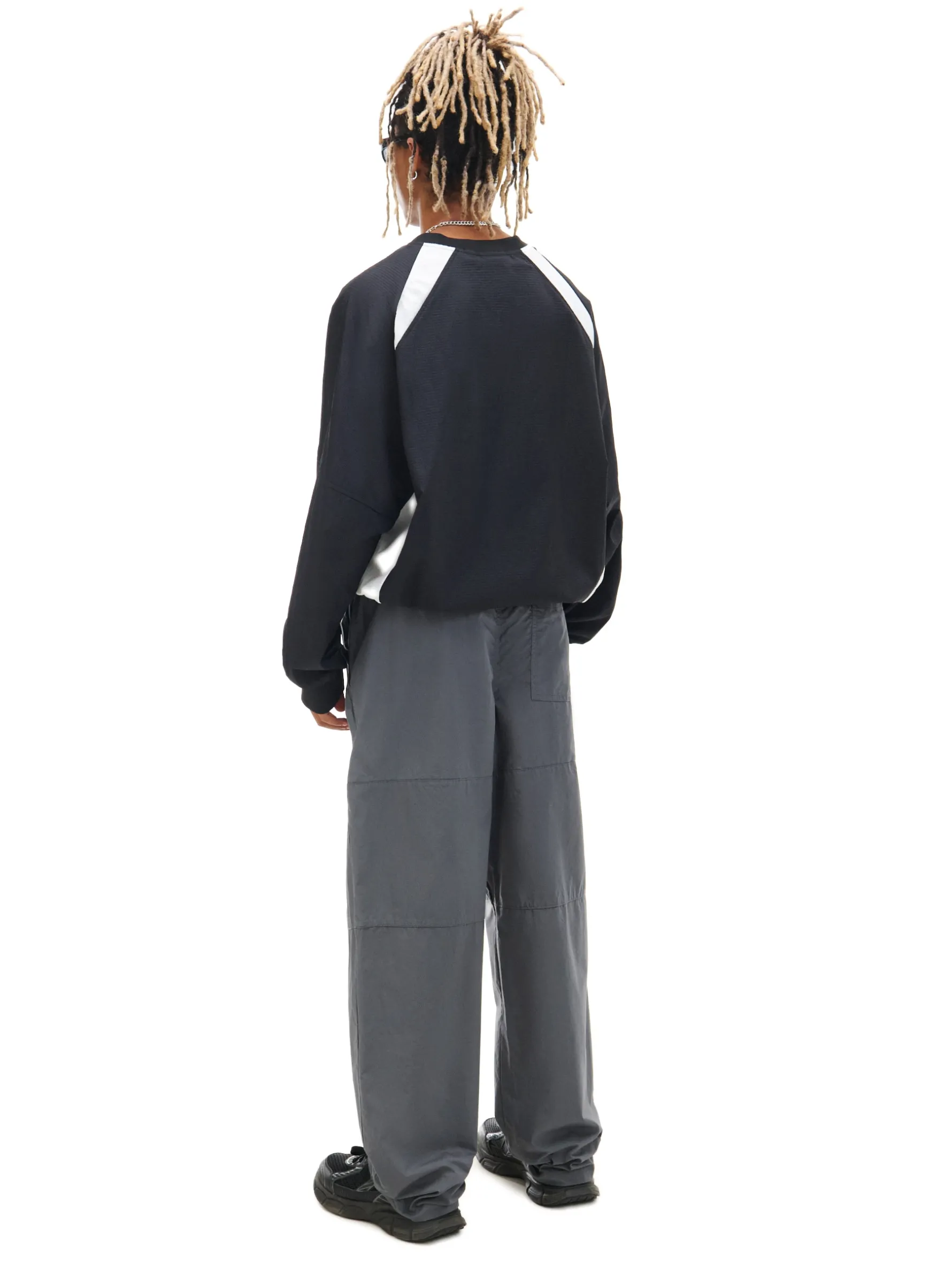 Męskie spodnie o luźnym kroju, uszyte z tkaniny zawierającej 100% bawełny. Idealny wybór na Baltic Games! krój loose w pasie elastyczna gumka, regulowana stoperem luźna, długa nogawka imitacja rozporka dwie kieszenie boczne, jedna kieszeń z tyłu jedna kieszeń zapinana na suwak na wysokości kolana