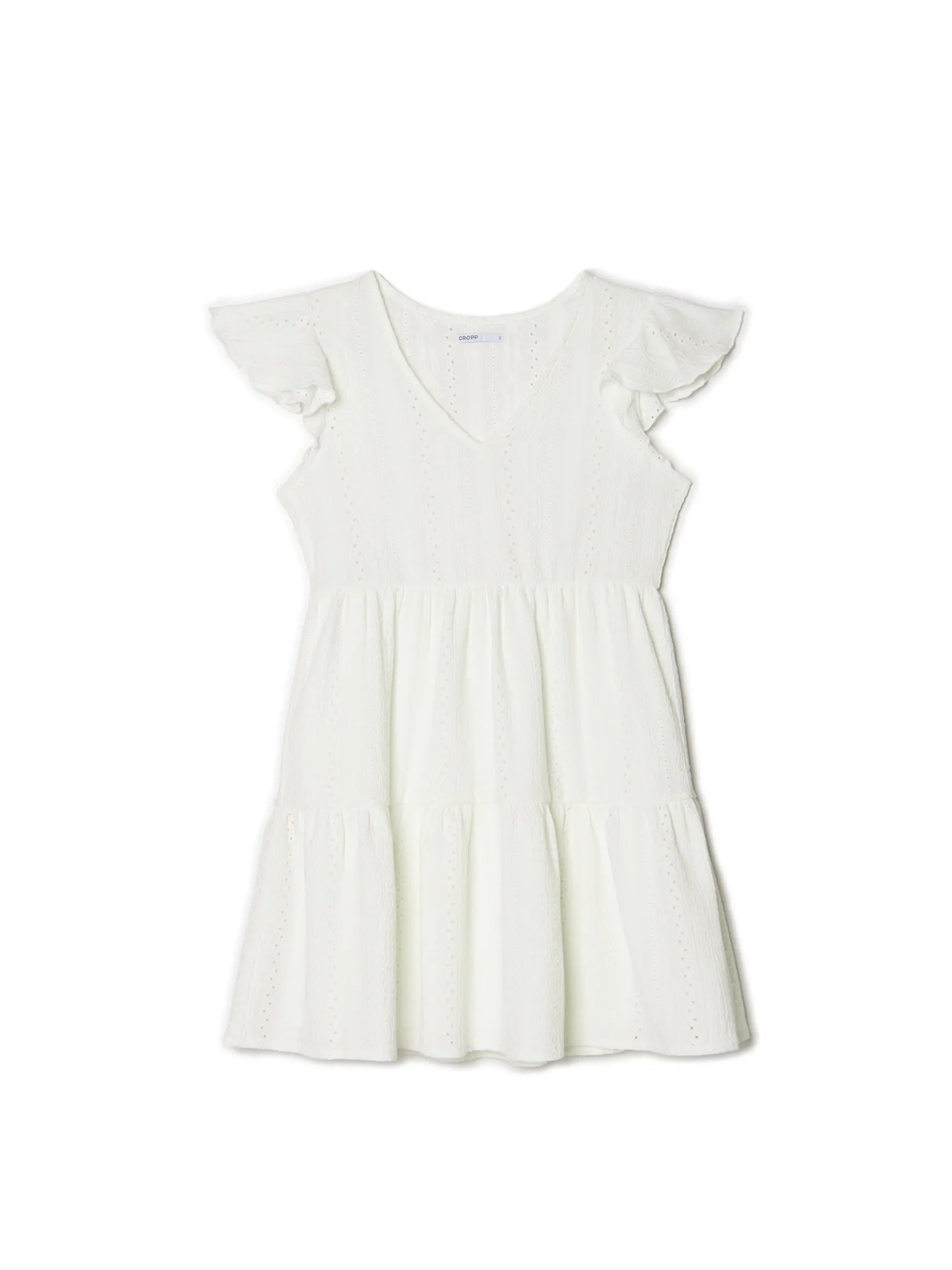 Krótka sukienka damska o swobodnym kroju, uszyta z elastycznej dzianiny. dekolt w kształcie litery V krótkie rękawy z falbankami dół wykończony falbanką wykończenie na podszewce ażurowy wzór na całości sukienka dostępna w innej wersji kolorystycznej Wzrost modelki: 172 cm