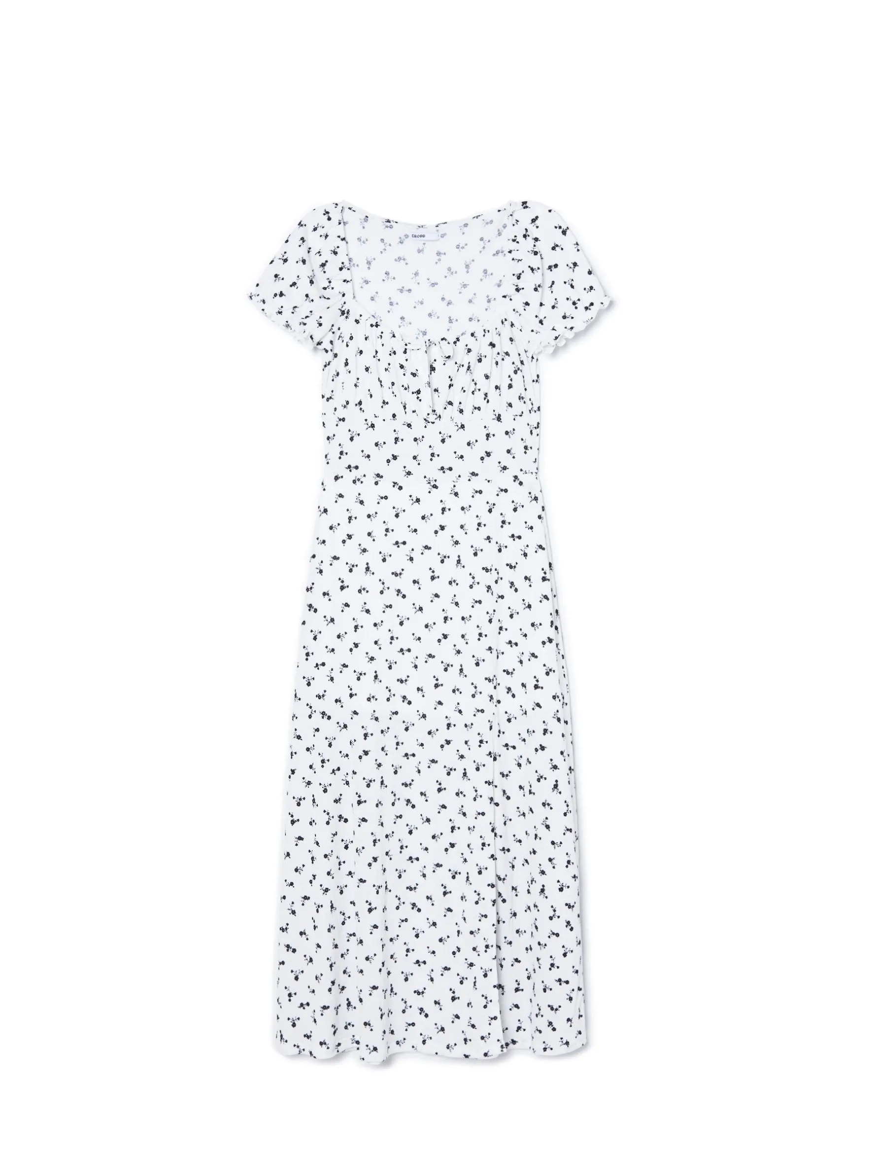 Lekka sukienka, uszyta z wzorzystej dzianiny z kwiatowym motywem. Dostępne inne warianty kolorystyczne. długość midi fason typu empire – odcięcie tuż po biustem krótkie, bufiaste rękawy dekolt z rozcięciem i wiązaniem lekko rozkloszowana spódnica z rozcięciem nadruk w kwiaty na całej powierzchni