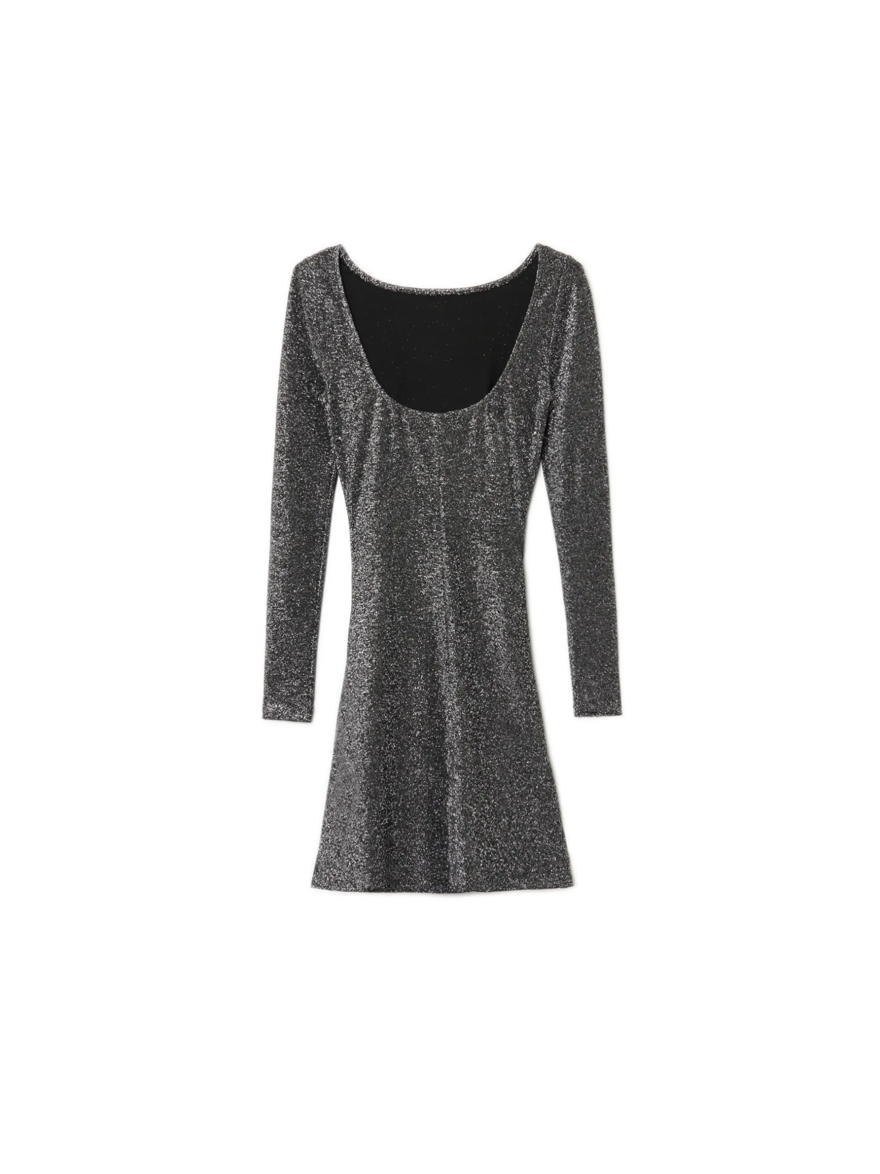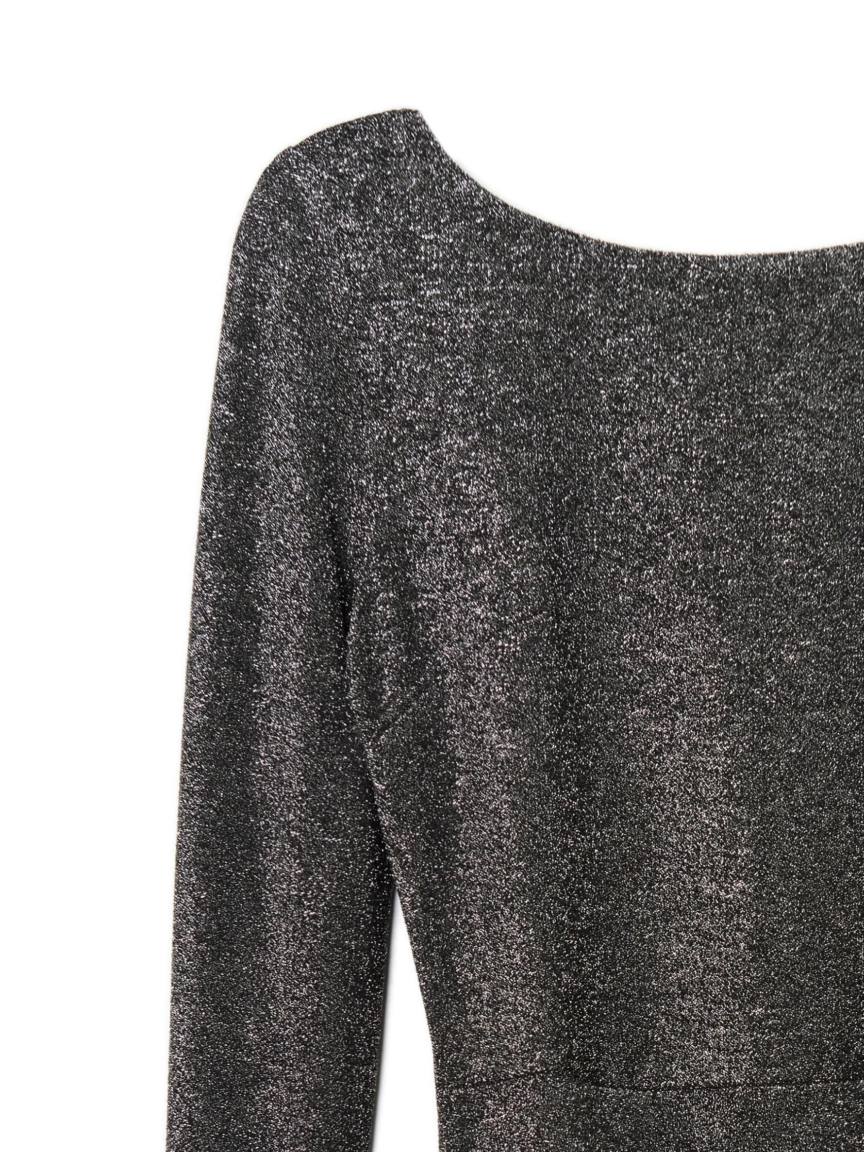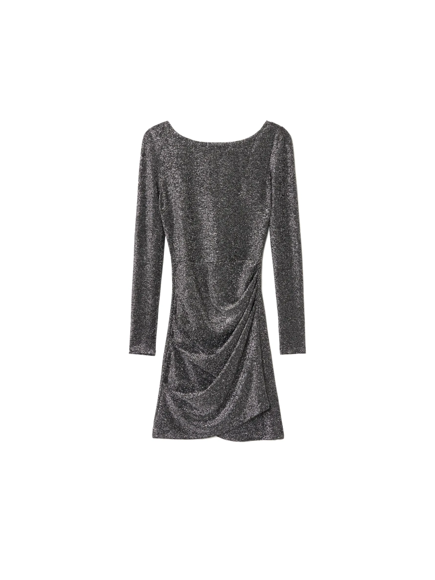 Damska sukienka o długości mini wykonana z wysokiej jakości błyszczącego materiału. Odkryte plecy, marszczenie z boku i dekoracyjna zakładka na przodzie dają efekt wow. Idealna na sylwestra i inne imprezy okolicznościowe. dzianina z metalizowaną nitką długość mini długie, dopasowane rękawy dekolt w łódkę efektowne, odkryte plecy dekoracyjna zakładka z przodu
