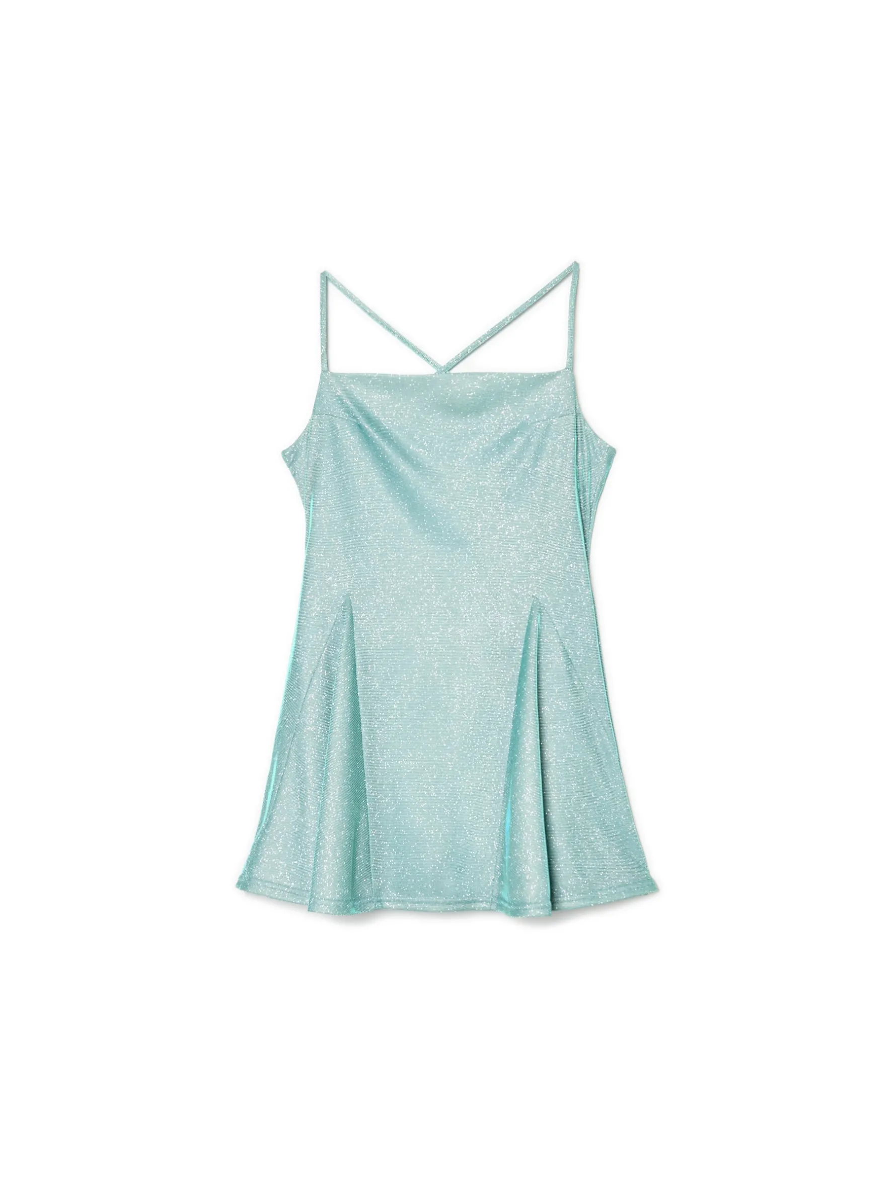 Chcesz skupić uwagę na sobie na imprezie sylwestrowej? Ta damska sukienka mini uszyta z delikatnie mieniącej się mieszanki tkanin Ci to zapewni. Dodatkowymi ozdobami są krzyżujące się na plecach cienkie ramiączka z regulacją i kliny na dole. delikatnie błyszczący materiał długość mini regulowane ramiączka krzyżujące się na plecach zapięcie na kryty zamek ozdobne falbany dodatkowe kliny nadające lekkości