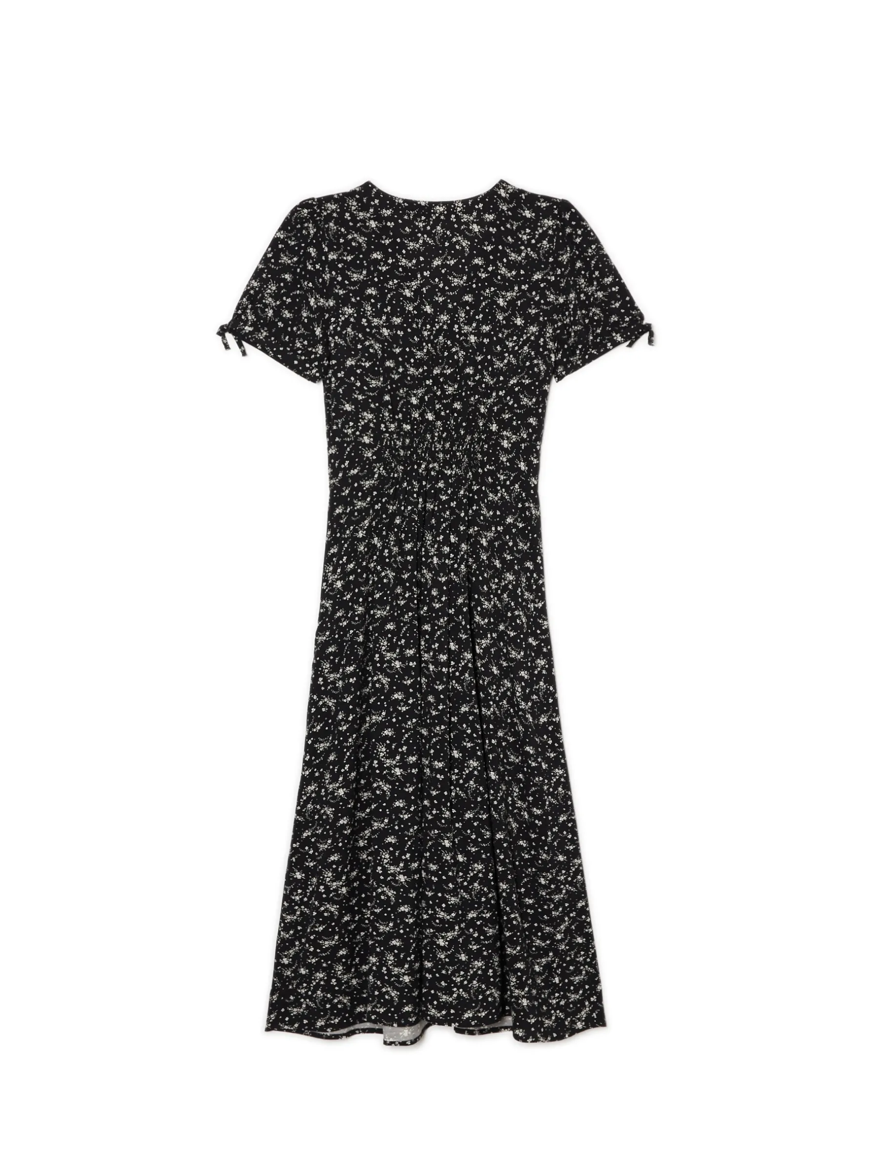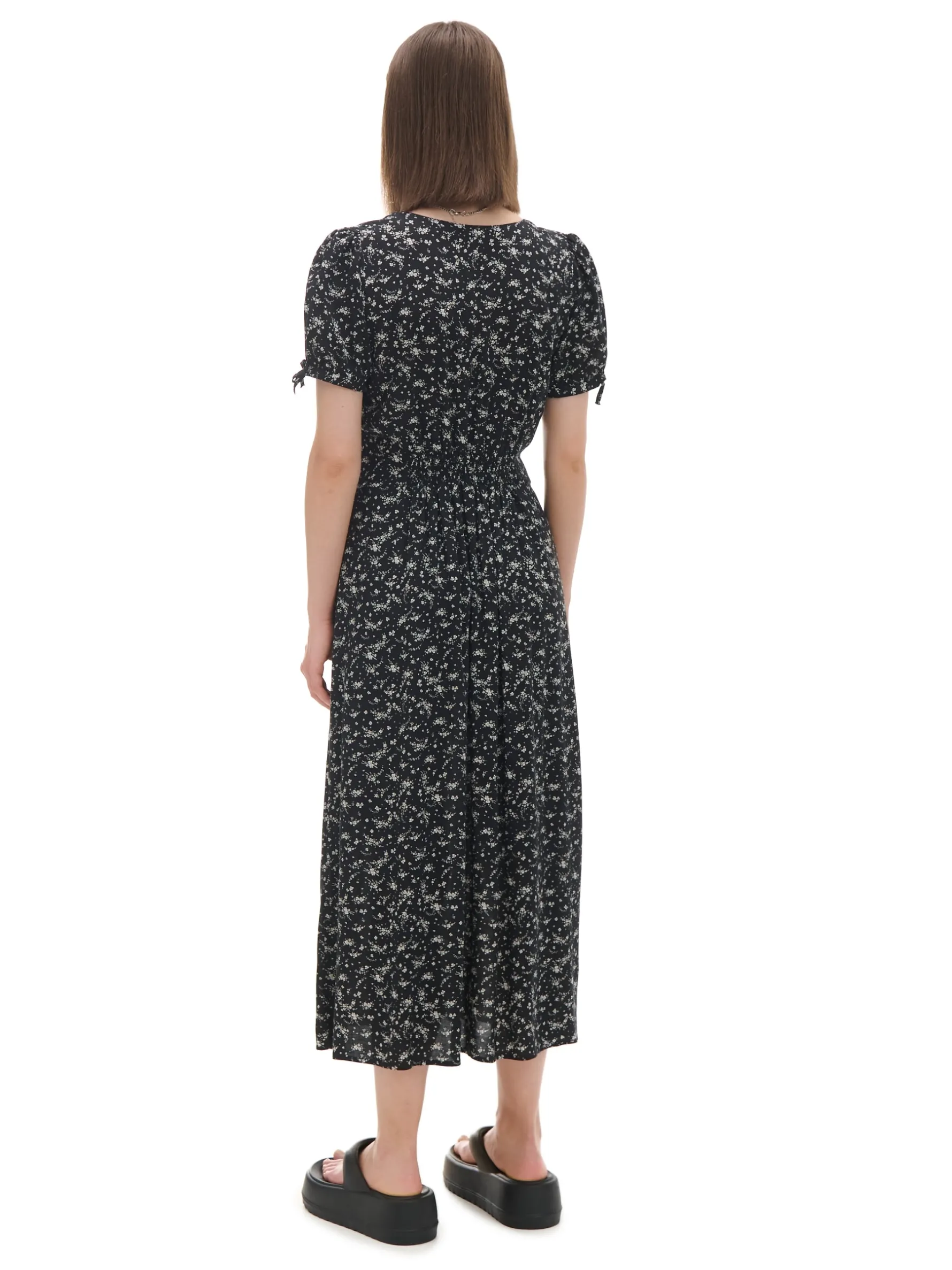 Sukienka damska o długości midi, uszyta z wiskozowej tkaniny. dekolt w kształcie litery V krótkie rękawy z ozdobnym wykończeniem zapięcie na guziki elastyczna gumka w pasie wzór w kwiaty na całości dostępne inne warianty kolorystyczne Wzrost modelki: 172 cm