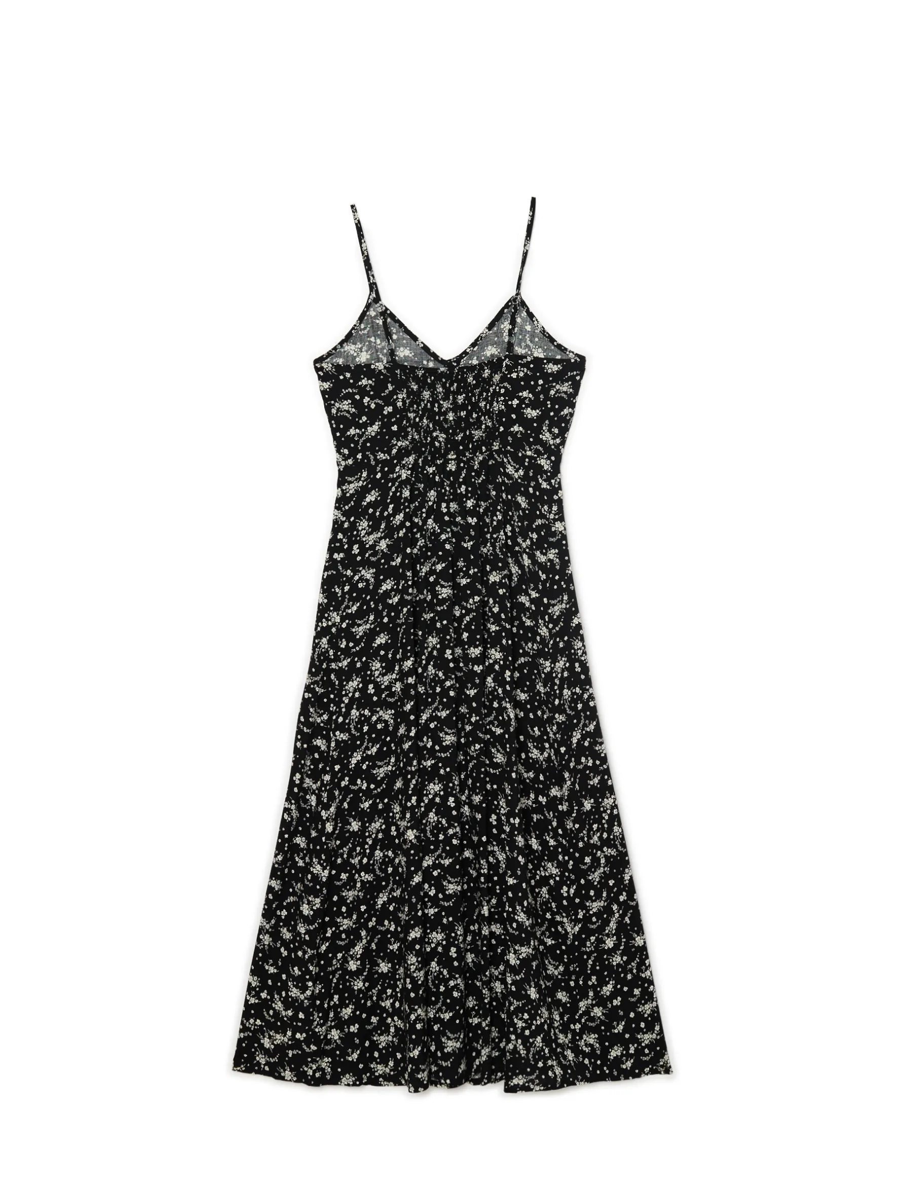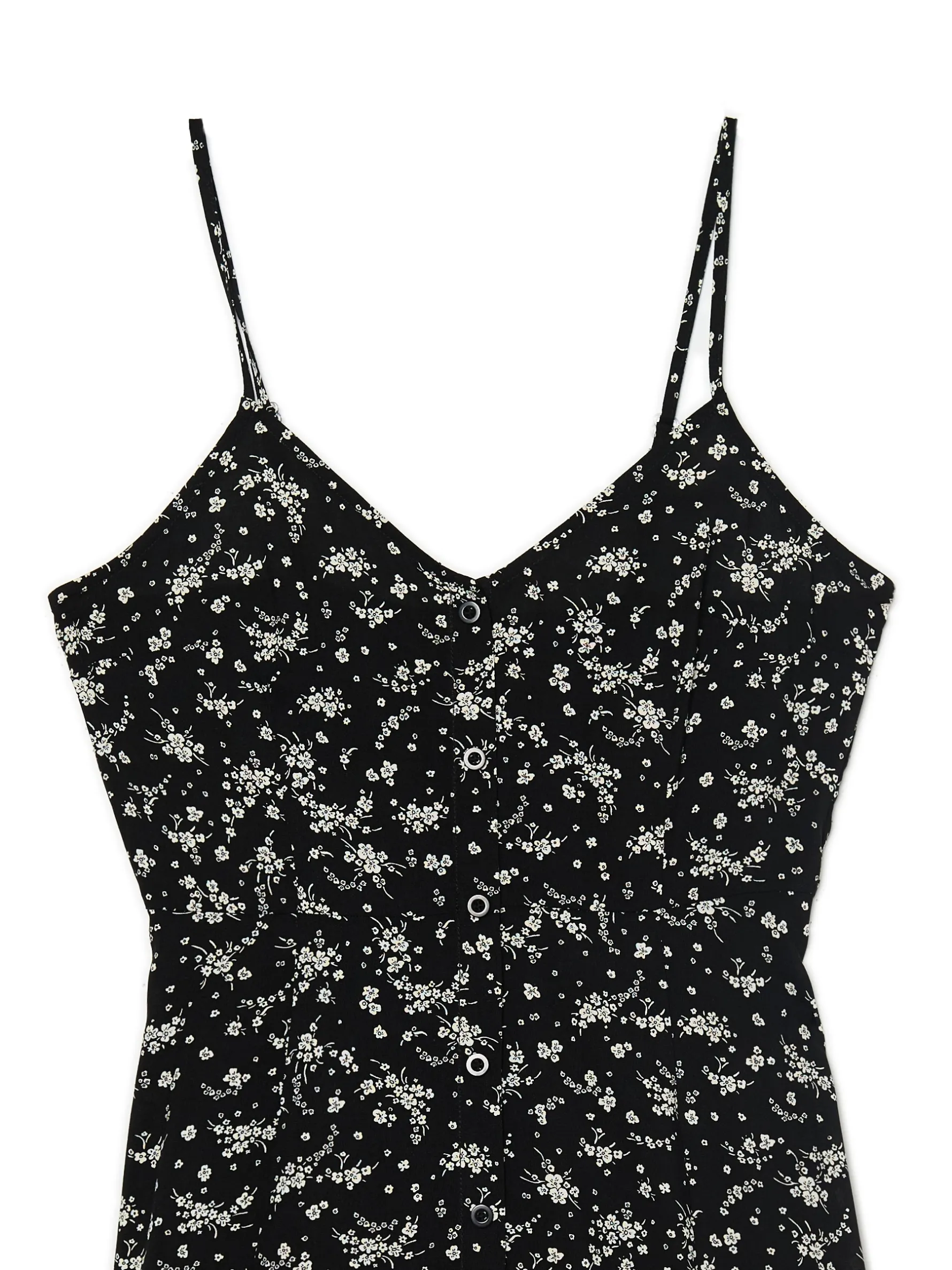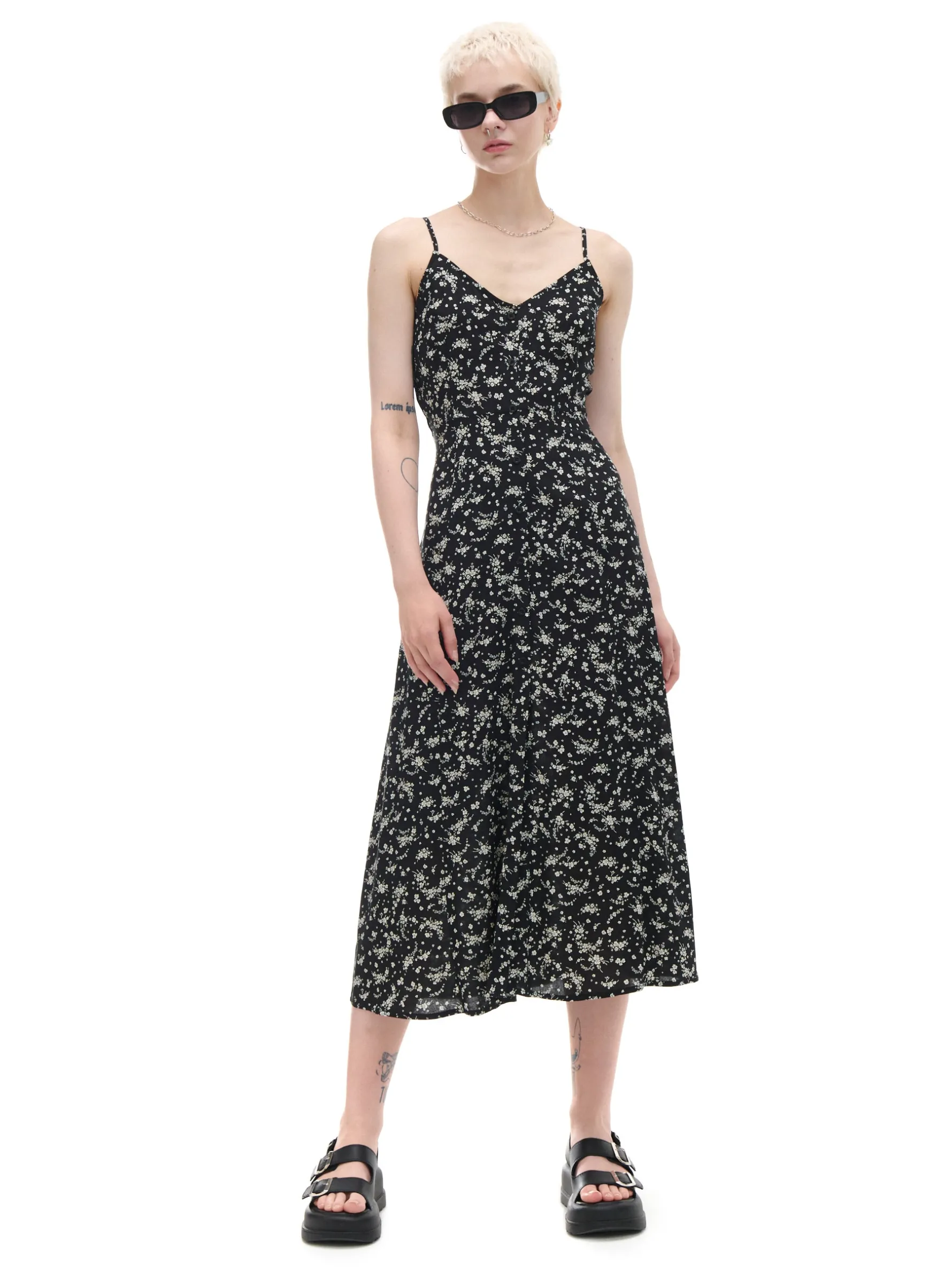 Delikatna, zwiewna sukienka o długości midi zapinana na guziki. Cienkie ramiączka i elastyczny fragment na plecach są idealnym rozwiązaniem na ciepłe dni! 100% wiskozy lekko rozkloszowany dół szeroka gumka w talii odcięcie w talii jednorzędowe zapięcie na guziki wąskie ramiączka z regulacją długości autorski, kwiatowy print na całości