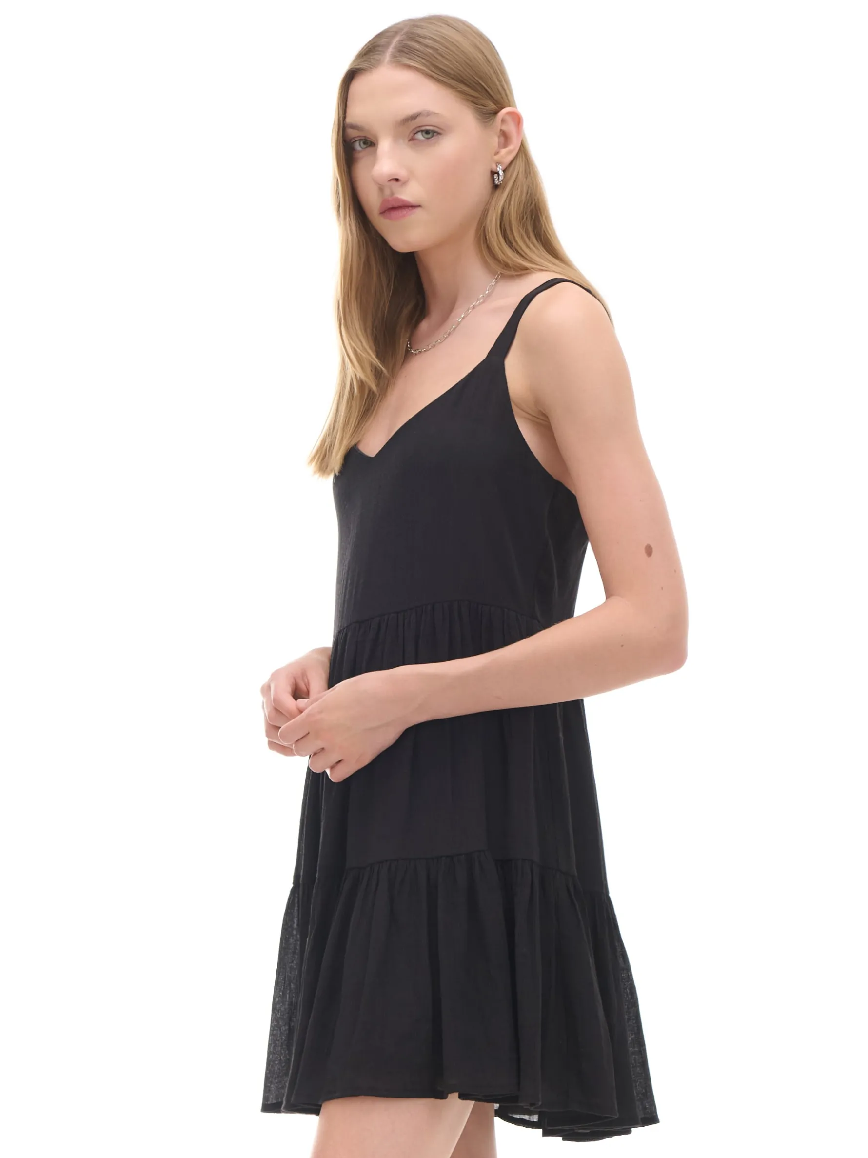 Krótka sukienka, uszyta z lekkiej tkaniny o bardzo wysokiej zawartości wiskozy. Idealna, by poczuć w niej summertime sadness. luźny, letni krój modna długość mini głęboki dekolt w kształcie litery V odcięcie pod biustem z elastyczną gumką cienkie ramiączka spódnica wykończona falbaną