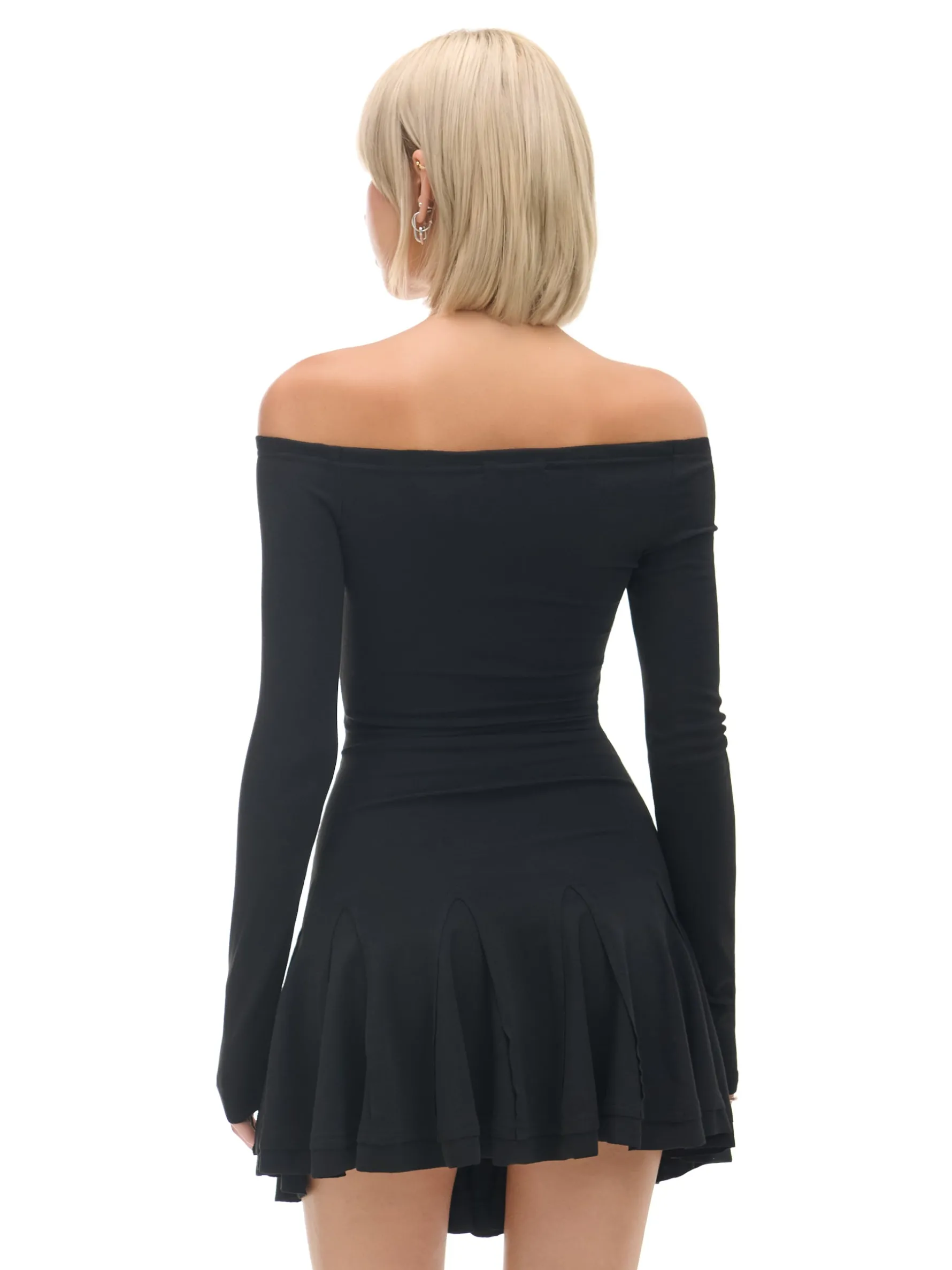 Krótka czarna sukienka, uszyta z lekkiej dzianiny zawierającej wiskozę. długość mini krój A dekolt typu łódka długie, proste rękawy marszczenia w talii plisowany dół surowe wykończenie brzegów Wzrost modelki: 177 cm