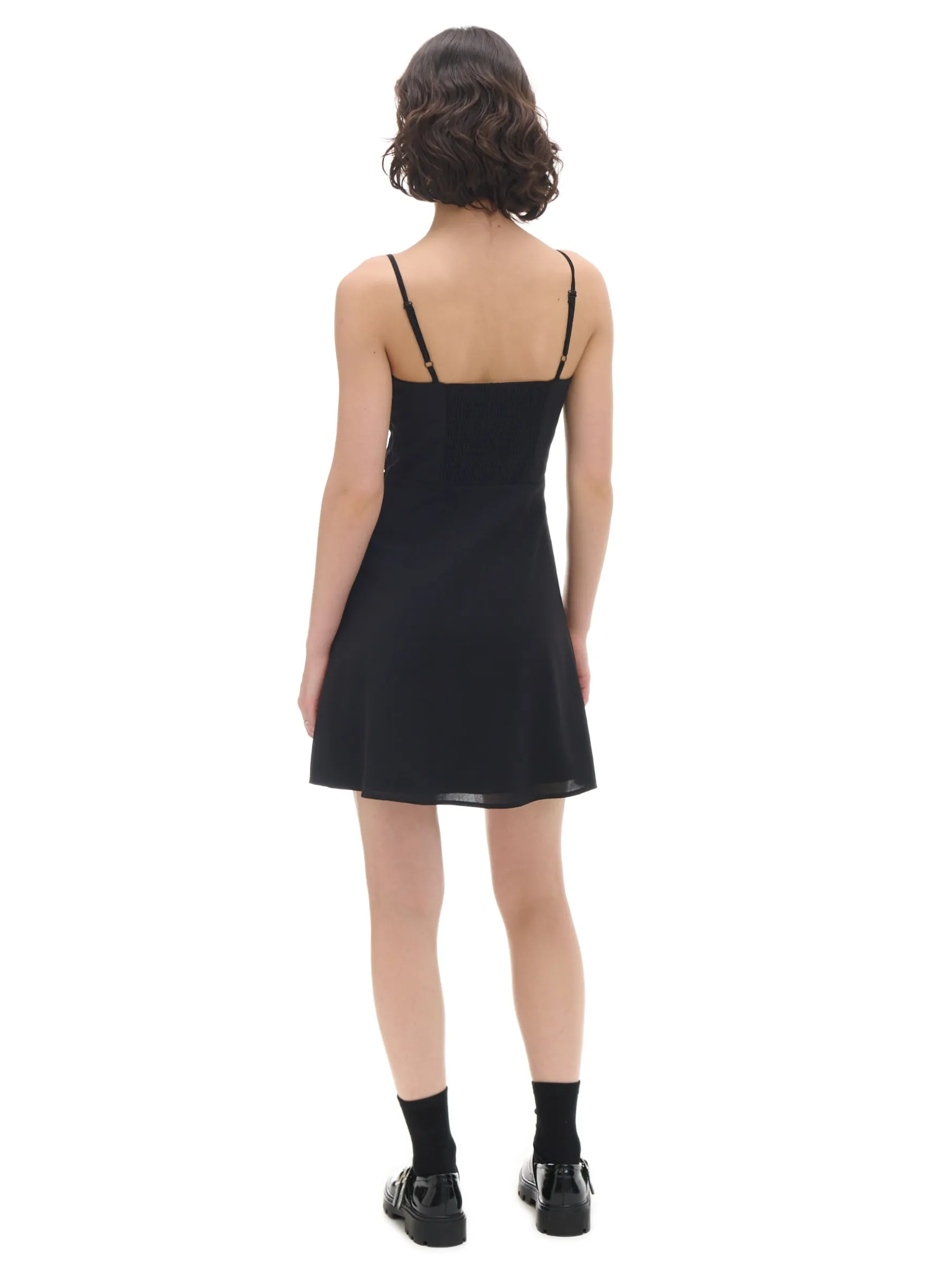 Lekka, zwiewna sukienka o długości mini. Idealna propozycja na lato! lekki materiał długość mini odcięcie w talii zapięcie na kryty zamek z boku dekolt w kształcie litery V elastyczna wstawka z tyłu wąskie ramiączka z regulacją długości z przodu ozdobne wiązanie Wzrost modelki: 172 cm