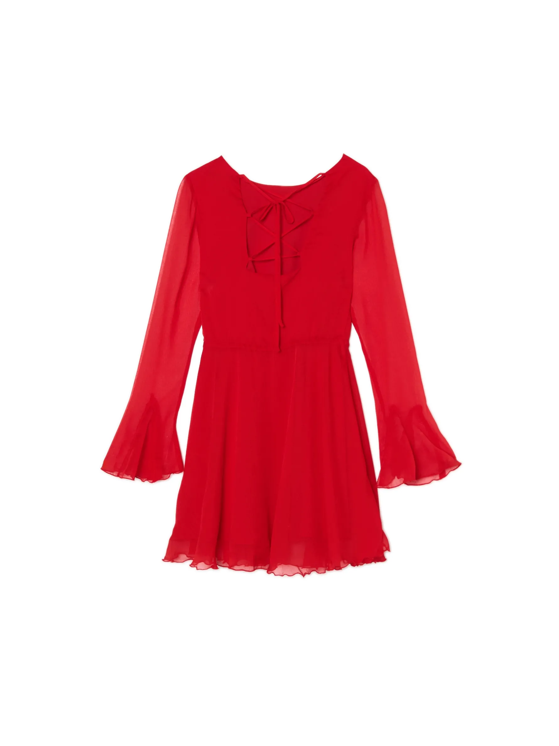Łap szyfonową damską sukienkę z delikatnymi falbanami na dole i przy rękawach. Ten wyrazisty czerwony kolor będzie wyglądał sztosowo podczas świątecznych meetingów z rodziną i nie tylko. uszyta z szyfonowej tkaniny długość mini i dopasowany krój lekko rozkloszowany dół odcięcie w talii zapięcie na kryty zamek z boku dekolt w łódkę rękawy z gumką i efektowną falbanką ozdobne wiązanie na plecach ozdobne marszczenia