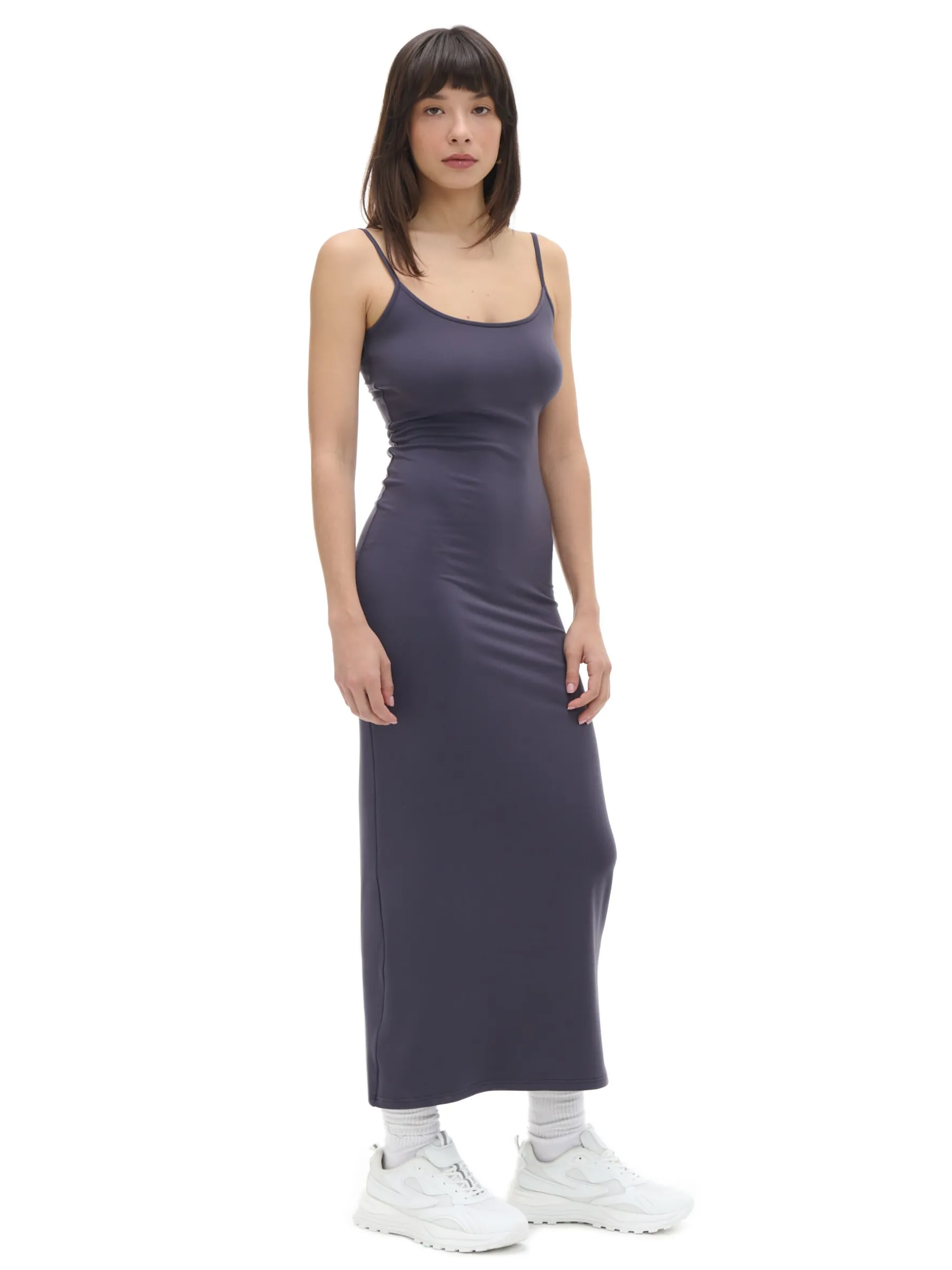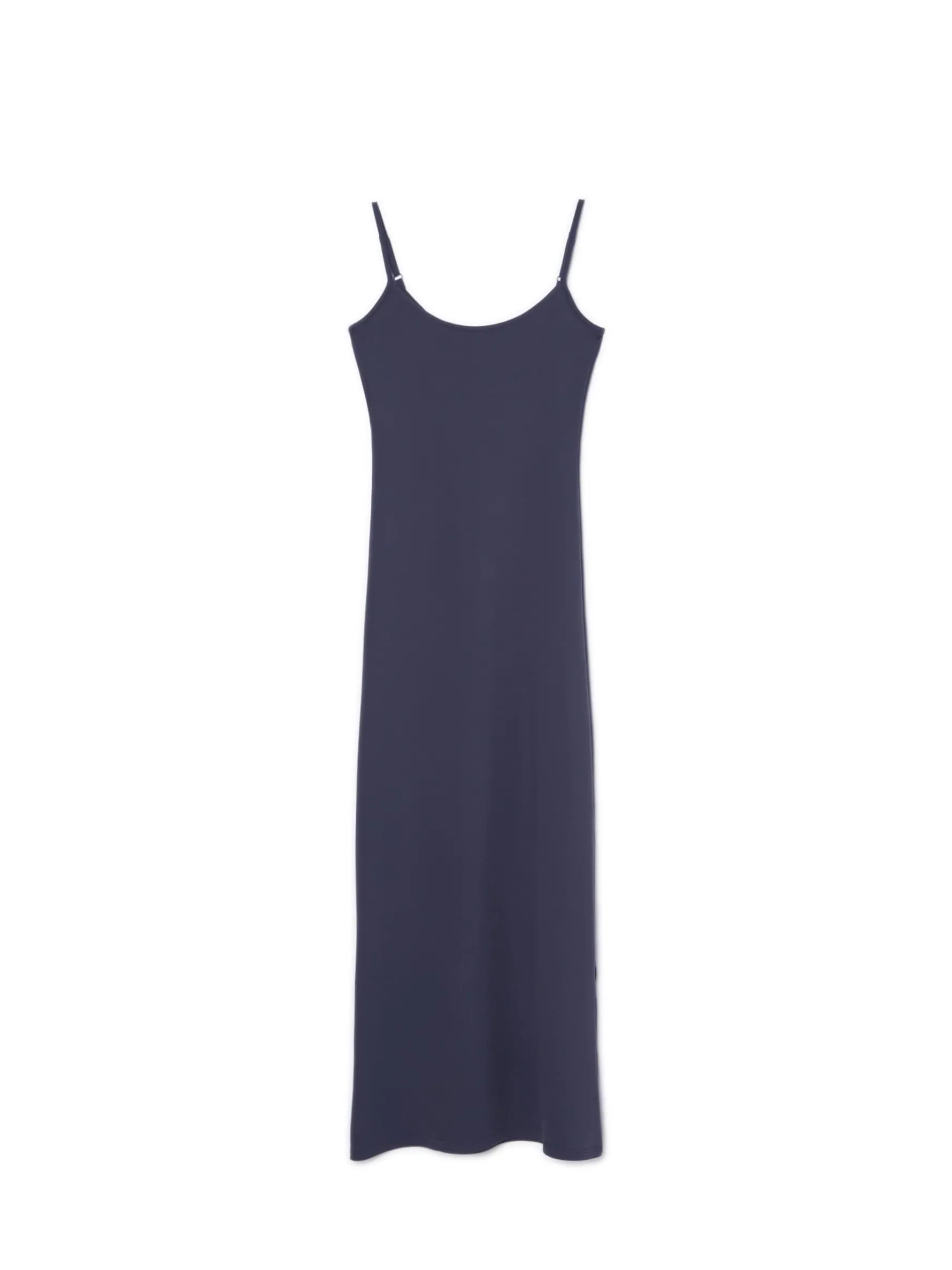 Długa sukienka, uszyta z granatowej dzianiny. dzianina z domieszką elastycznych włókien długość maxi dopasowany krój podkreślający sylwetkę okrągły dekolt wąskie ramiączka z regulacją długości